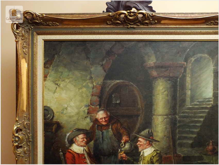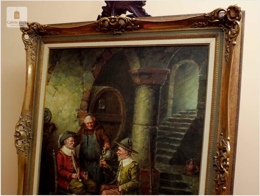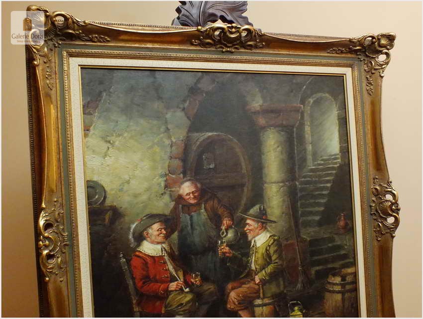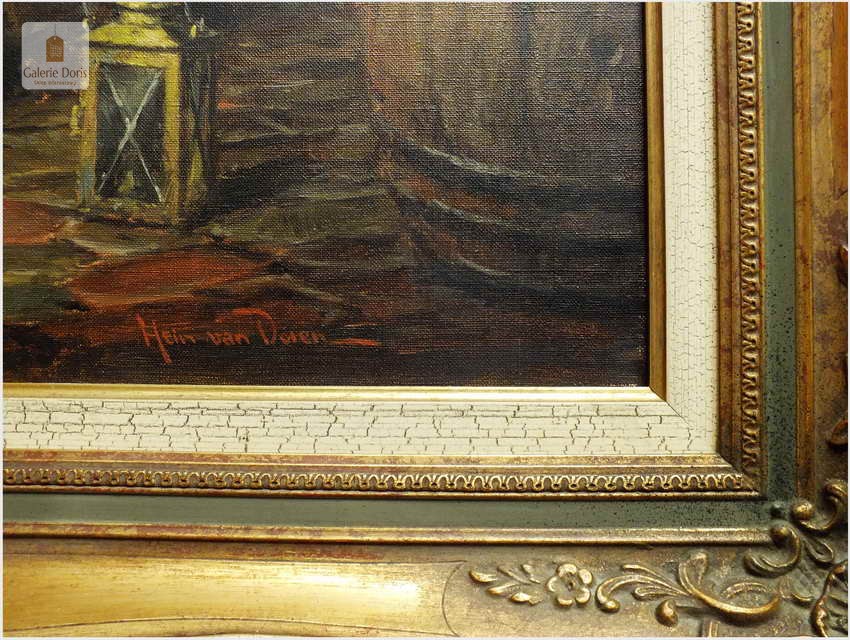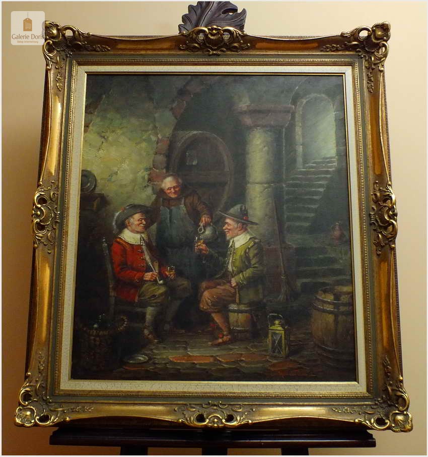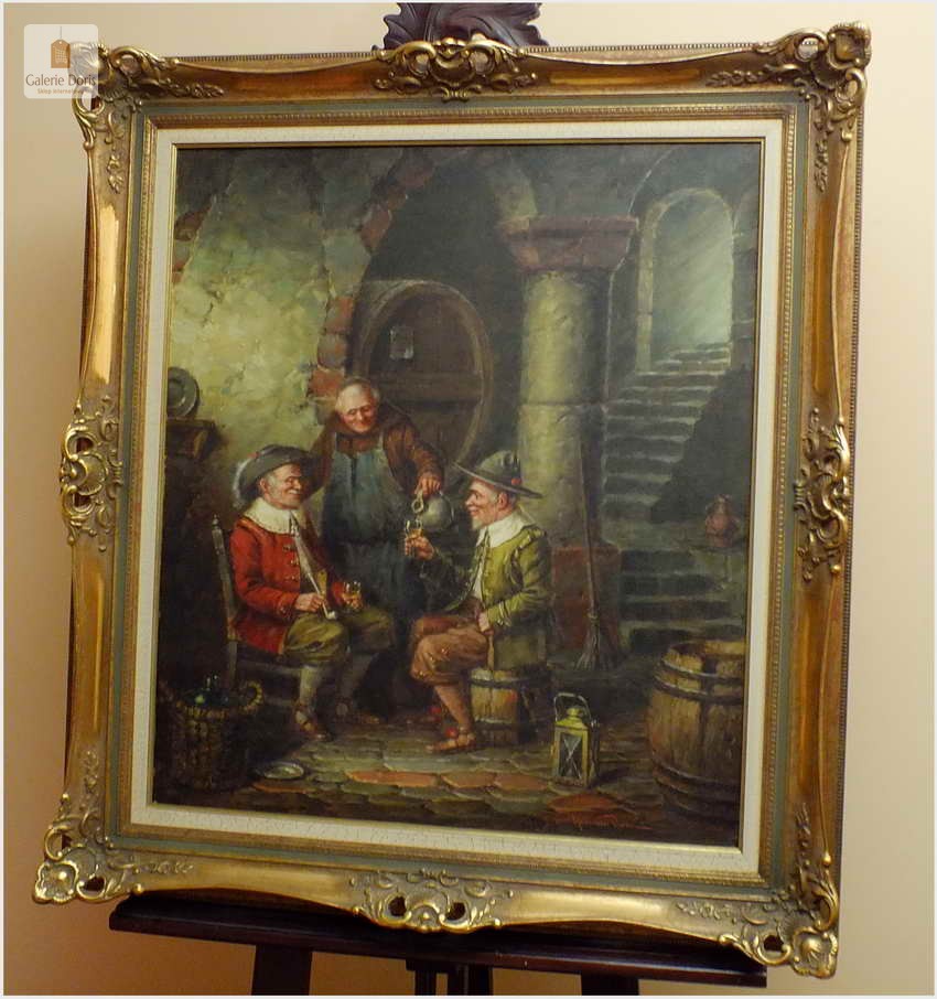 Polecam stary obraz olejny pędzla znanego malarza niemieckiego Hein Van Dorena. Zachwycająco oddał niesamowicie plastyczność malowanych postaci oraz ich otoczenia, podkreślona została finezyjnymi efektami światłocieniowymi a także wyśmienitą grą niuansów barwnych. Ten subtelnie malowany obraz cechuje znakomita technika malarska. Obraz bezpośrednio nawiązuje do dzieła XVII-wiecznego malarstwa. Oprawę malowidła stanowi przestrzenna, gruba rama wykonana z drewna. Złoconą ramę bogato dekorują kunsztowne sztukaterie. W rzeczywistości obraz jest jeszcze bardziej urzekający niż na załączonych poniżej zdjęciach. Stan płótna dobry, bez uszkodzeń - Obraz sygnowany jest w dolnym rogu. Do obrazu dołączamy numerowane hologramem zaświadczenie z Galerii.
