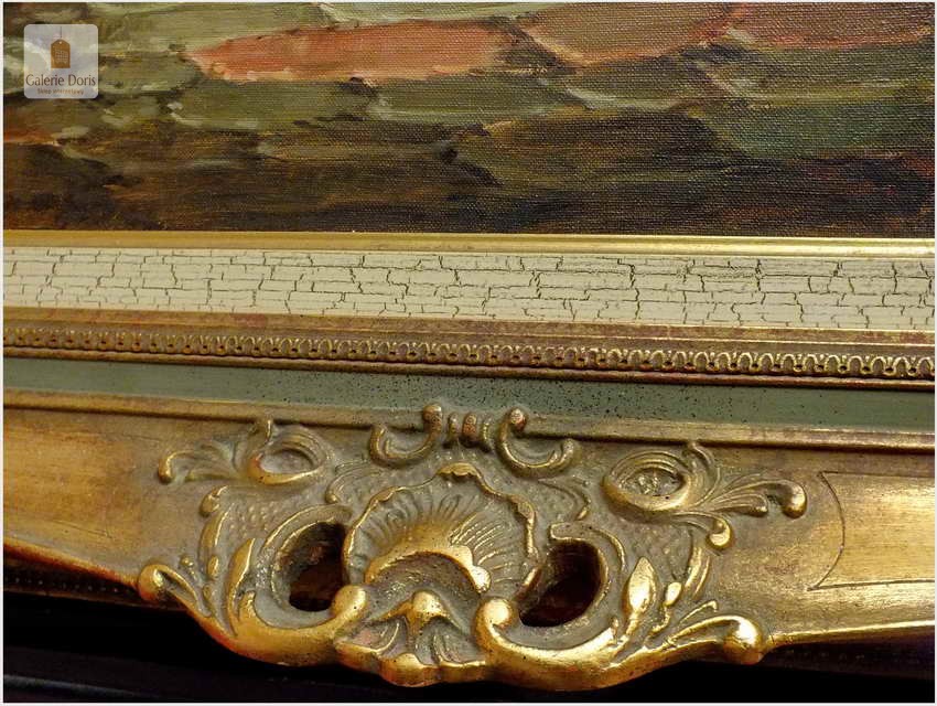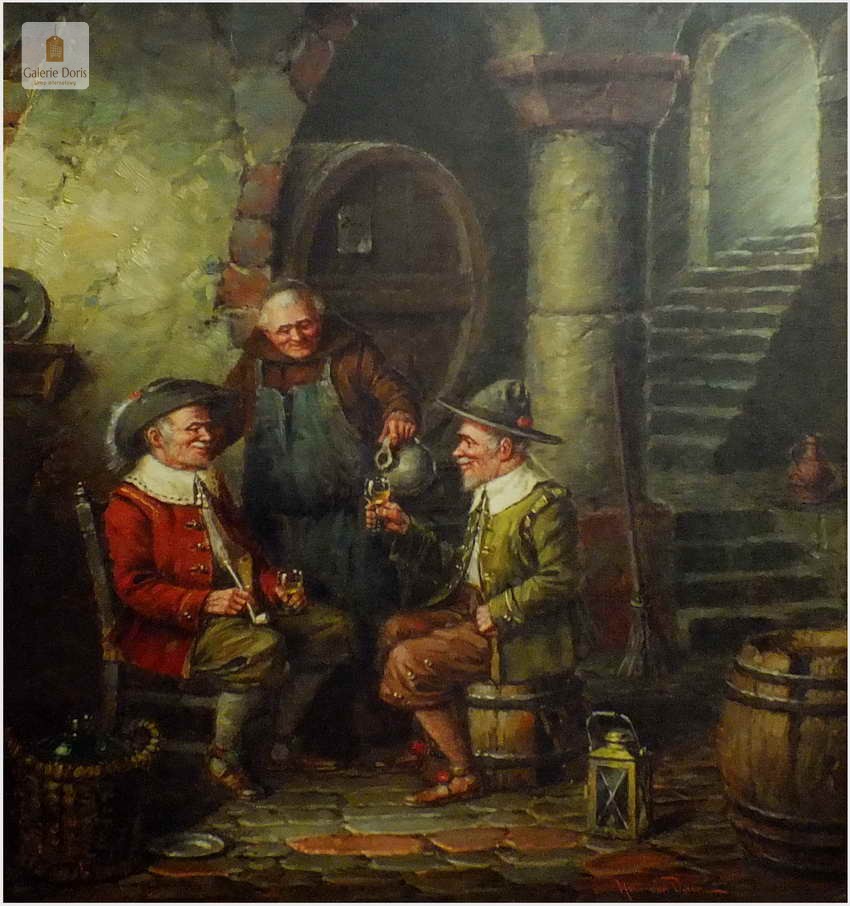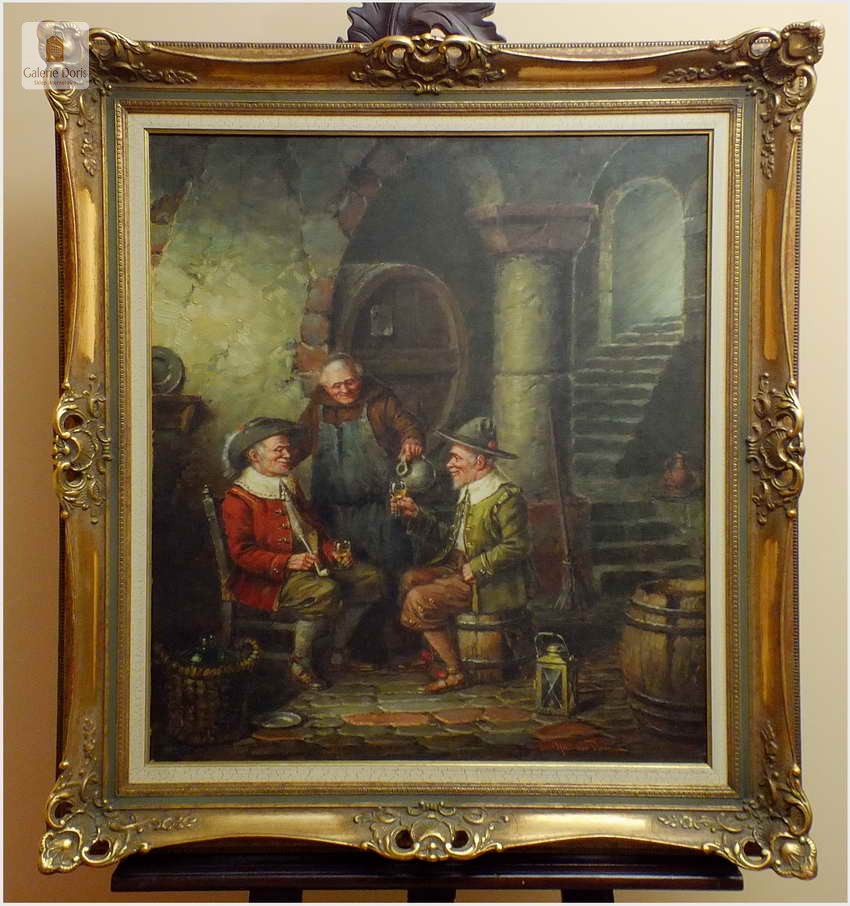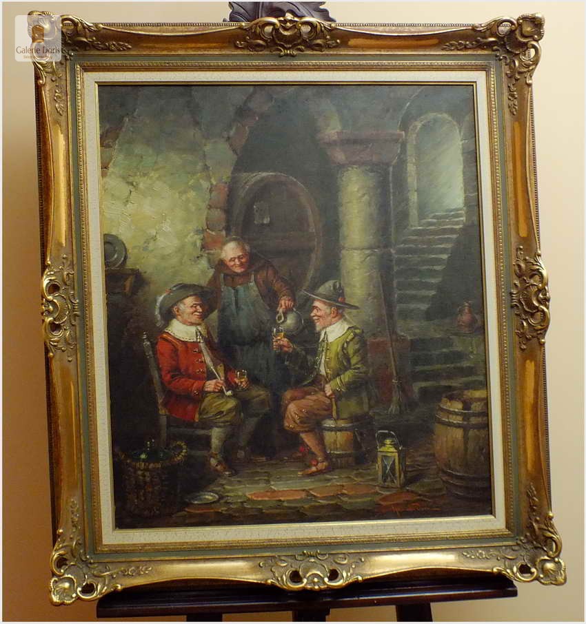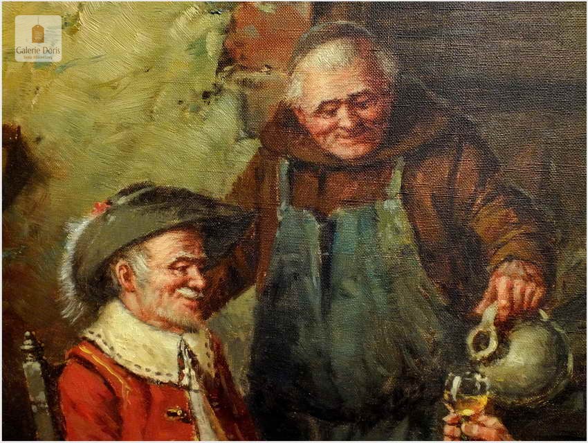 Polecam stary obraz olejny pędzla znanego malarza niemieckiego Hein Van Dorena. Zachwycająco oddał niesamowicie plastyczność malowanych postaci oraz ich otoczenia, podkreślona została finezyjnymi efektami światłocieniowymi a także wyśmienitą grą niuansów barwnych. Ten subtelnie malowany obraz cechuje znakomita technika malarska. Obraz bezpośrednio nawiązuje do dzieła XVII-wiecznego malarstwa. Oprawę malowidła stanowi przestrzenna, gruba rama wykonana z drewna. Złoconą ramę bogato dekorują kunsztowne sztukaterie. W rzeczywistości obraz jest jeszcze bardziej urzekający niż na załączonych poniżej zdjęciach. Stan płótna dobry, bez uszkodzeń - Obraz sygnowany jest w dolnym rogu. Do obrazu dołączamy numerowane hologramem zaświadczenie z Galerii.