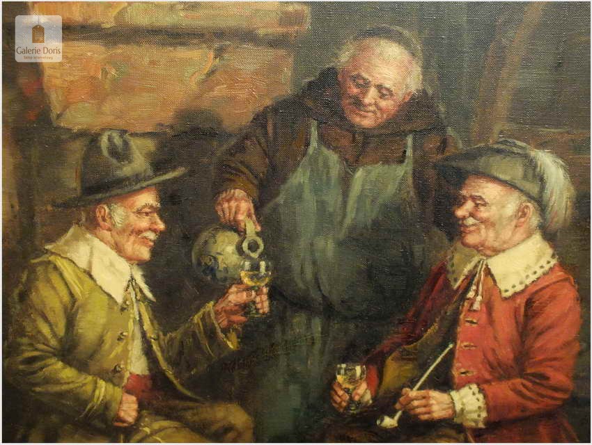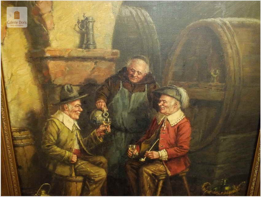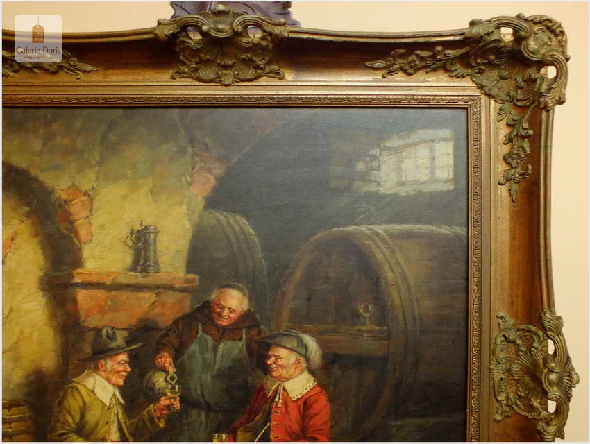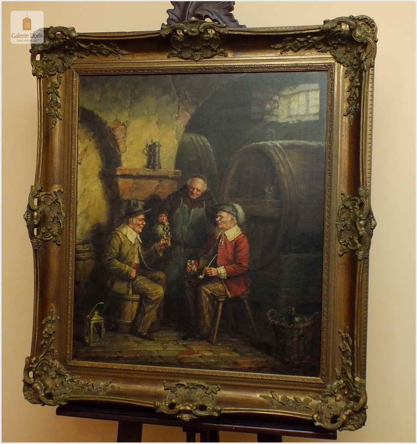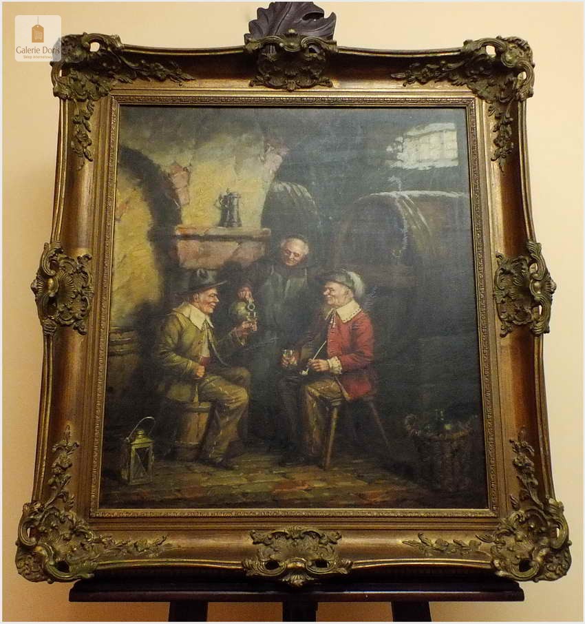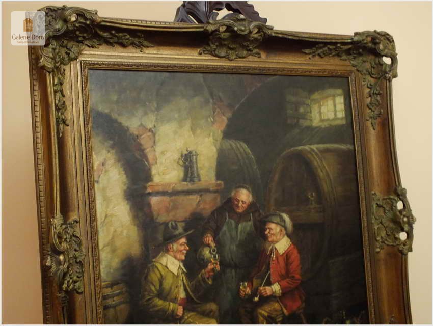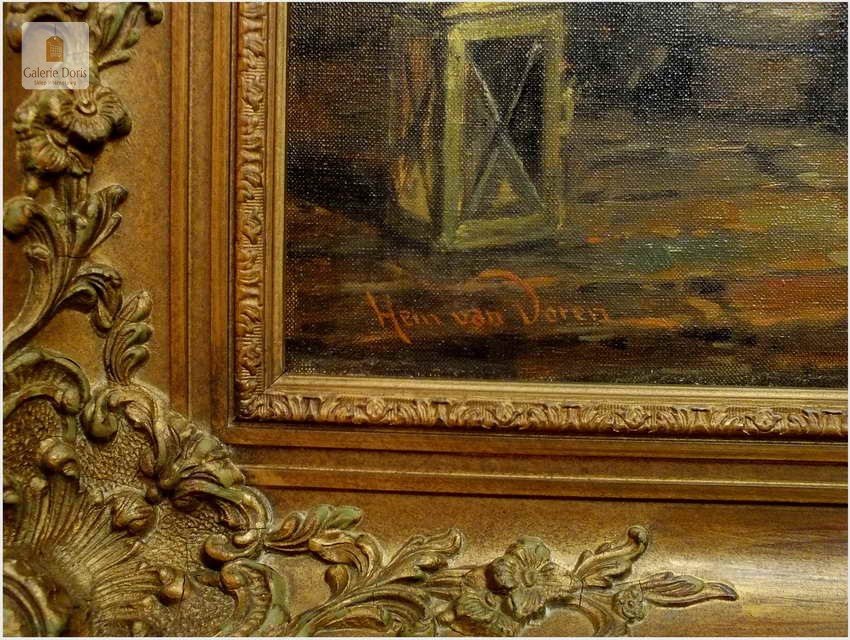 Polecam stary obraz olejny pędzla znanego malarza niemieckiego Hein Van Dorena. Zachwycająco oddał niesamowicie plastyczność malowanych postaci oraz ich otoczenia, podkreślona została finezyjnymi efektami światłocieniowymi a także wyśmienitą grą niuansów barwnych. Ten subtelnie malowany obraz cechuje znakomita technika malarska. Obraz bezpośrednio nawiązuje do dzieła XVII-wiecznego malarstwa. Oprawę malowidła stanowi przestrzenna, gruba rama wykonana z drewna. Złoconą ramę bogato dekorują kunsztowne sztukaterie. W rzeczywistości obraz jest jeszcze bardziej urzekający niż na załączonych poniżej zdjęciach. Stan płótna dobry, bez uszkodzeń - Obraz sygnowany jest w dolnym rogu. Do obrazu dołączamy numerowane hologramem zaświadczenie z Galerii.