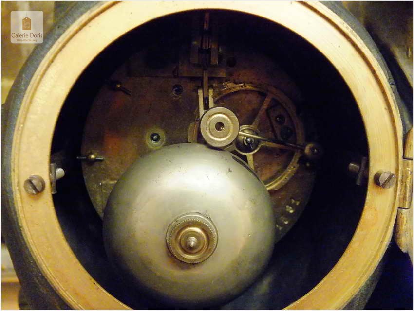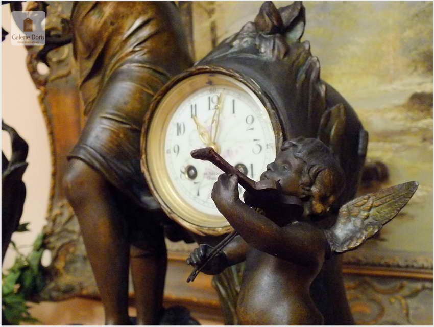 Przepiękny secesyjny pałacowy duży zegar z kandelabrami na pięć świec każdy. Ten monumentalny zegar datowany jest na około 1900 rok tj. w szczycie panowania Art Nouveau. Zegar bez uszkodzeń, sprawny na chodzie. Wahadło o tym samym numerze co mechanizm - Polecamy!