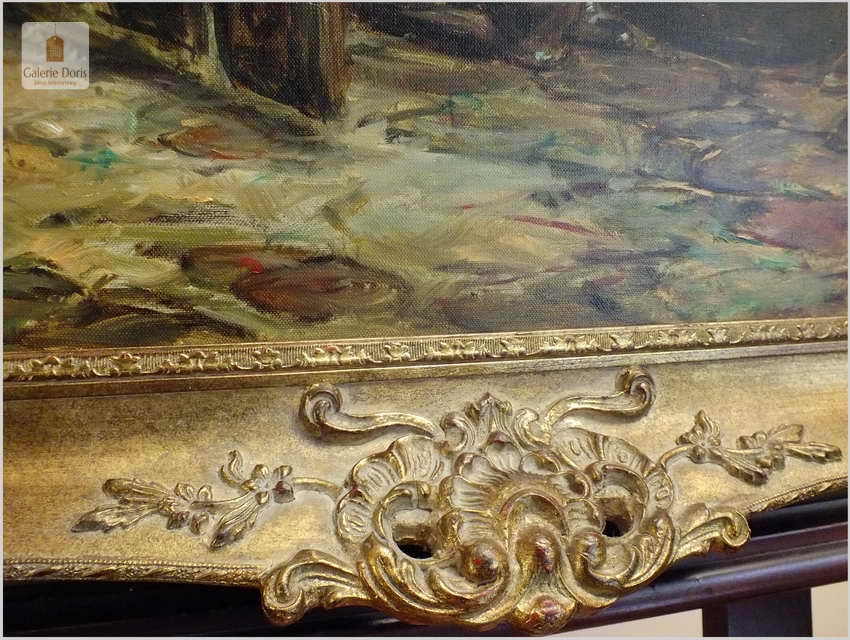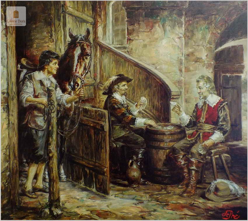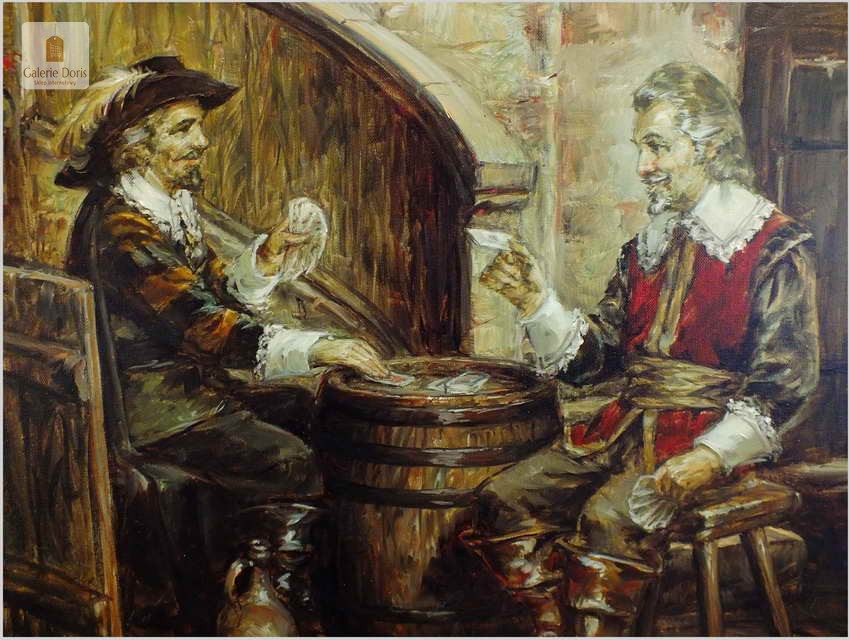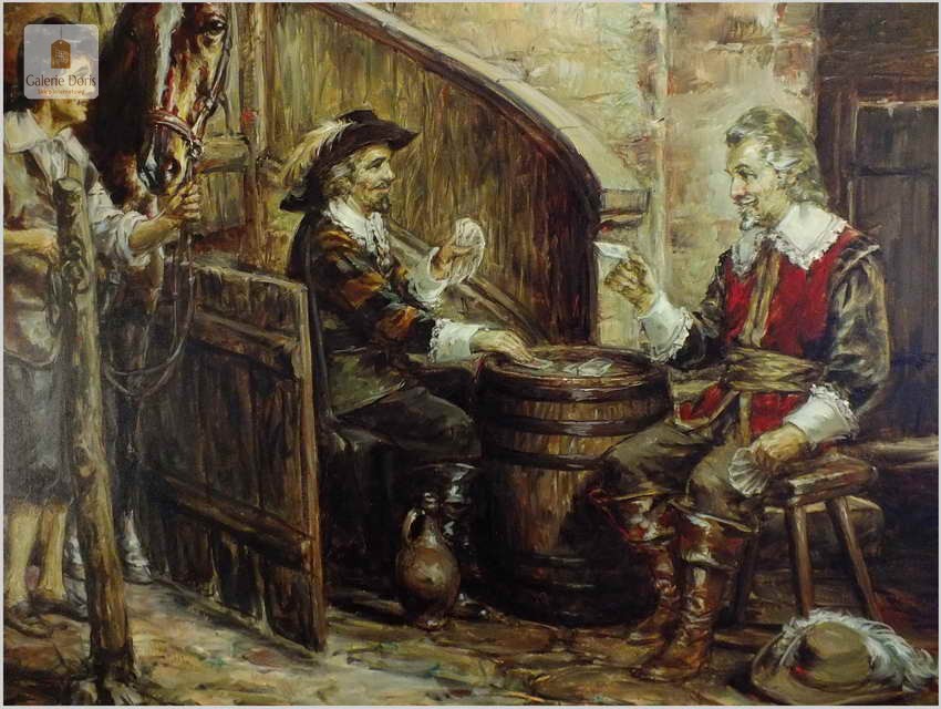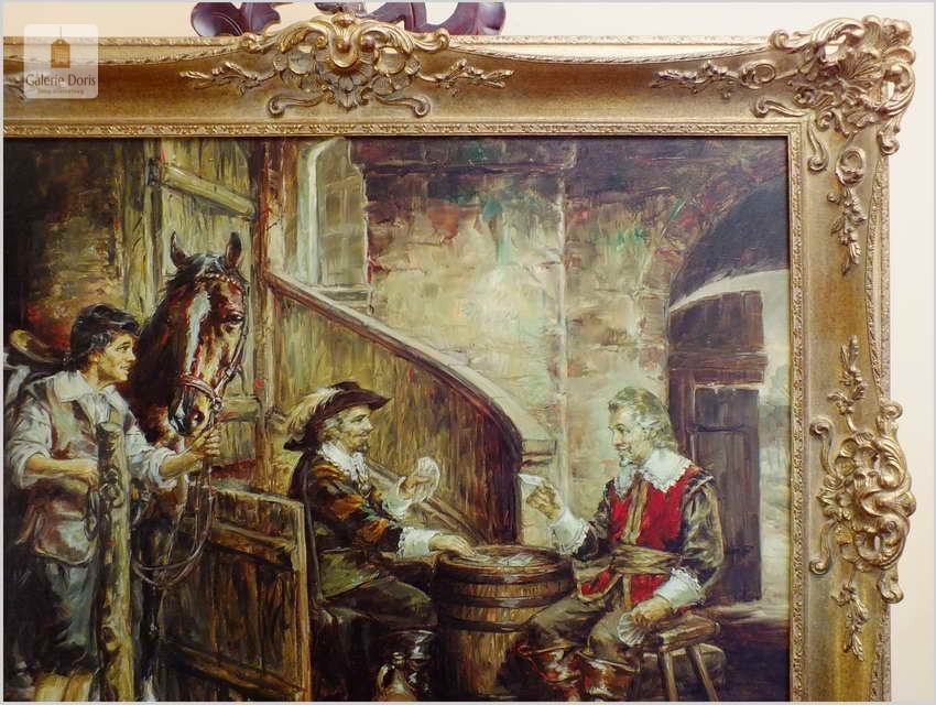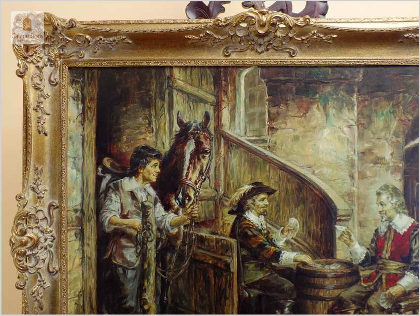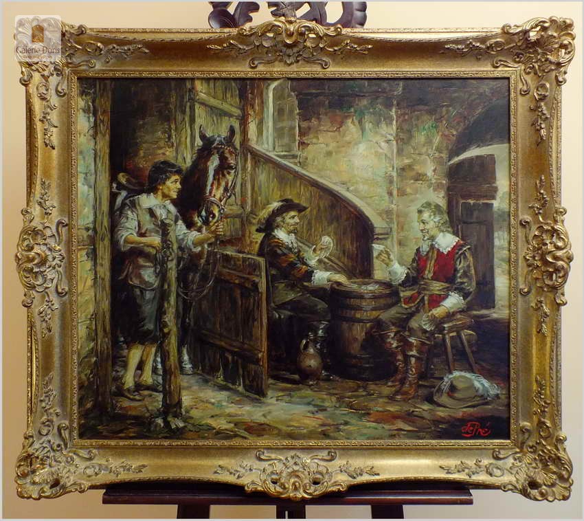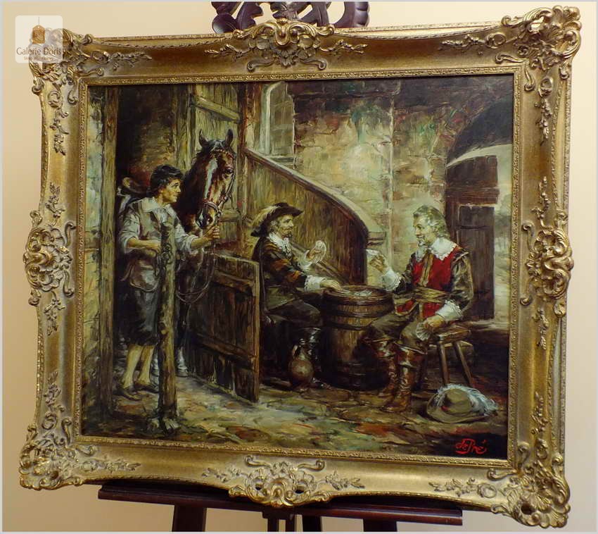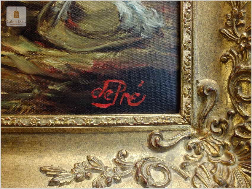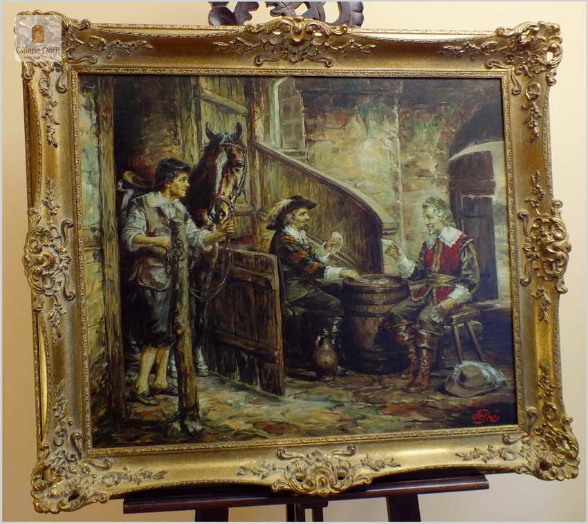 Polecamy stary obraz olejny pędzla znanego malarza niemieckiego Willi DePré. Zachwycająco oddał niesamowicie plastyczność malowanych postaci oraz ich otoczenia, całość podkreślona została finezyjnymi efektami światłocieniowymi a także wyśmienitą grą niuansów barwnych. Ten subtelnie malowany obraz cechuje znakomita technika malarska. Obraz bezpośrednio nawiązuje do dzieła XVII-wiecznego malarstwa. Oprawę malowidła stanowi przestrzenna, gruba rama wykonana z drewna. Złoconą ramę bogato dekorują kunsztowne sztukaterie. Obraz sygnowany jest w prawym dolnym rogu ramy. Gwarantujemy profesjonalnie zabezpieczoną przesyłkę kurierem.