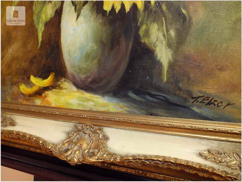 Kunst des 20.Jh.,Malereien,Öl Autor: T. Elzer Polecamy niezwykle piękny dekoracyjny obraz olejny malowany na płótnie. Jest to typowa praca dla malarza z rozwibrowanym tłem. Struktura farby wyraźnie wyczuwalna pod palcami. Obraz oprawiony jest w przestrzenną, grubą ramę wykonaną z drewna. Całość jest sygnowana w prawym dolnym rogu ramy. Obraz malowany na grubym płótnie malarskim.