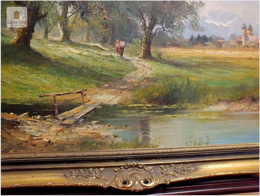 Wspaniale oddano partię nieba oraz rozległy widok na horyzont i otaczające go góry. Soczysta zieleń majestatycznej roślinności kontrastuje z pastelami nieba , bardzo nastrojowa kompozycja. Ten relaksujący duży pejzaż odznacza się delikatnie prowadzonymi liniami pędzla i wysmakowaną grą barw. Cechuje go świetna technika malarska. Powierzchnię obrazu pokrywa warstwa satynowego werniksu. Obraz oprawiony jest w przestrzenną, grubą ramę wykonaną z drewna. Złoconą ramę ozdabiają misterne sztukaterie. Stan obrazu oraz ramy w stanie idealnym.