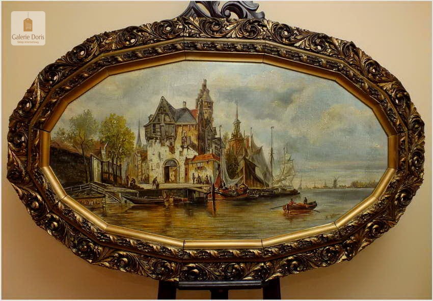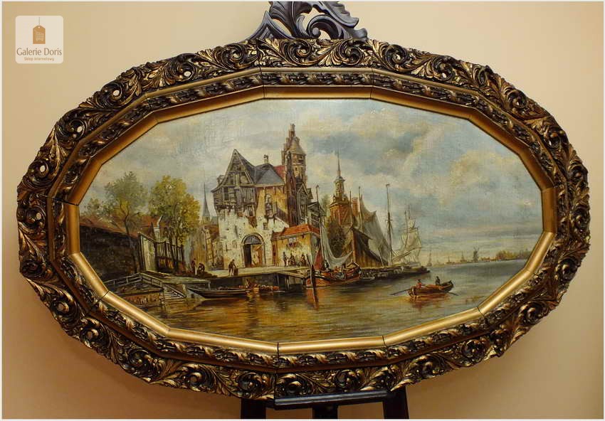 Ciekawa niespotykana propozycja malarstwa marynistycznego w owalu. Stary obraz olejny na płótnie. Dobra perspektywa z połączeniem doborowej palety kolorystycznej z pewnością przypadnie oferowany obraz najbardziej wybrednym gustom, Polecamy!