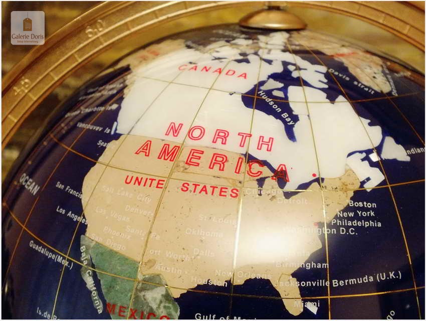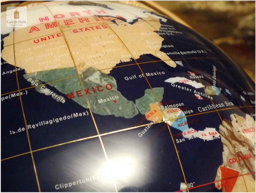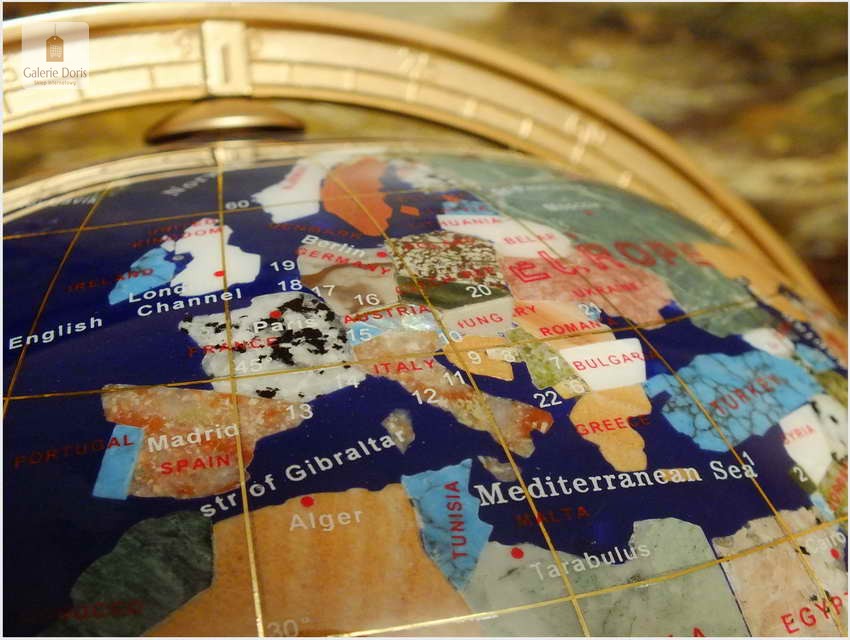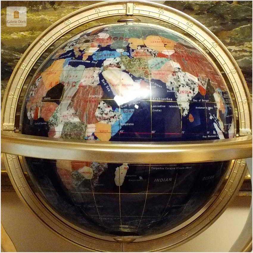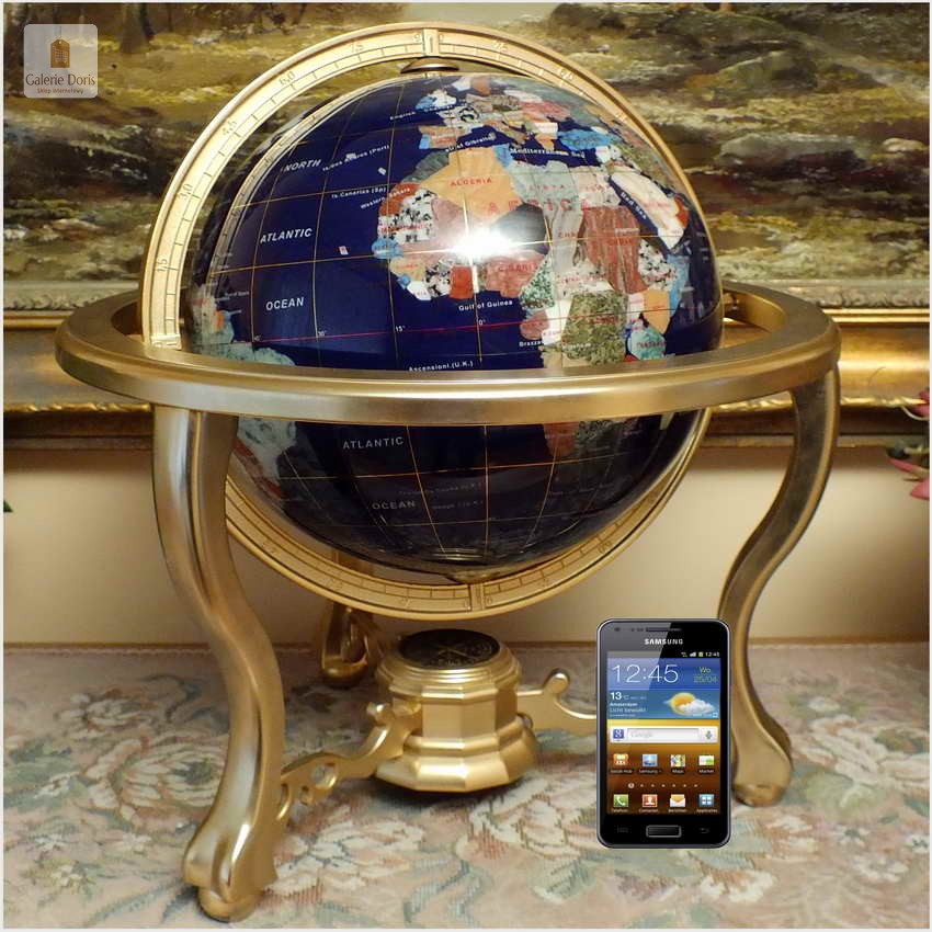 Zapraszam do kupienia pięknego ekskluzywnego globusa. Podstawa i stelaż bardzo stabilna. W dolnej części stelaża osadzono kompas. Zarysy kontynentów, wysp i państw na globusie to kamienie półszlachetne i masa perłowa układana ręcznie, dlatego każdy globus jest inny. Całość pokryta przezroczystą powłoką. Przedmiot fantastycznie się prezentuje i doskonale nadaje się na nietuzinkowy prezent.