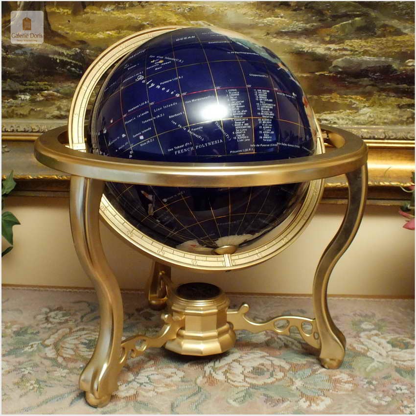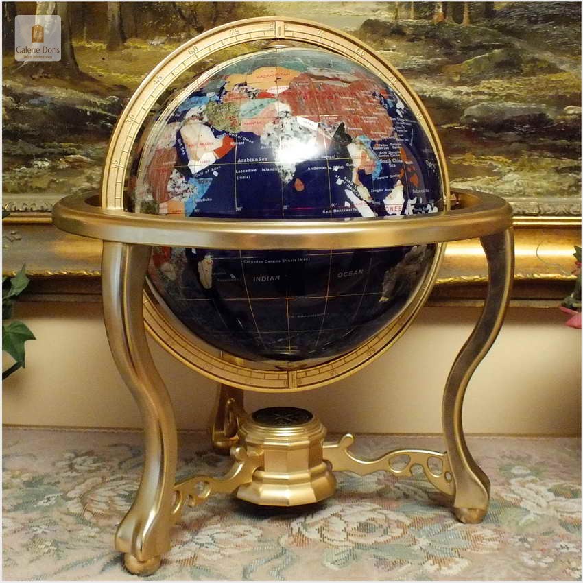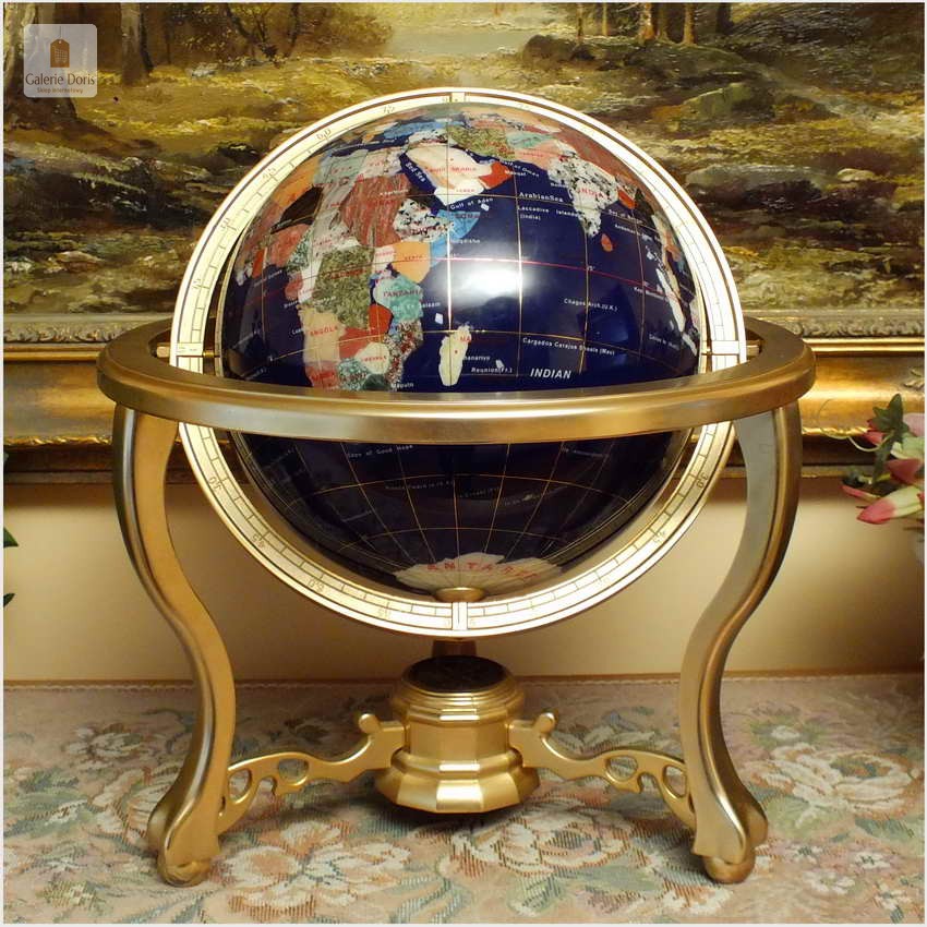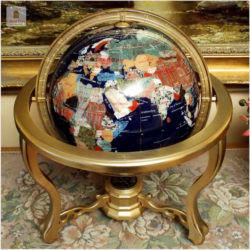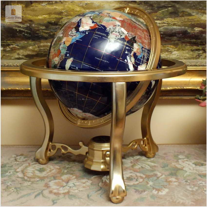 Doskonale prezentuje się w bibliotece lub biurze, apartamencie, gabinecie, salonie, itp.  Ekskluzywny przedmiot, który pasuje do każdego rodzaju wnętrza. Globus na trzech nogach złocony 24-karatowym złotem. Wykonany z kamieni półszlachetnych, między innymi: malachit, jaspis, bawole oko, agat, kwarc różowy, rodonit, sokole oko, fluoryt i wiele innych.