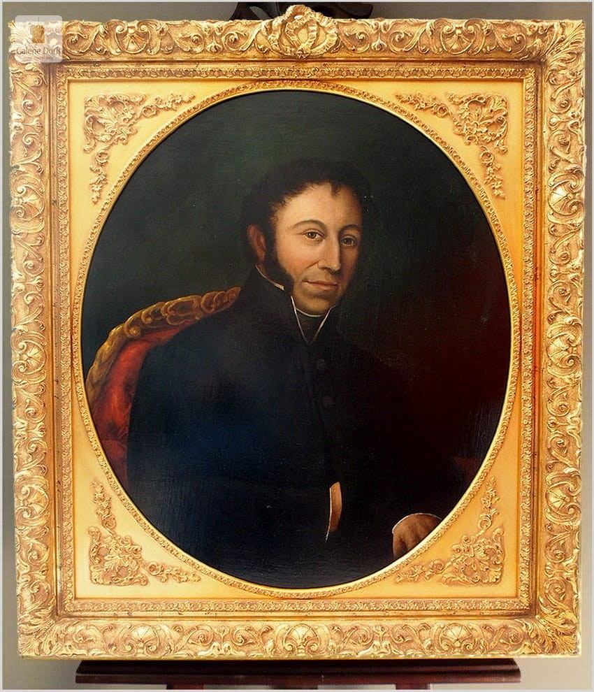 Biedermeier zrodził się w czasach kongresu wiedeńskiego (1815r.) i wygasł po Wiośnie Ludów (1848-49r.). Łączył cechy klasycyzmu i romantyzmu, zapowiadając jednocześnie realizm trzeciej ćwierci wieku. Biedermeier to styl stworzony w kręgach mieszczańskich. W pełni wypowiedział się w meblarstwie i sztukach użytkowych. Przeciwstawiony wyszukanej sztuce arystokracji, miał uosabiać dążenie do wygodnego życia bez blichtru, skoncentrowanie się na kręgu rodzinnym, przywiązanie do tradycji. Meble okresu Biedermeieru, odznaczające się dużą rozmaitością form i pięknymi intarsjami oraz dobrym wykonaniem technicznym. W Niemczech i Austrii empire współistniał ze stylem Biedermeier.  Obraz na płótnie dublowany na sklejce. Polecamy do kompletu drugi obraz, portret kobiety. Obraz stanowiący komplet znajdziesz go na aukcji sąsiedniej. Para Portretów od razu gotowa do wstawienia w domu. Polecamy!