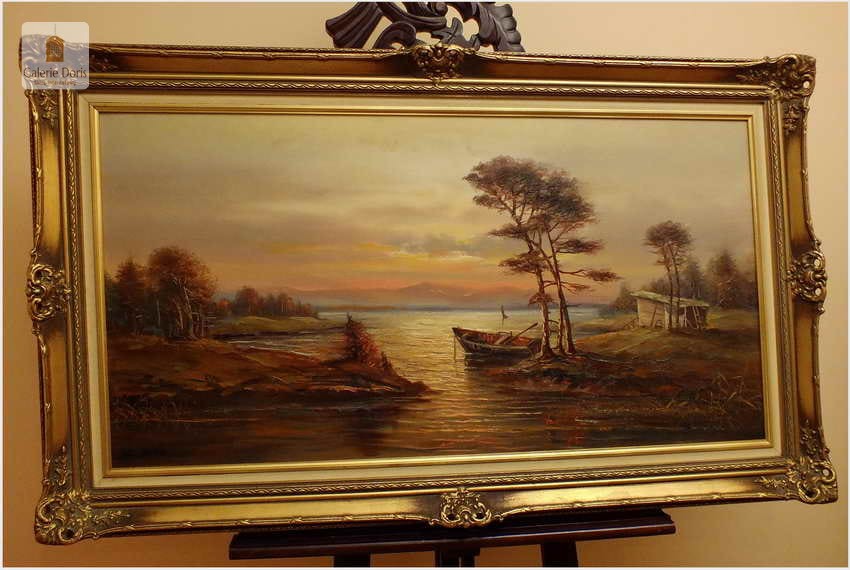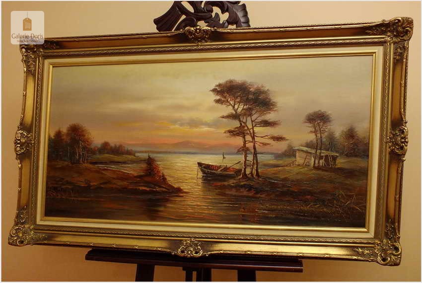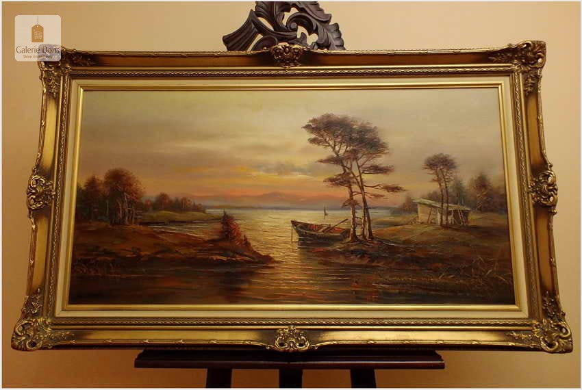 Przedstawiamy duży obraz olejny. Po zmroku i zapaleniu światła w pomieszczeniu, wydobywa się z płótna głębia tworząc piękne światłocieniowe impasty. Obraz urzeka szczególną dekoracyjnością, bardzo dobrą kompozycją, łagodnym nastrojem . Obraz malowany farbami olejnymi na płótnie, struktura nałożonej farby mocno wyczuwalna jest pod palcami.  Dzieło polecamy koneserom cennego i dobrego malarstwa pejzażowego.