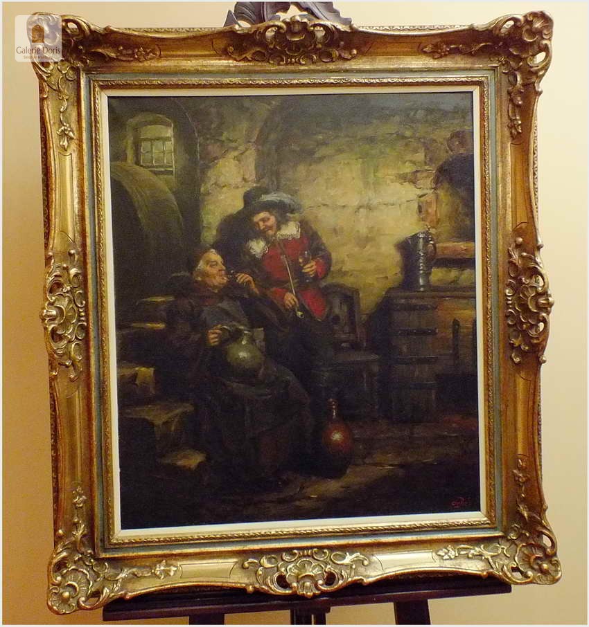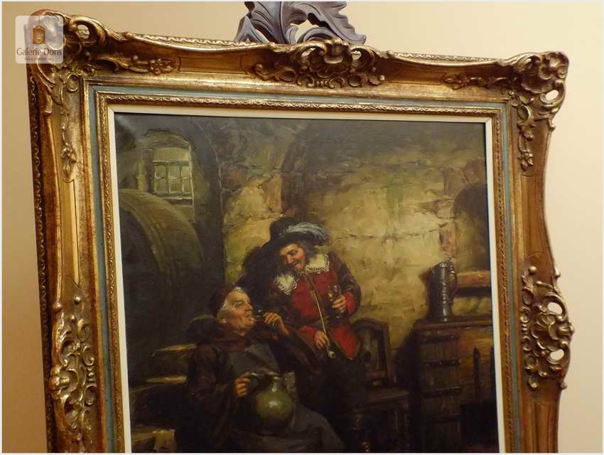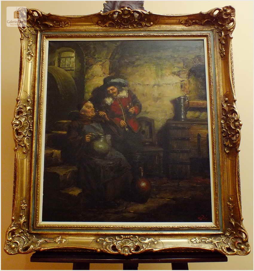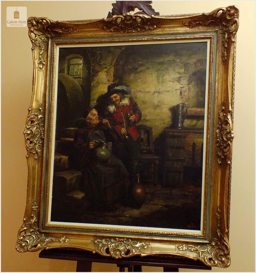 Polecamy stary obraz olejny pędzla znanego malarza niemieckiego Willi DePré. Zachwycająco oddał niesamowicie plastyczność malowanych postaci oraz ich otoczenia, całość podkreślona została finezyjnymi efektami światłocieniowymi a także wyśmienitą grą niuansów barwnych. Ten subtelnie malowany obraz cechuje znakomita technika malarska. Obraz bezpośrednio nawiązuje do dzieła XVII-wiecznego malarstwa. Oprawę malowidła stanowi przestrzenna, gruba rama wykonana z drewna. Złoconą ramę bogato dekorują kunsztowne sztukaterie. Obraz sygnowany jest w prawym dolnym rogu ramy. Gwarantujemy profesjonalnie zabezpieczoną przesyłkę kurierem.