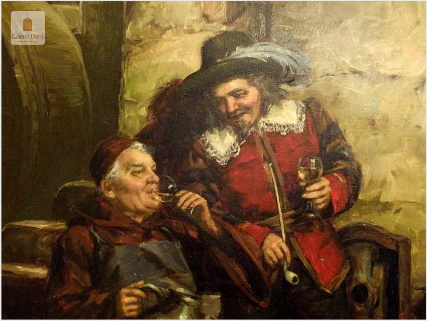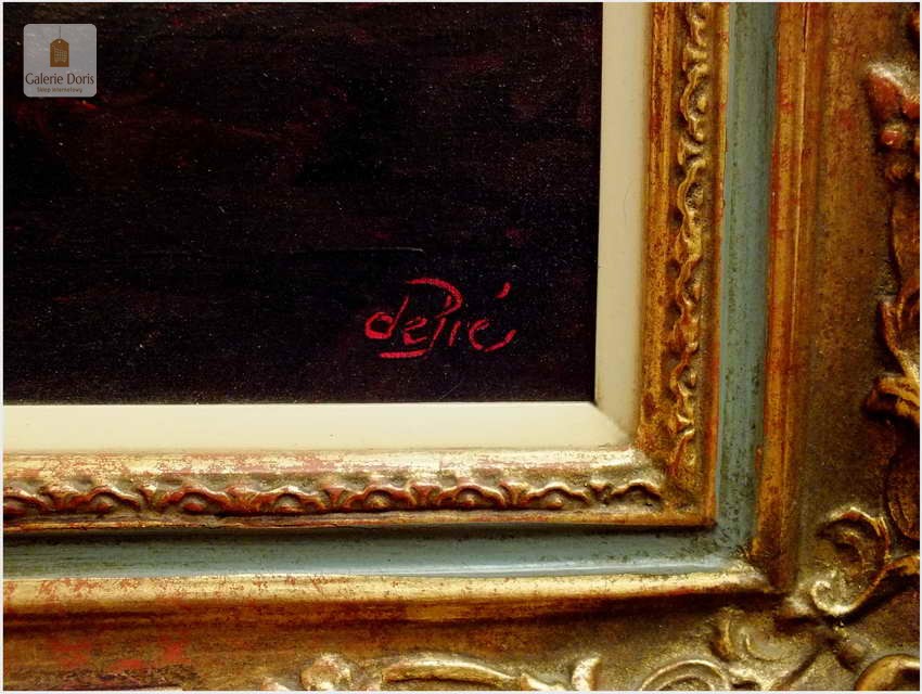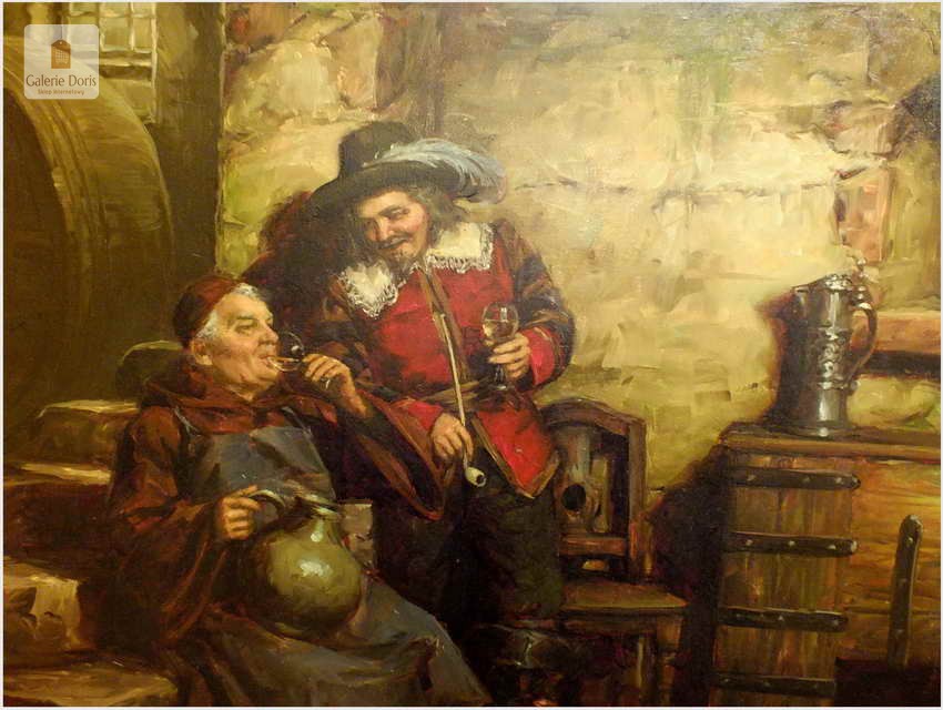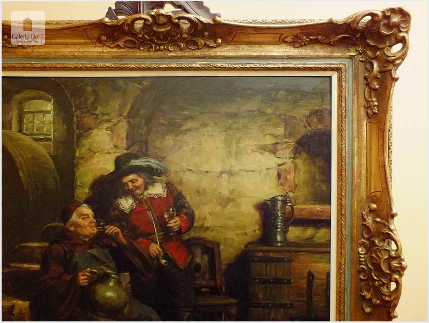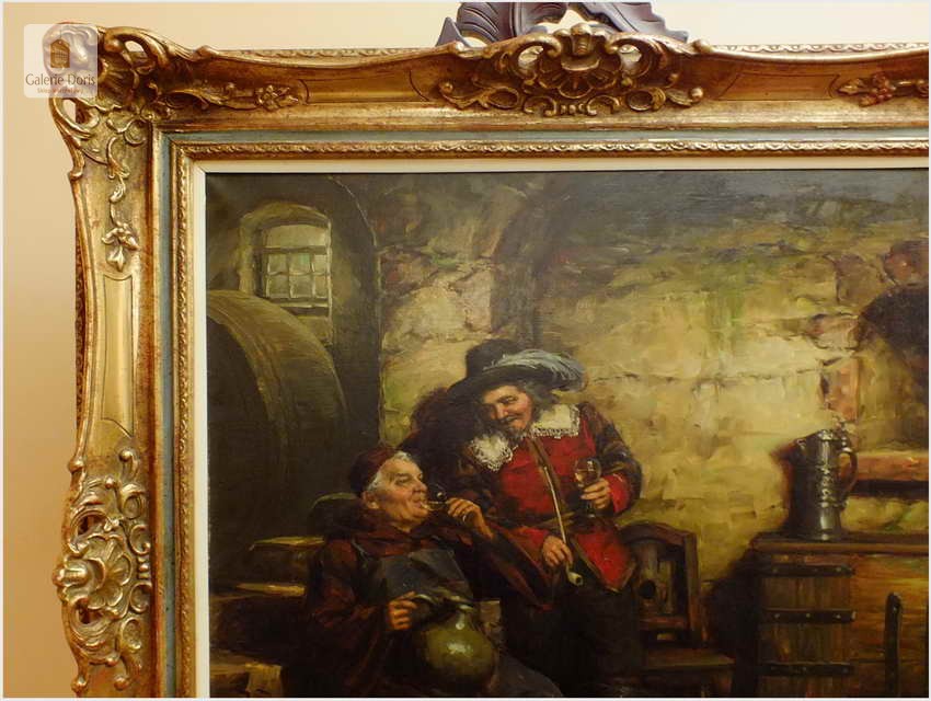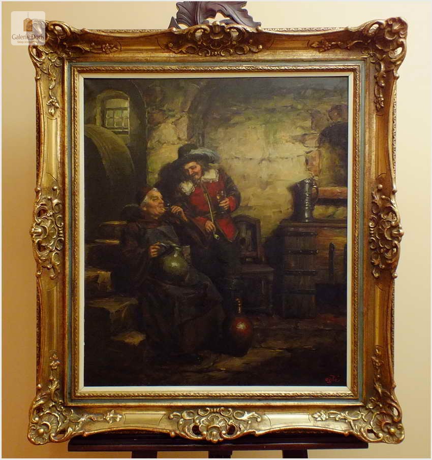 Polecamy stary obraz olejny pędzla znanego malarza niemieckiego Willi DePré. Zachwycająco oddał niesamowicie plastyczność malowanych postaci oraz ich otoczenia, całość podkreślona została finezyjnymi efektami światłocieniowymi a także wyśmienitą grą niuansów barwnych. Ten subtelnie malowany obraz cechuje znakomita technika malarska. Obraz bezpośrednio nawiązuje do dzieła XVII-wiecznego malarstwa. Oprawę malowidła stanowi przestrzenna, gruba rama wykonana z drewna. Złoconą ramę bogato dekorują kunsztowne sztukaterie. Obraz sygnowany jest w prawym dolnym rogu ramy. Gwarantujemy profesjonalnie zabezpieczoną przesyłkę kurierem.