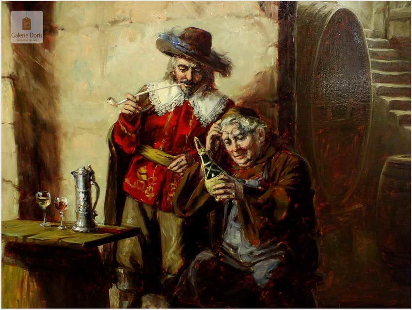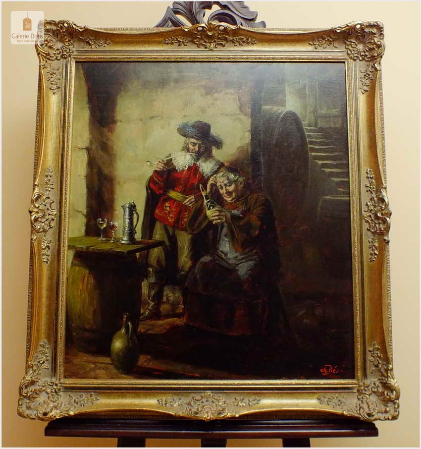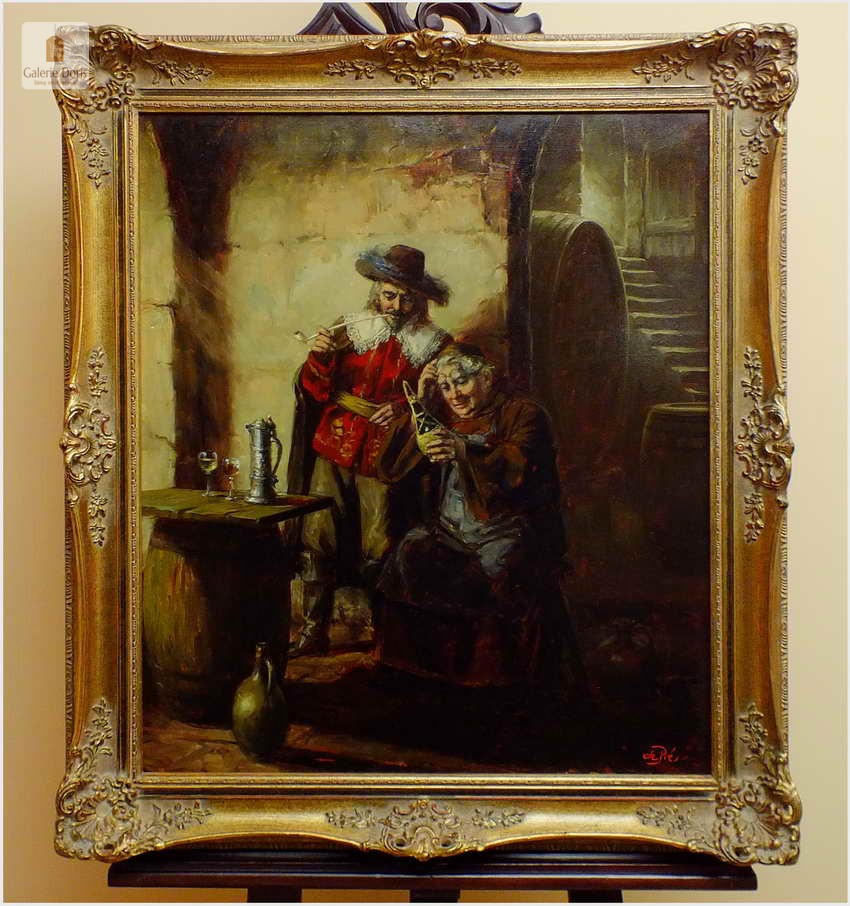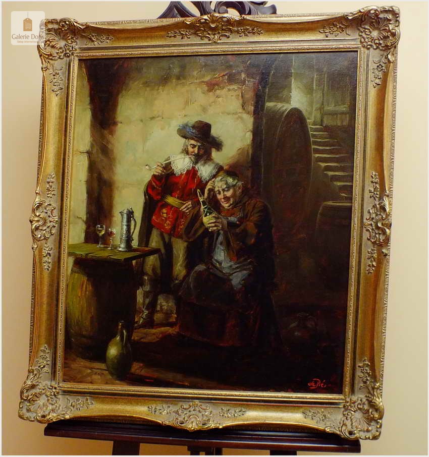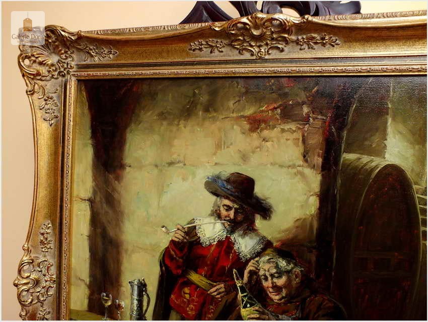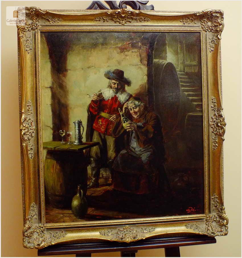 Polecamy stary obraz olejny pędzla znanego malarza niemieckiego Willi DePré. Zachwycająco oddał niesamowicie plastyczność malowanych postaci oraz ich otoczenia, całość podkreślona została finezyjnymi efektami światłocieniowymi a także wyśmienitą grą niuansów barwnych. Ten subtelnie malowany obraz cechuje znakomita technika malarska. Obraz bezpośrednio nawiązuje do dzieła XVII-wiecznego malarstwa. Oprawę malowidła stanowi przestrzenna, gruba rama wykonana z drewna. Złoconą ramę bogato dekorują kunsztowne sztukaterie. Obraz sygnowany jest w prawym dolnym rogu ramy. Gwarantujemy profesjonalnie zabezpieczoną przesyłkę kurierem.