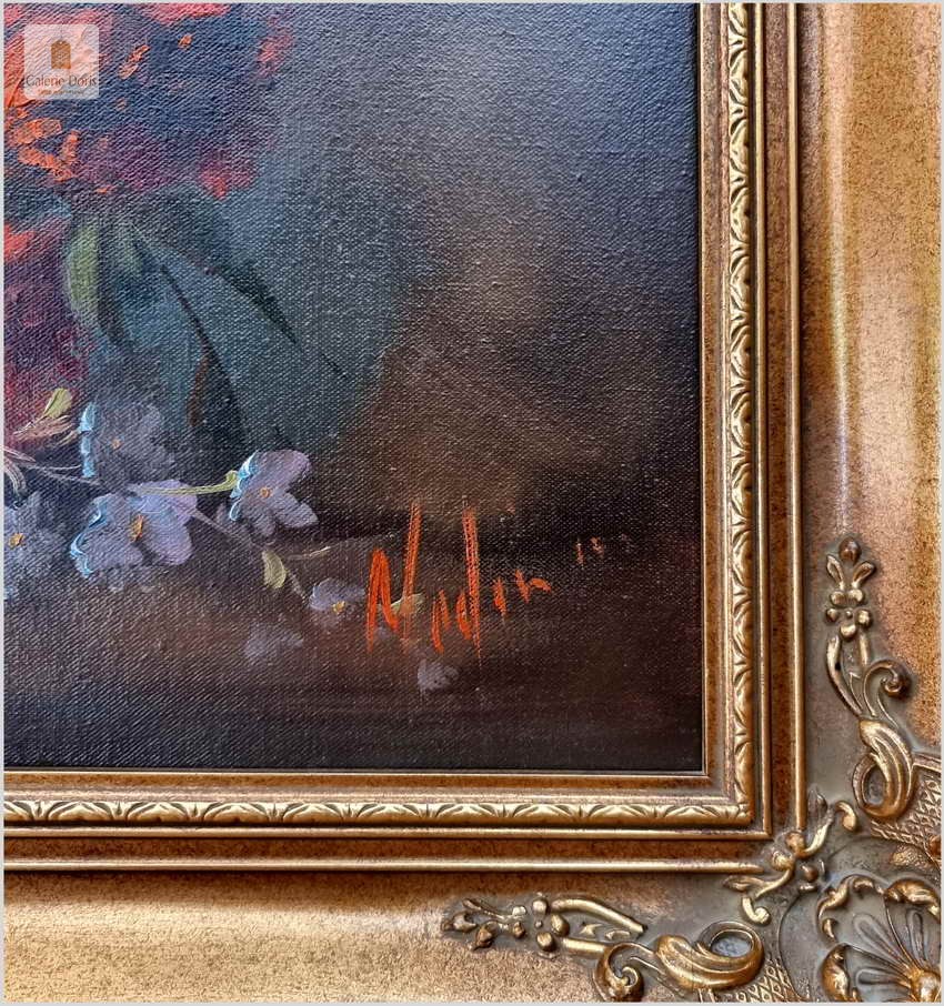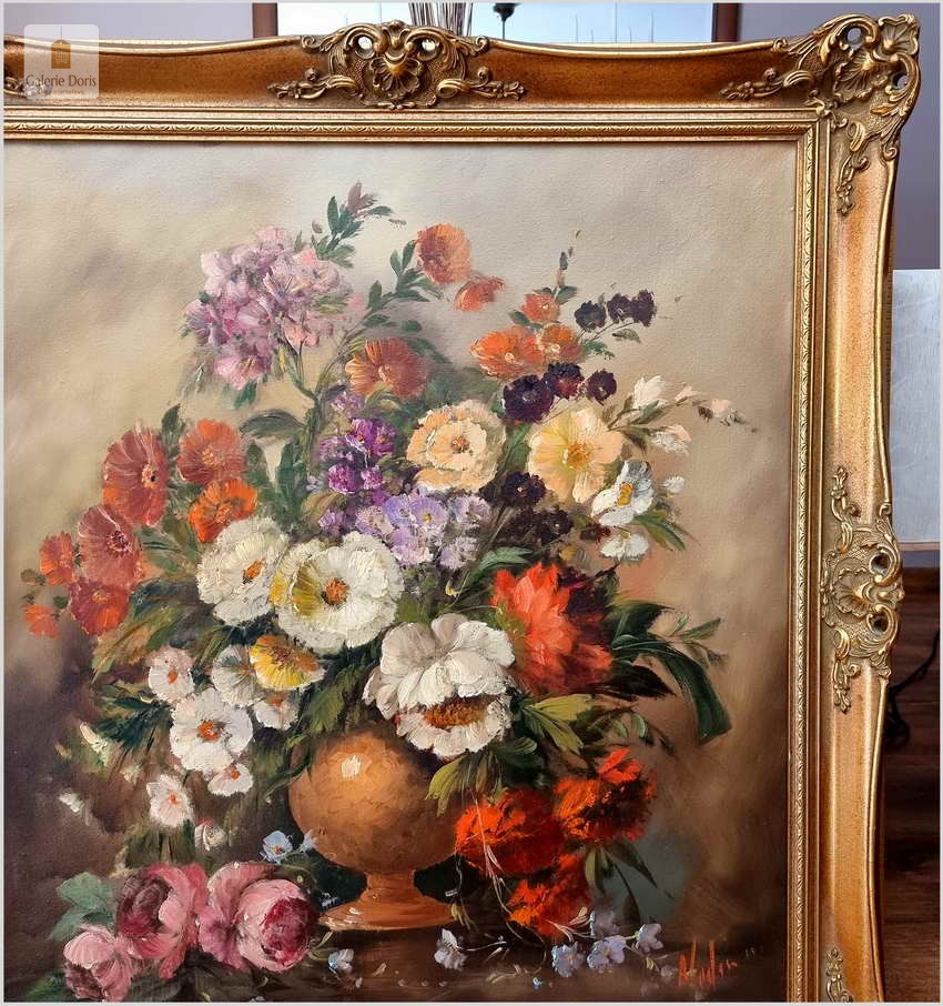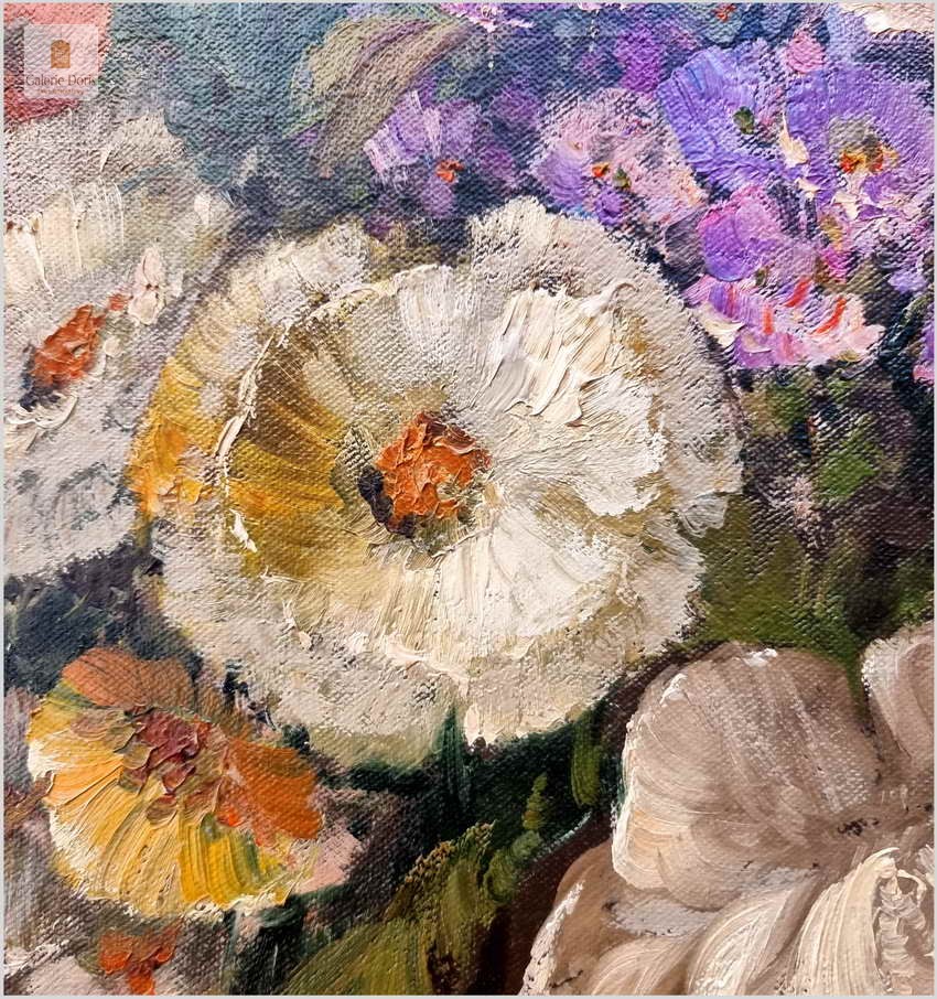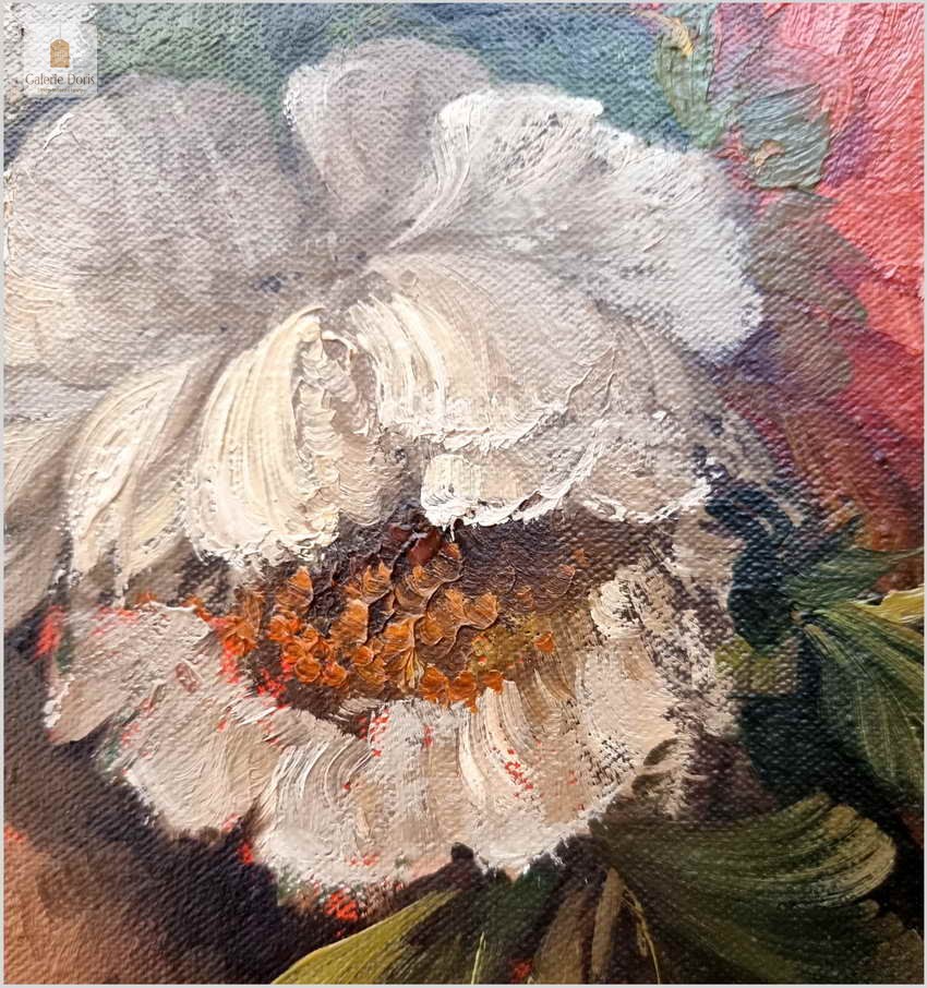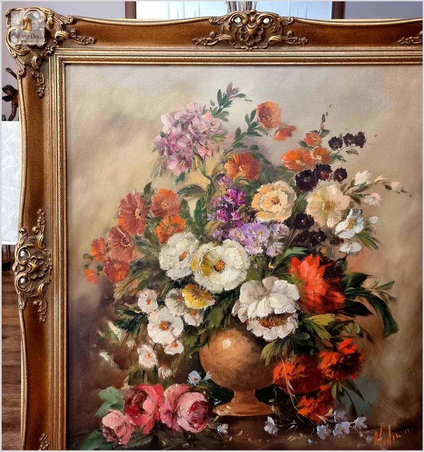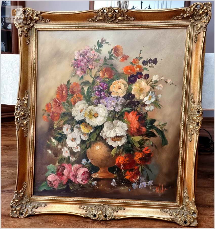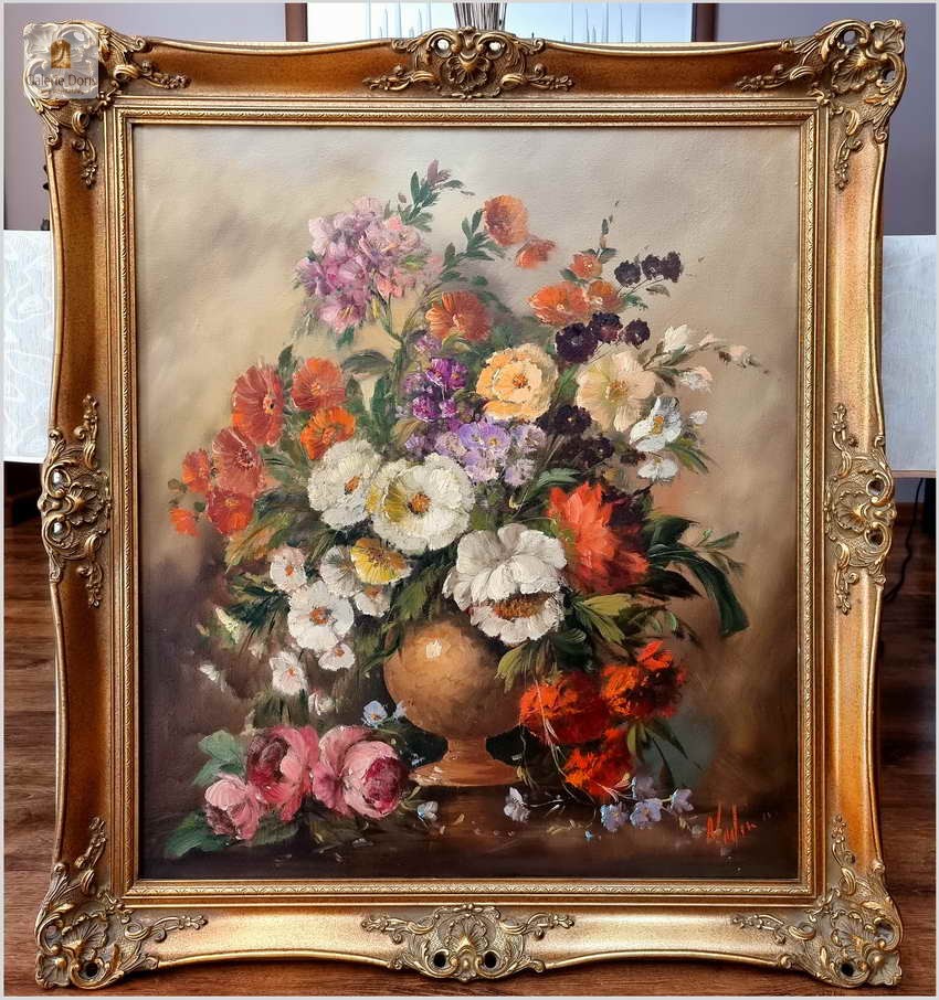 Śliczny obraz z kwiatami. Obraz olejny na płótnie , przedstawia bukiet kwiatów w wazonie.  Wszystkie elementy malowidła zostały ukazane w niezwykle subtelny sposób. Oprawę obrazu stanowi przestrzenna, gruba rama wykonana z drewna. Złoconą ramę ozdabiają kunsztowne sztukaterie. Obraz nawiązuje do malarstwa flamandzkiego, gdzie kwiaty wyglądają jak żywe i mają nasycone barwy.
