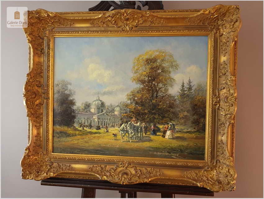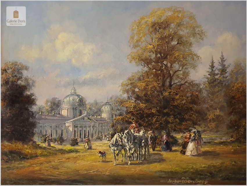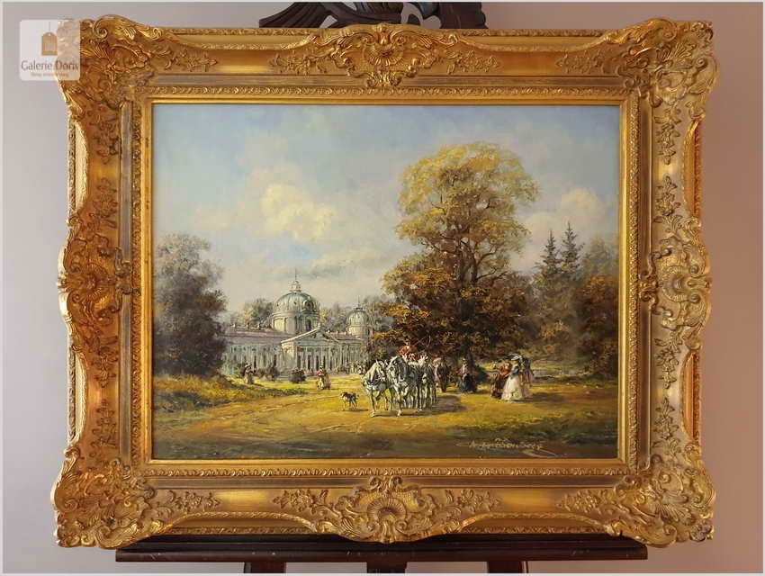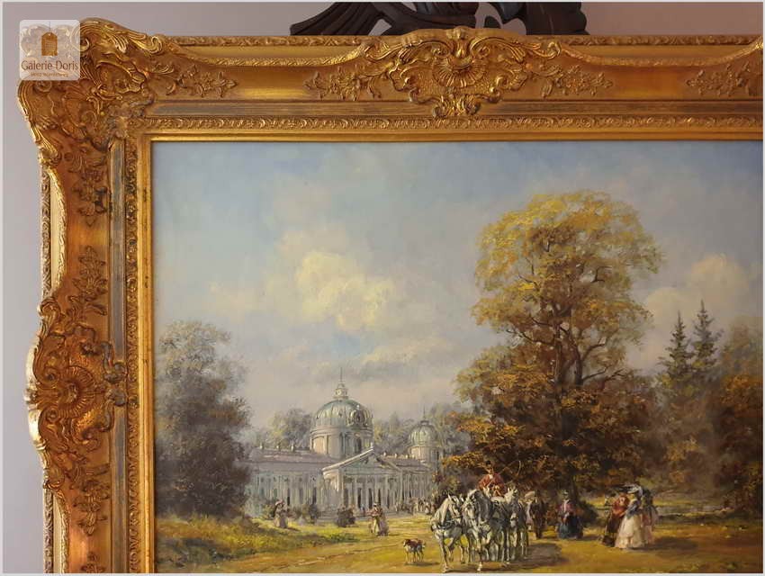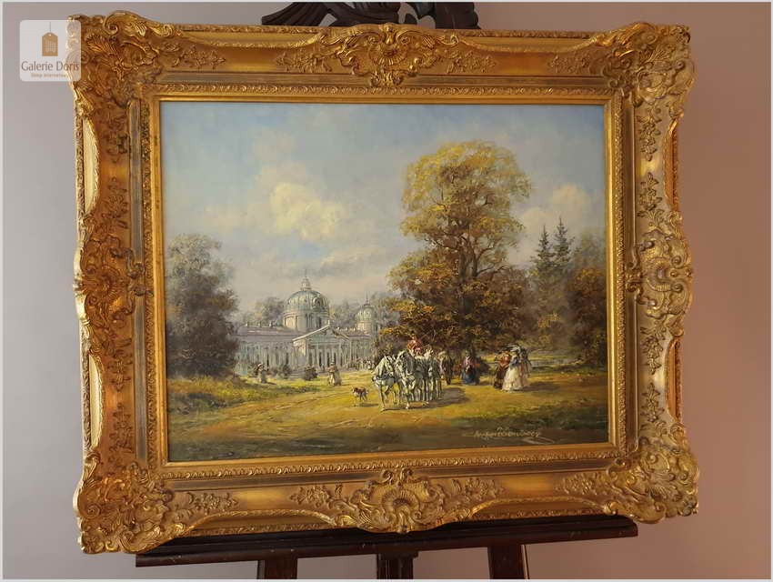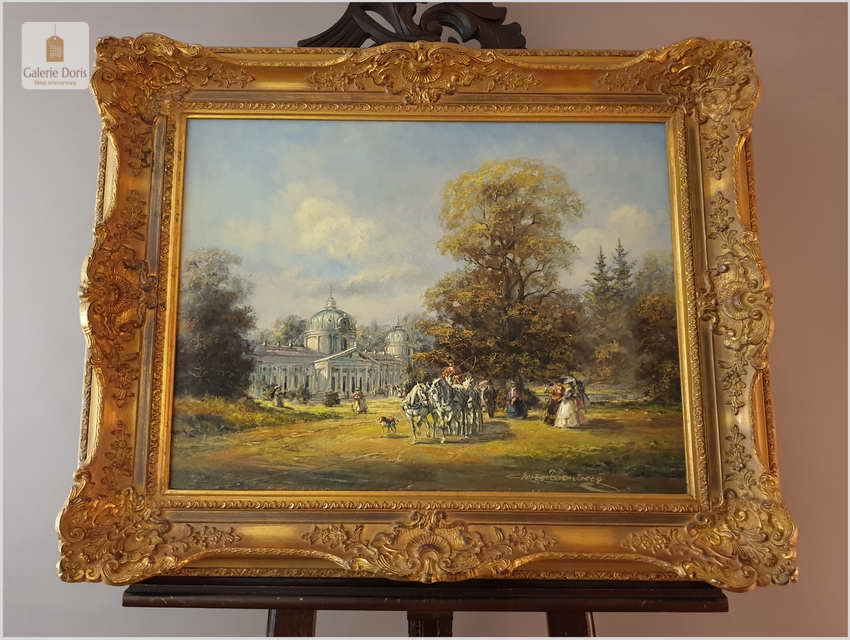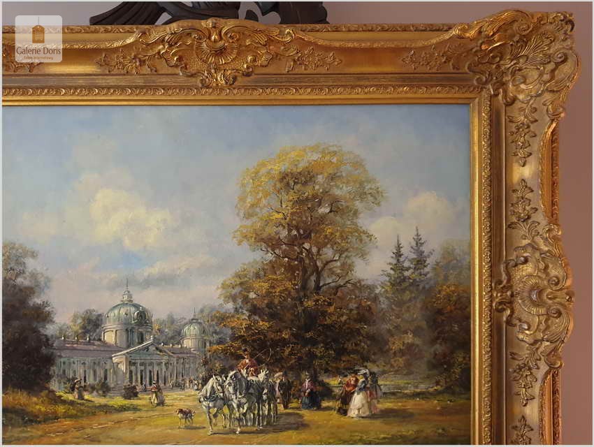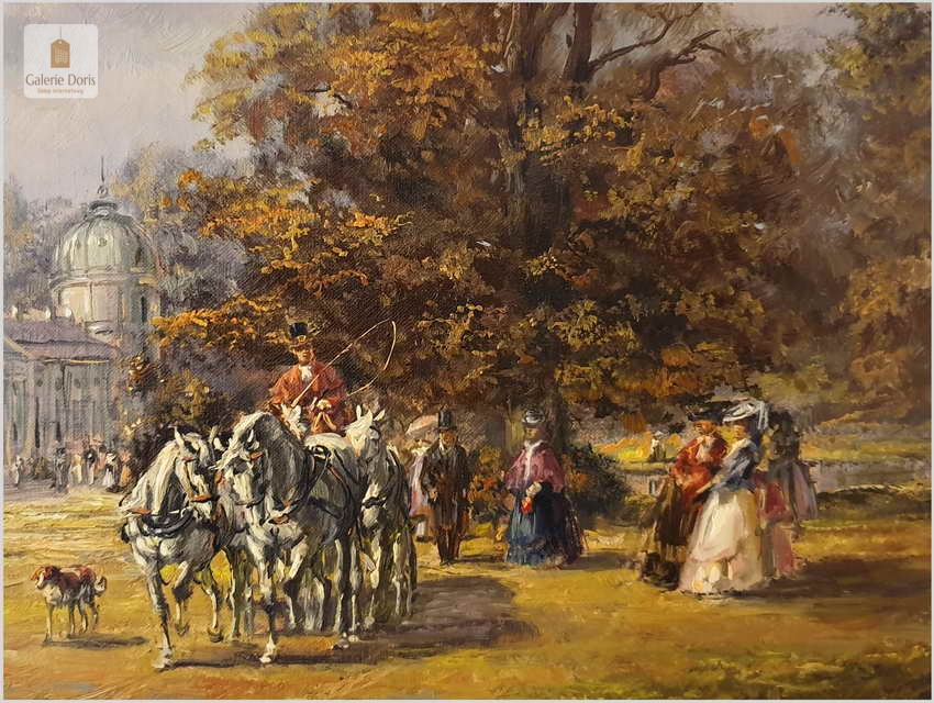Polecamy obraz olejny, Ride in the Park, Deutsche maler - Herbert Isenberg, ur.25.07.1930 w Westfalii, gdzie uczęszczał do Akademii Sztuk Pięknych w Darmstadt. Malarz zakochany w stylu rokoko. Podejmował głównie tematykę malarską z polowań, sceny parkowe oraz w szczególności sceny XVIIIw. z powozami w scenerii zamkowych parków. 1953 roku wielki sukces na wystawach w Niemczech, Francji, Kanadzie. Wiele wznowień obrazów na porcelanie oraz na kartach pocztowych. Obraz zachowany w idealnym stanie. Polecamy!