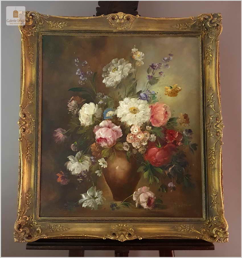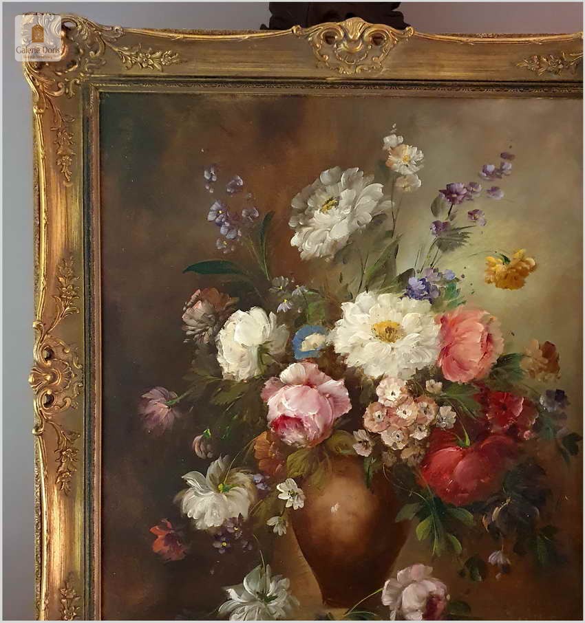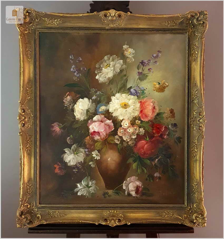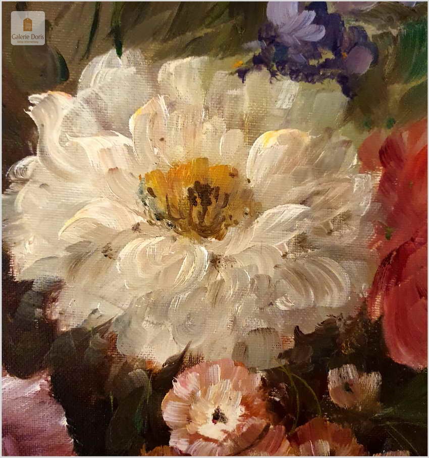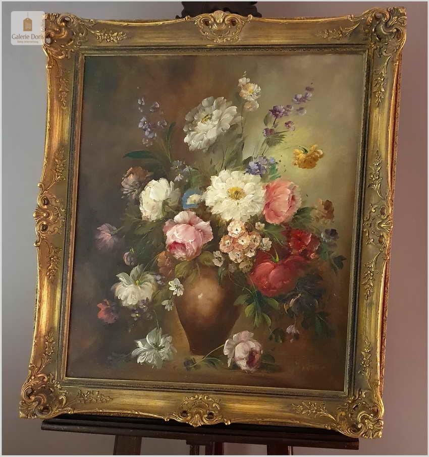 Śliczny obraz z kwiatami. Obraz olejny na płótnie , przedstawia bukiet kwiatów w wazonie.  Wszystkie elementy malowidła zostały ukazane w niezwykle subtelny sposób. Oprawę obrazu stanowi przestrzenna, gruba rama wykonana z drewna. Złoconą ramę ozdabiają kunsztowne sztukaterie.