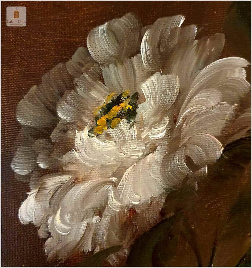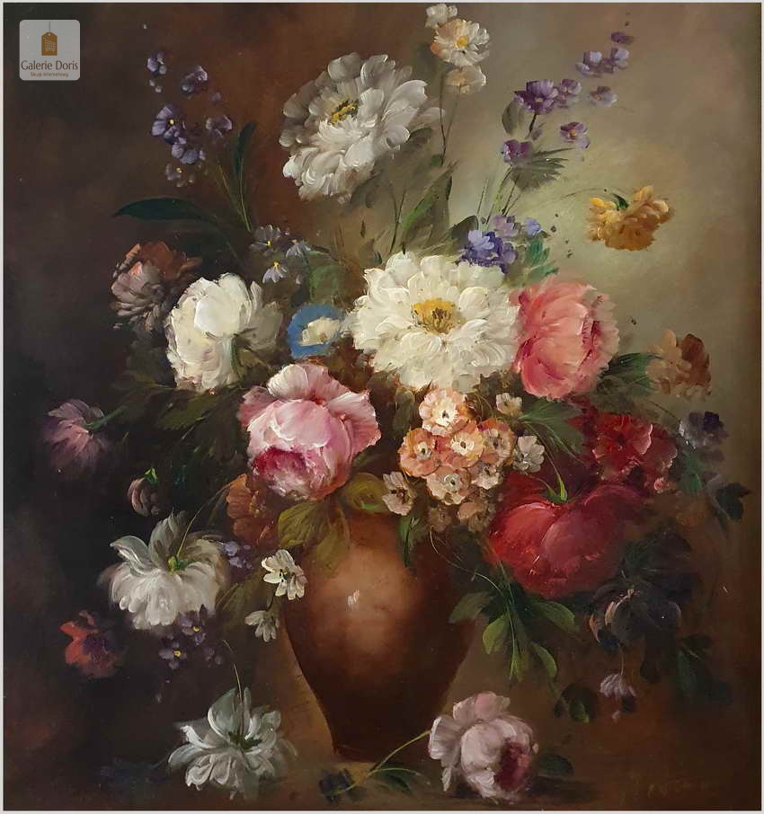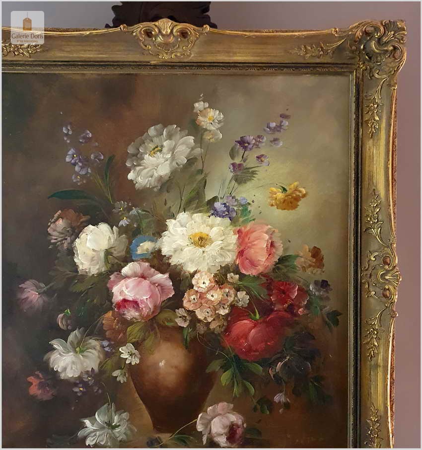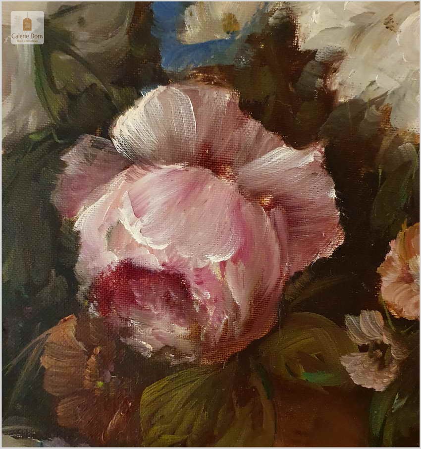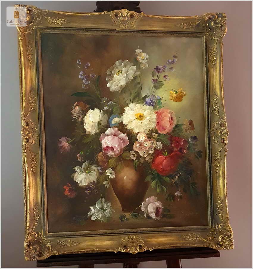 Śliczny obraz z kwiatami. Obraz olejny na płótnie , przedstawia bukiet kwiatów w wazonie.  Wszystkie elementy malowidła zostały ukazane w niezwykle subtelny sposób. Oprawę obrazu stanowi przestrzenna, gruba rama wykonana z drewna. Złoconą ramę ozdabiają kunsztowne sztukaterie.