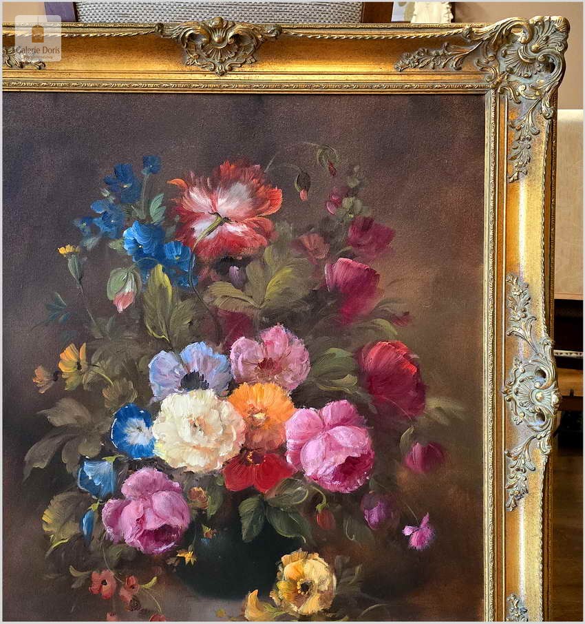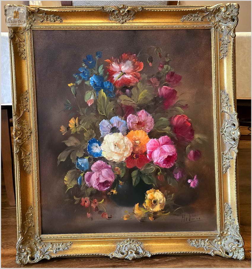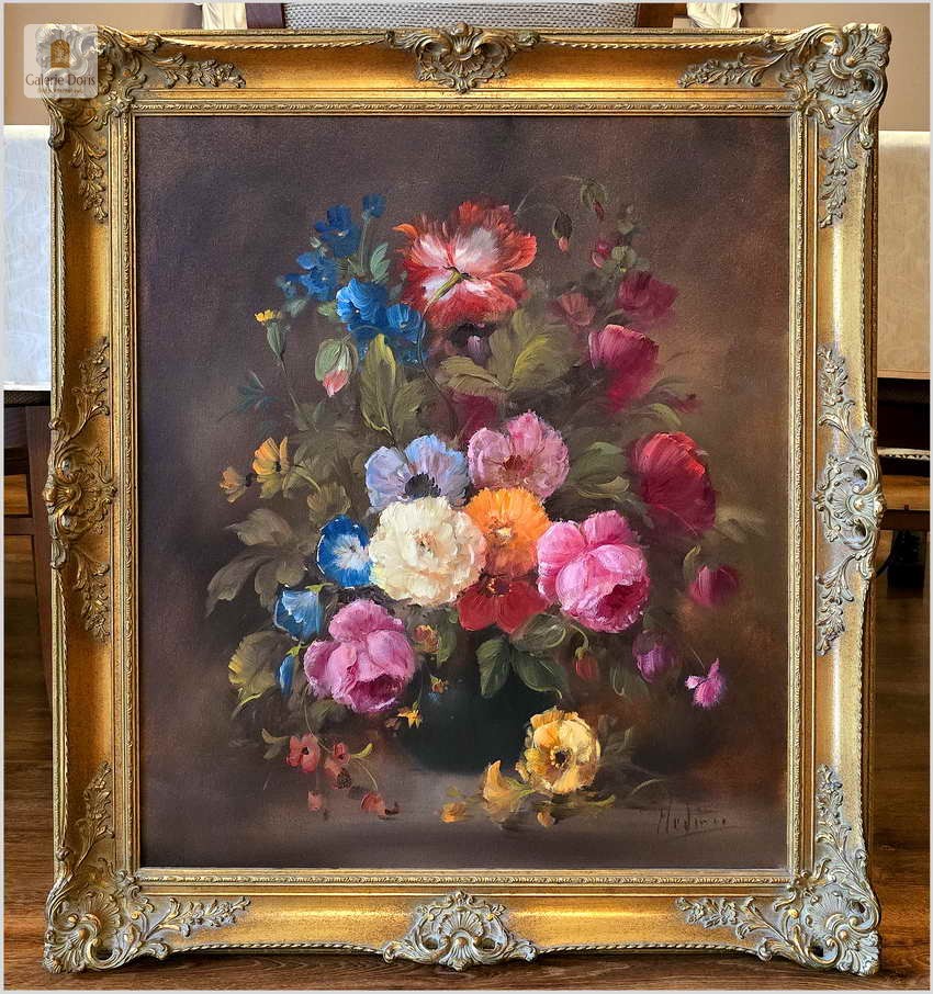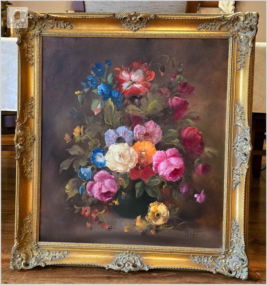Śliczny obraz z kwiatami. Obraz olejny na płótnie , przedstawia bukiet kwiatów w wazonie.  Wszystkie elementy malowidła zostały ukazane w niezwykle subtelny sposób. Oprawę obrazu stanowi przestrzenna, gruba rama wykonana z drewna. Złoconą ramę ozdabiają kunsztowne sztukaterie. Obraz nawiązuje do malarstwa flamandzkiego, gdzie kwiaty wyglądają jak żywe i mają nasycone barwy.