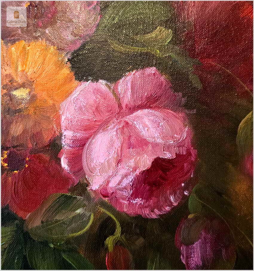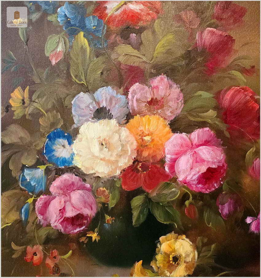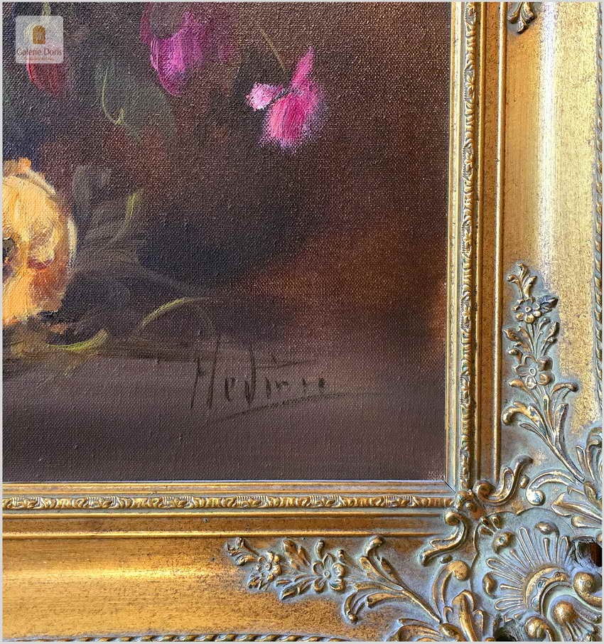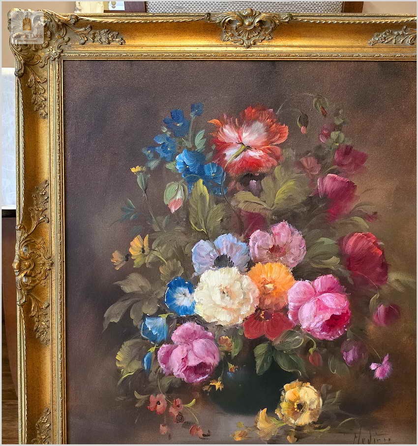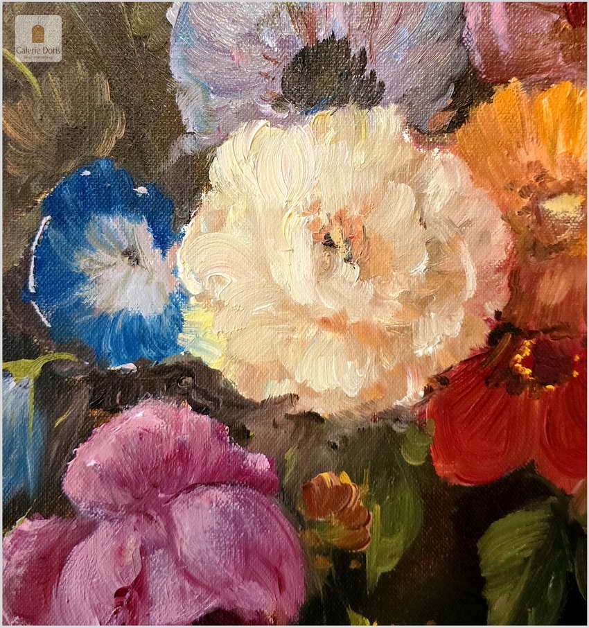 Śliczny obraz z kwiatami. Obraz olejny na płótnie , przedstawia bukiet kwiatów w wazonie.  Wszystkie elementy malowidła zostały ukazane w niezwykle subtelny sposób. Oprawę obrazu stanowi przestrzenna, gruba rama wykonana z drewna. Złoconą ramę ozdabiają kunsztowne sztukaterie. Obraz nawiązuje do malarstwa flamandzkiego, gdzie kwiaty wyglądają jak żywe i mają nasycone barwy.