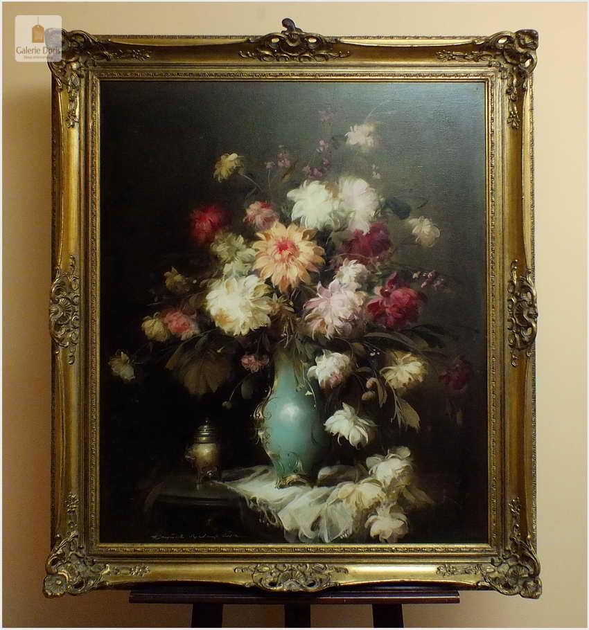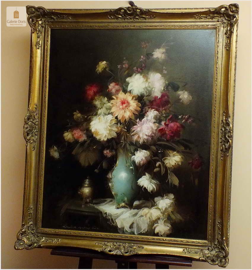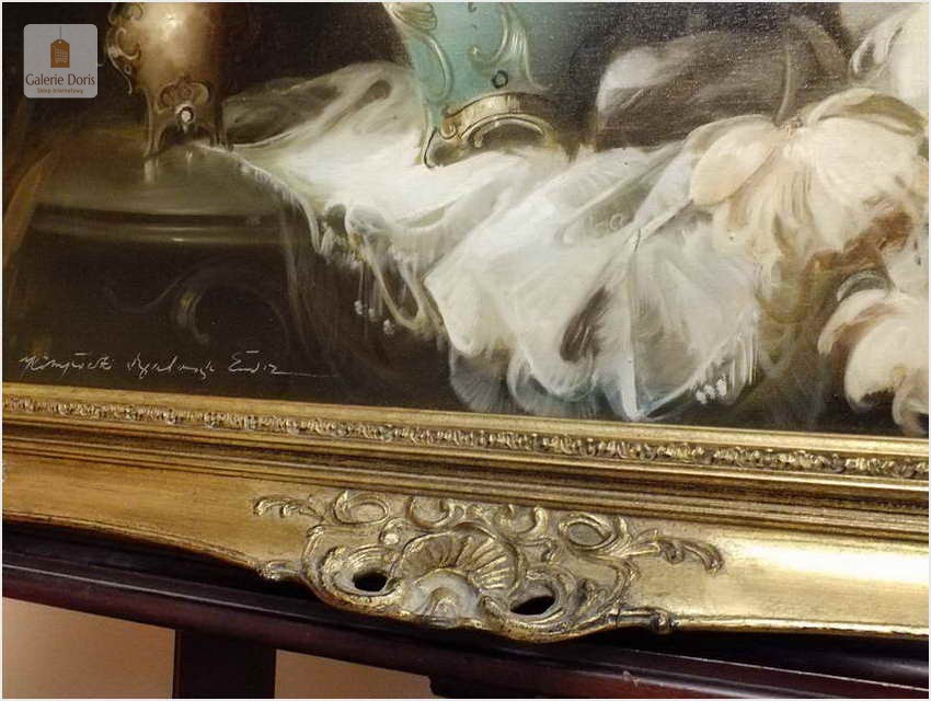 Polecamy piękny dużych rozmiarów pałacowy obraz olejny przedstawiający bukiet kwiatów w wazonie. Obraz oprawiony jest w przestrzenną ramę wykonaną z drewna. Całość jest sygnowana w dolnym rogu ramy. Obraz przedstawia typową pracę artysty z kręgu „martwych natur”. Malarstwo Belogh - Endre, było zawsze ozdobą i wzbudzało ogromne zainteresowanie szerokiej publiczności. Do obrazu dołączamy certyfikat - Polecamy!