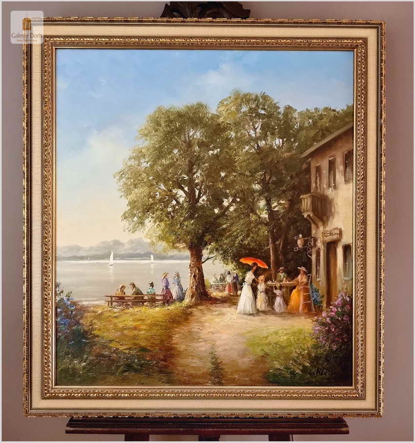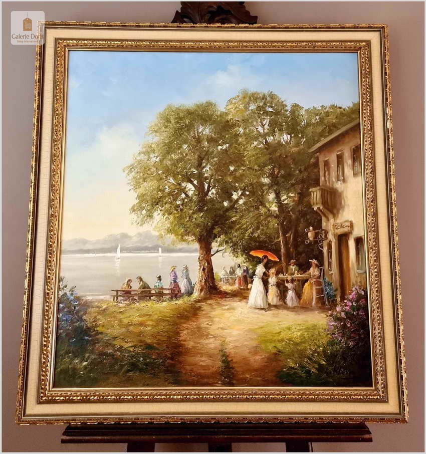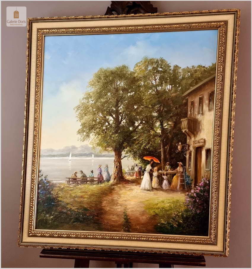 Przedstawiamy Państwu duży pejzaż letni ze sztafażem w stylo rokoko. Klein postrzegał krajobraz i malował z dużą wrażliwością i upodobaniem jak nikt inny. Jego niezwykle subtelne, nastrojowe, barwne obrazy olejne wyróżniają się mistrzowską grą świateł i cieni. W niektórych kompozycjach Kleina przewagę zyskuje walor dekoracyjności. Obraz jest w bardzo dobrej tonacji kolorystycznej oraz w super stanie. Polecamy!
