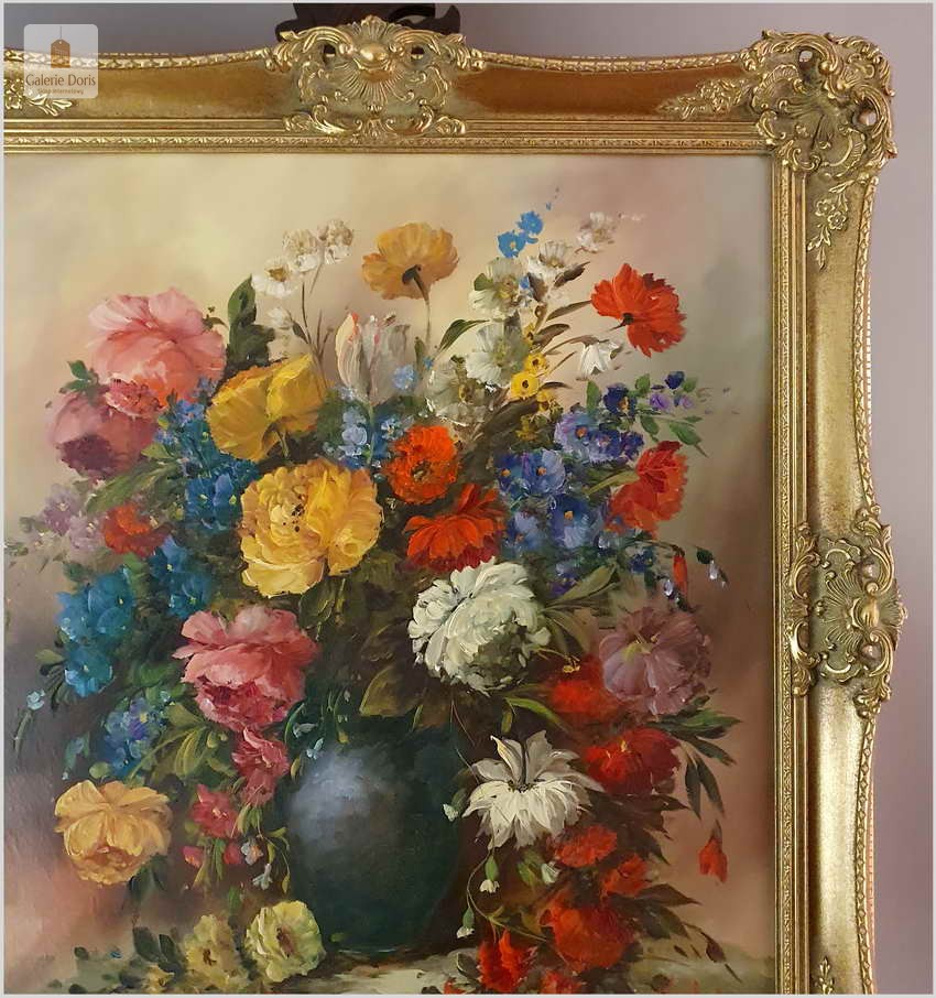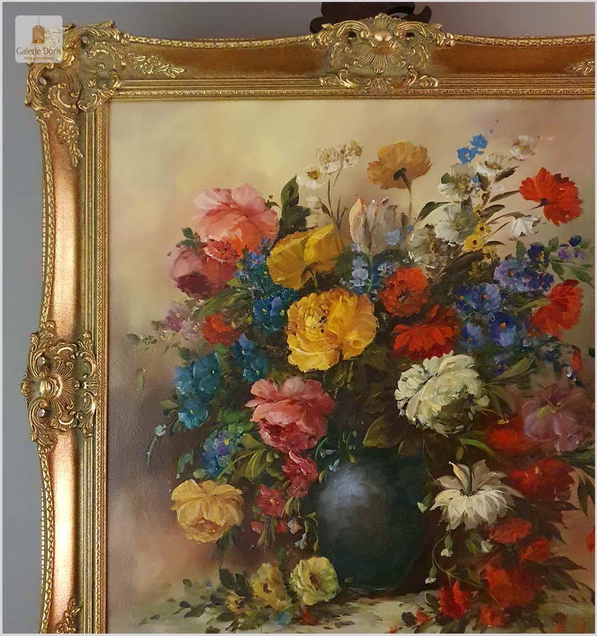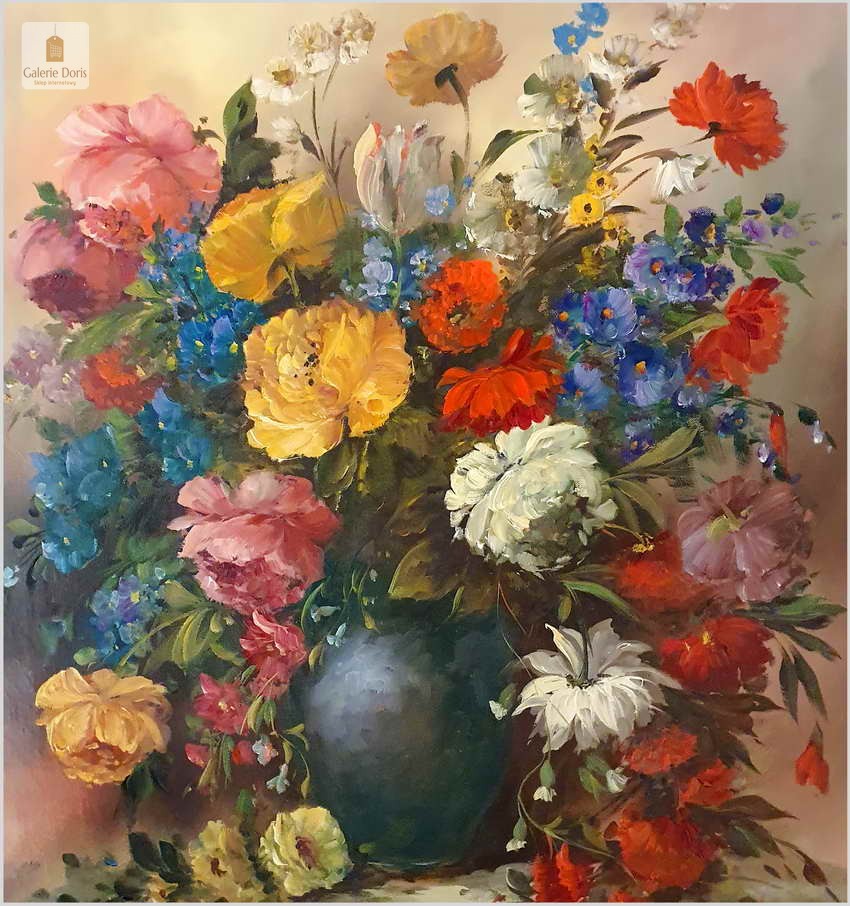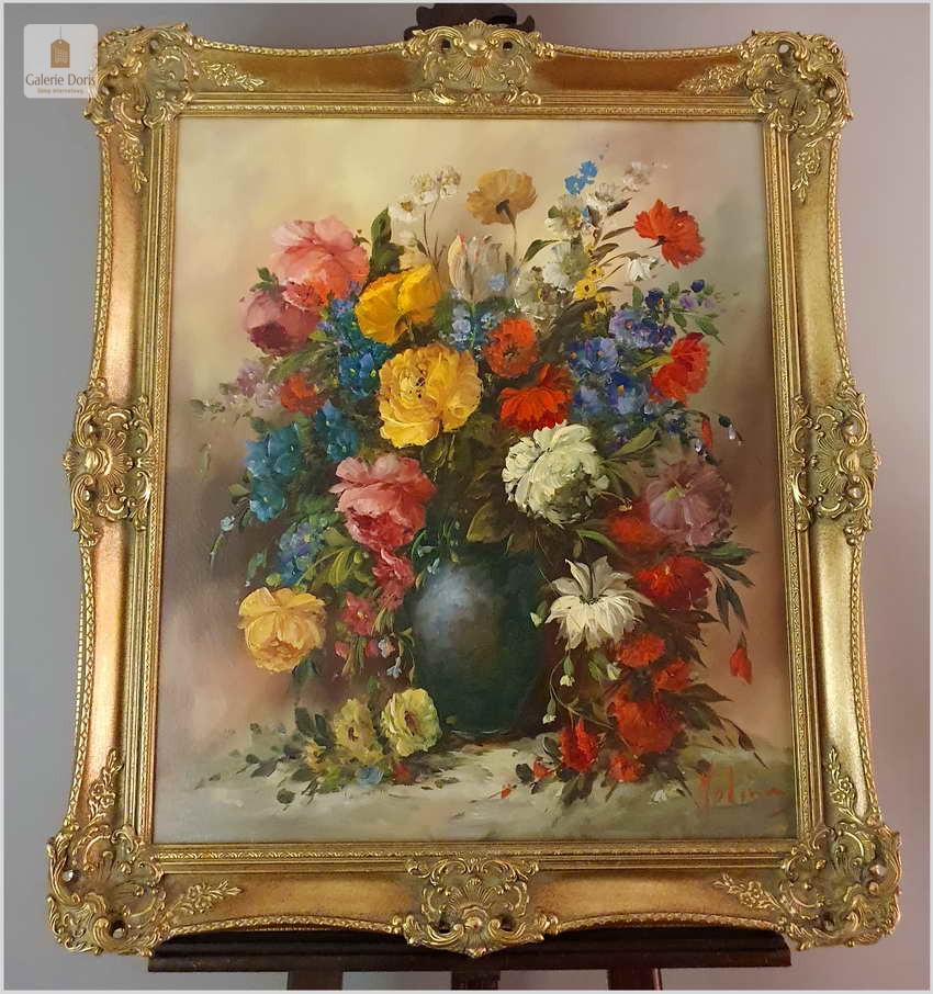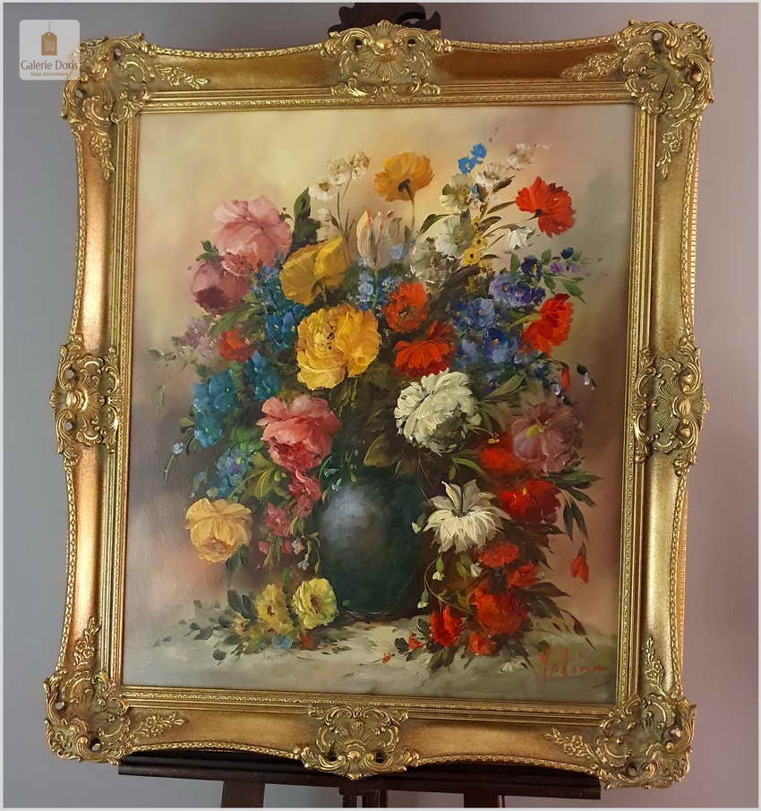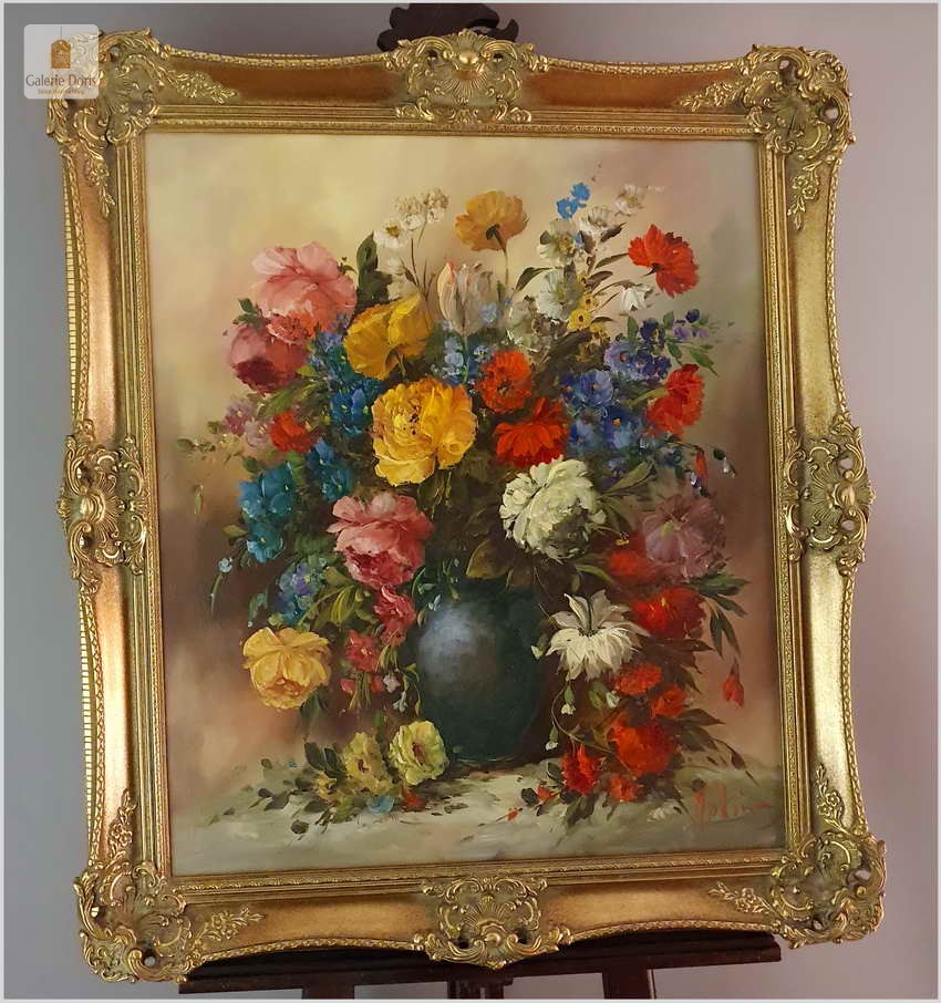 Śliczny obraz z kwiatami. Obraz olejny na płótnie , przedstawia bukiet kwiatów w wazonie.  Wszystkie elementy malowidła zostały ukazane w niezwykle subtelny sposób. Oprawę obrazu stanowi przestrzenna, gruba rama wykonana z drewna. Złoconą ramę ozdabiają kunsztowne sztukaterie. Obraz nawiązuje do malarstwa flamandzkiego, gdzie kwiaty wyglądają jak żywe i mają nasycone barwy.