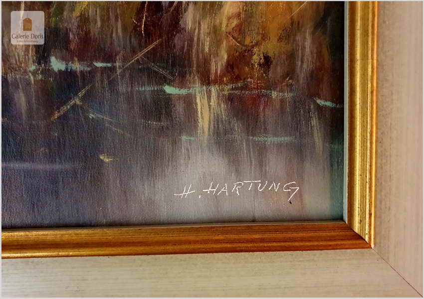 Obraz malowany w technice pędzla, struktura nałożonej farby wyczuwalna mocno pod palcami. Sygnowany H. Hartung. Obraz oprawiony jest w przestrzenną ramę. Obrazy artysty cieszą się dużym powodzeniem i są rzadkością na aukcjach sztuki. Polecamy!