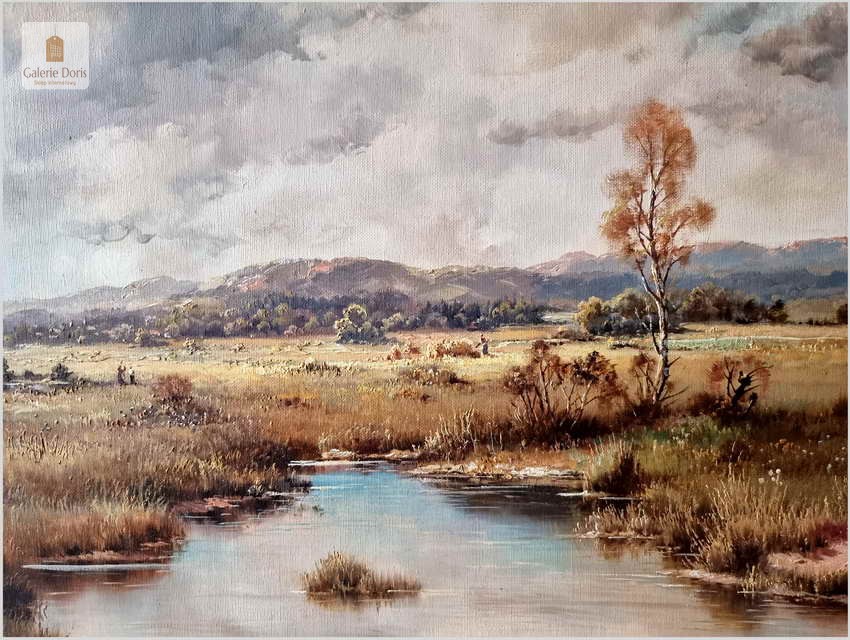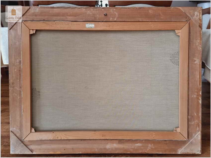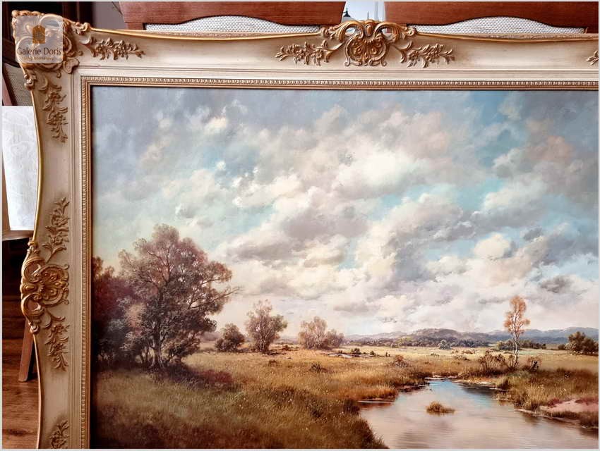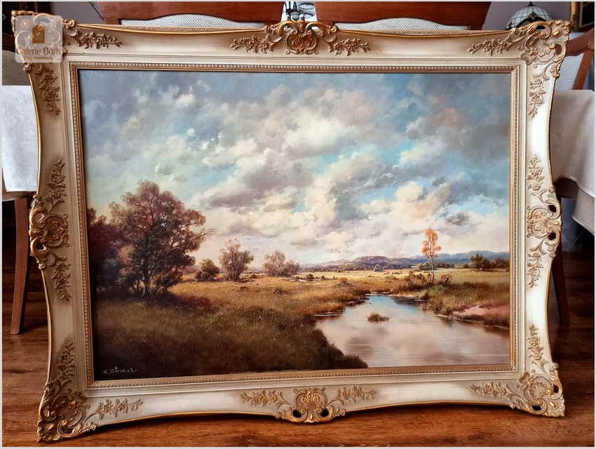 Stary obraz olejny na płótnie. Znakomite ukazanie pejzażu. Obraz cechuje doskonała technika malarska, struktura farby wyraźnie wyczuwalna pod palcami. Oprawę obrazu stanowi przestrzenna rama wykonana z drewna. Obraz sygnowany w dolnym rogu.