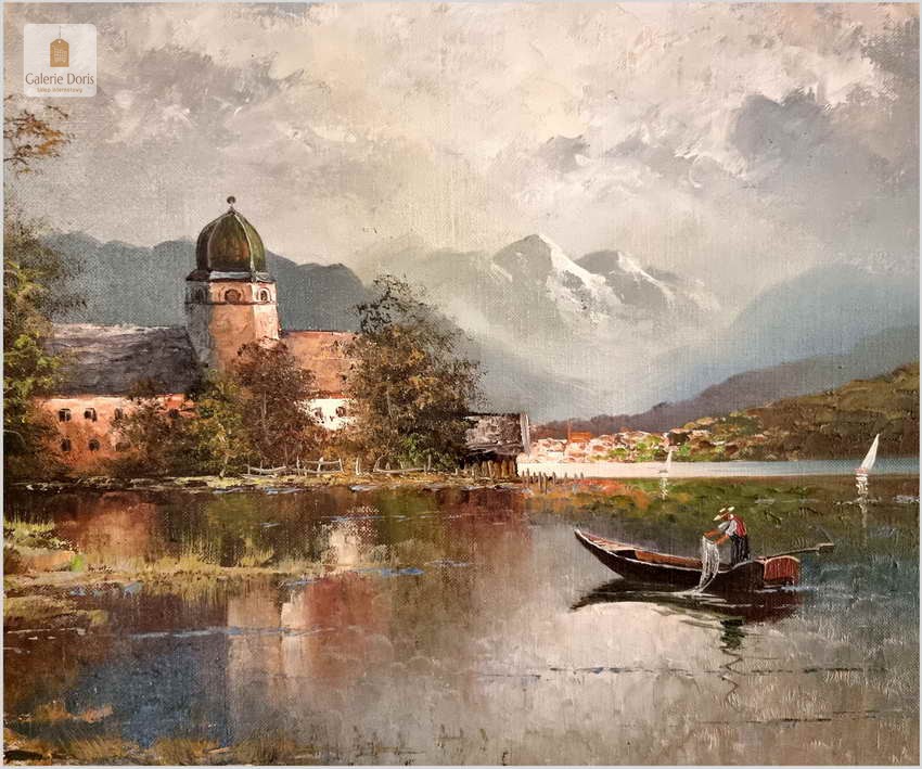Polecamy bardzo duży dekoracyjny obraz olejny na płótnie. Niezwykle piękny, romantyczny krajobraz, przedstawiający malownicze zakole jeziora. Subtelnie malowany duży obraz olejny na płótnie. Wspaniale oddano partię nieba oraz rozległy widok na otaczające góry. Soczysta zieleń i lustro górskiej wody kontrastuje z pastelami nieba i górskich szczytów. Bardzo nastrojowa kompozycja. Ten relaksujący pejzaż odznacza się delikatnie prowadzonymi liniami pędzla i wysmakowaną grą barw.