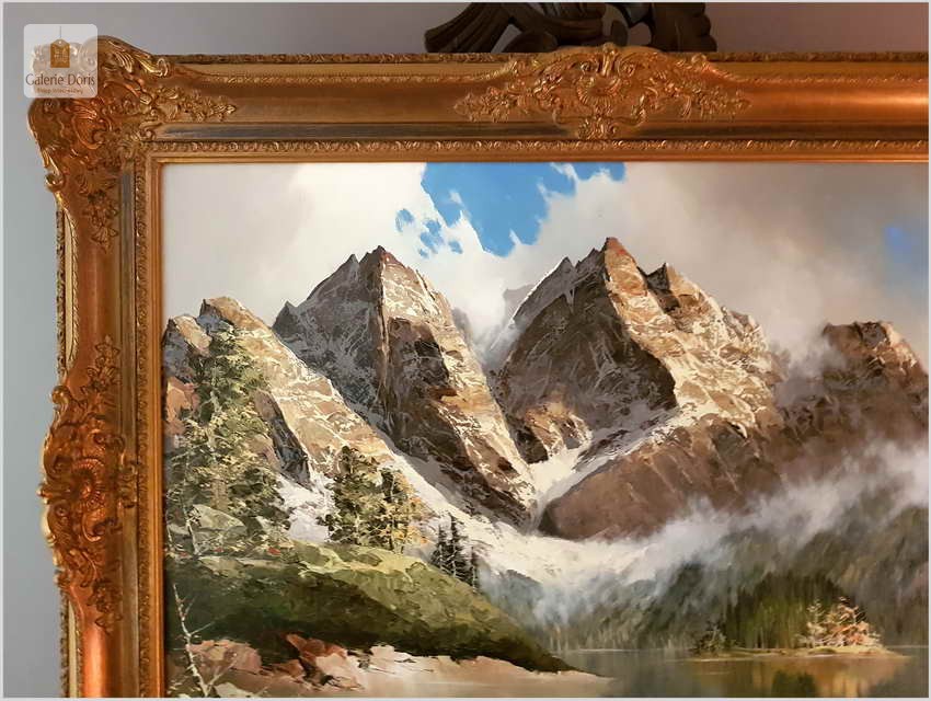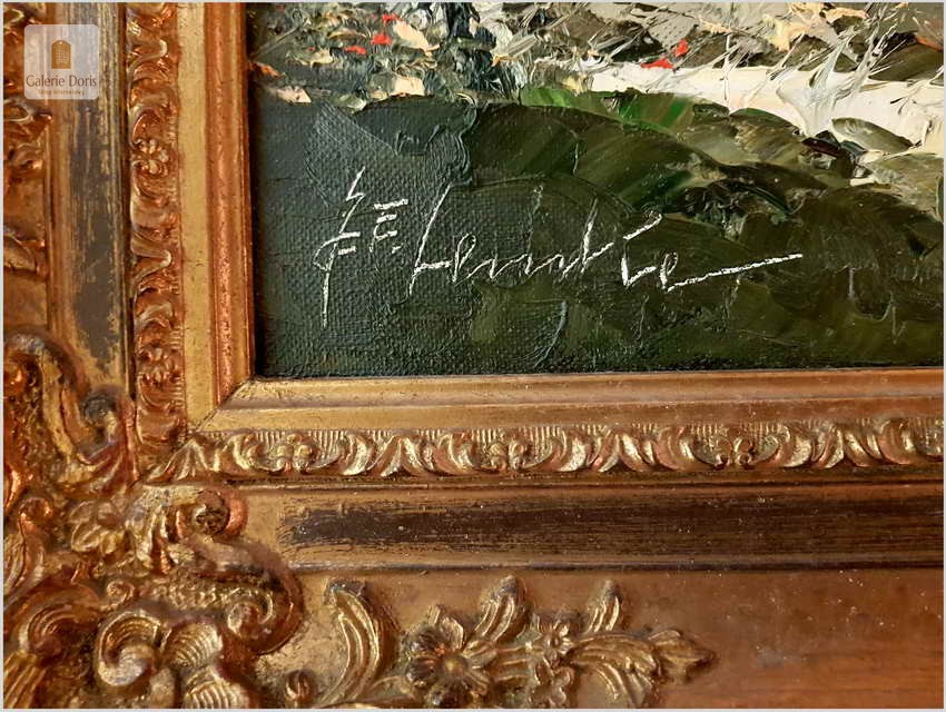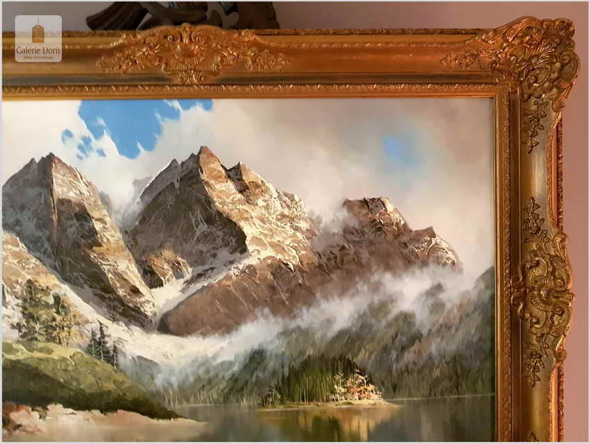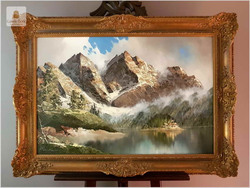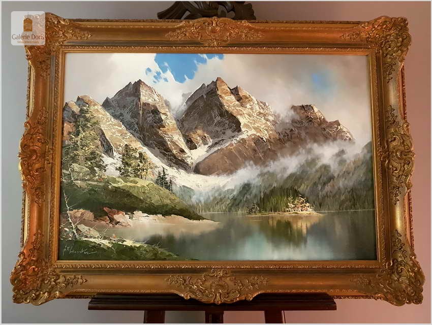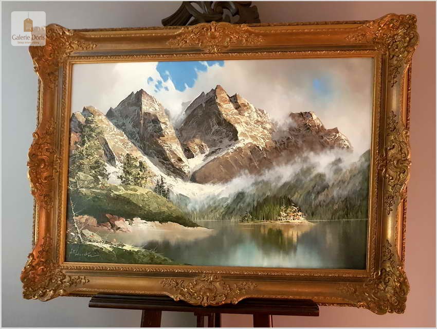Duży obraz olejny malowany na płótnie, cenionego niemieckiego malarza J.E. Lemke. Niezwykle piękny obraz olejny na płótnie, obraz odznacza się dobrą perspektywą oraz wysmakowaną grą barw, podkreślającą subtelne niuanse i kontrasty palety kolorystycznej. Cechuje go świetna technika malarska. Struktura farby wyraźnie wyczuwalna pod palcami. Obraz oprawiony jest w przestrzenną, grubą ramę wykonaną z drewna. Złocona rama ozdobiona jest misternymi sztukateriami. Płótno sygnowane w lewym dolnym rogu J.E.Lemke. Stan płótna, ramy bardzo dobry.