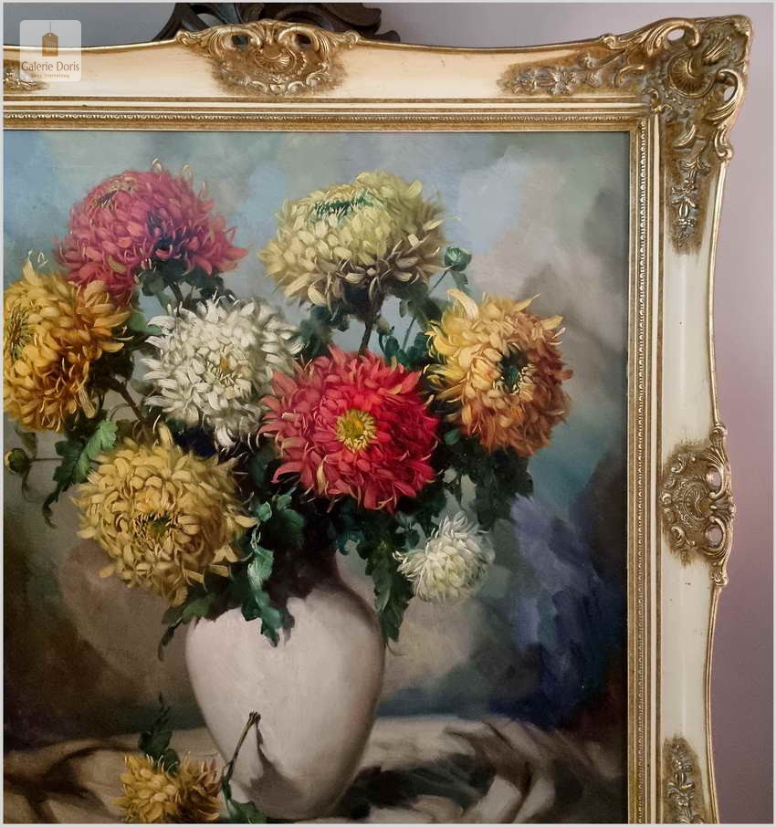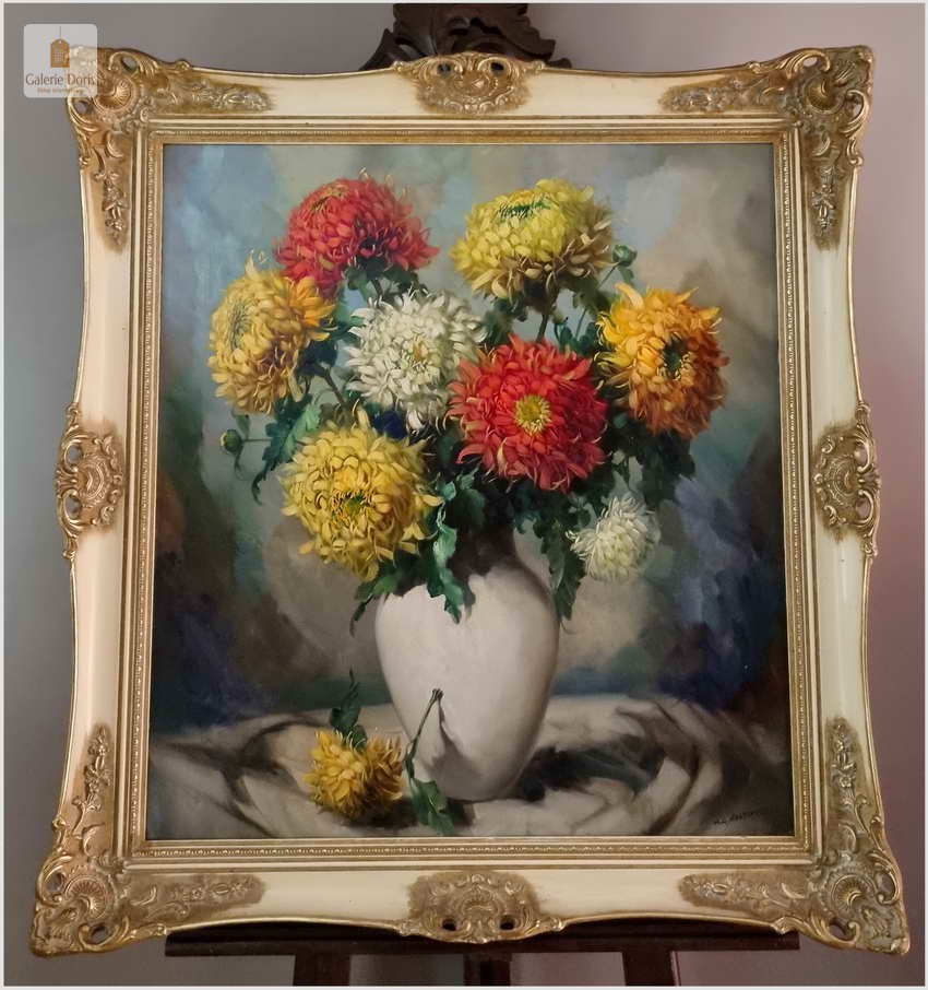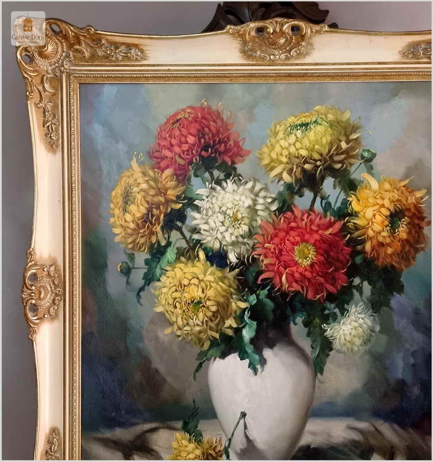 Polecamy niezwykle piękny stary obraz olejny przedstawiający Bukiet kwiatów w wazonie, namalowany olejem na płótnie. Struktura farby wyraźnie wyczuwalna pod palcami. Obraz oprawiony jest w przestrzenną, grubą ramę wykonaną z drewna. Całość jest sygnowana w dolnym rogu ramy. Obraz malowany na grubym płótnie malarskim. Obraz przedstawia typową pracę artysty z kręgu „martwych natur”. Jego malarstwo było zawsze ozdobą i wzbudzało ogromne zainteresowanie szerokiej publiczności.