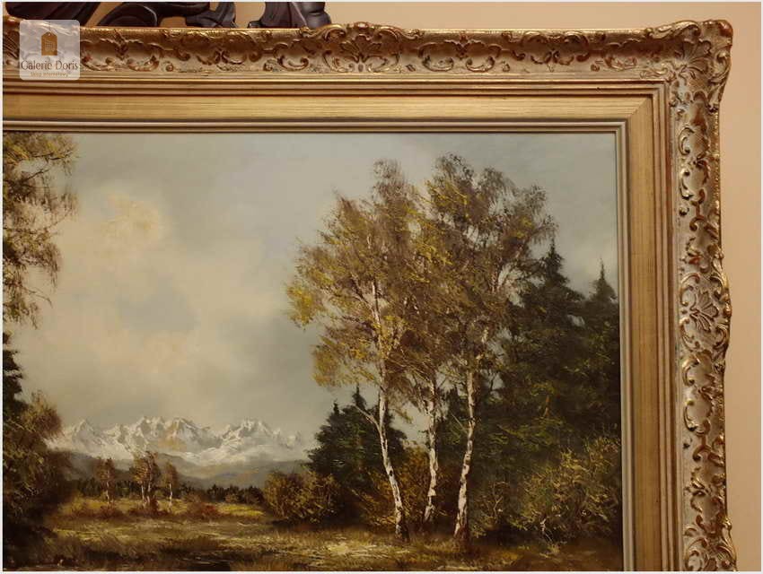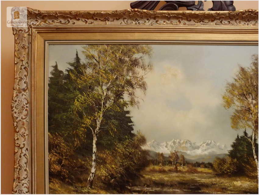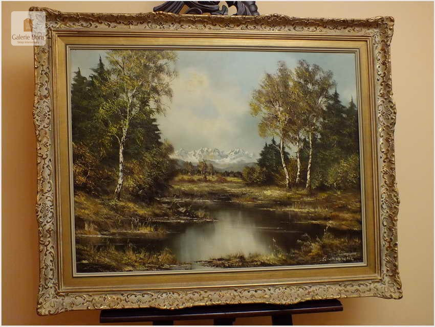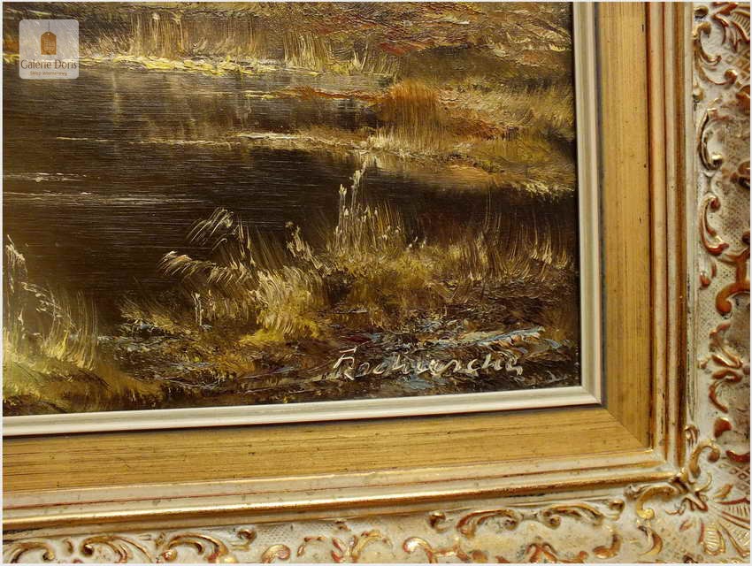 Polecamy duży obraz olejny malowany na płótnie z widokiem na rozlewisko. Na uwagę zasługuje perfekcja doboru kolorów oraz detale. Obraz dużych rozmiarów w stanie wyśmienitym,  oprawiony w szeroką ramę. Polecamy!