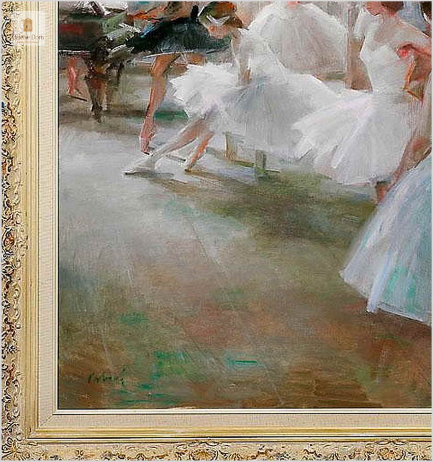 Obraz olejny malowany na płycie pilśniowej, przedstawiający balet z młodymi dziewczętami. Obok ulubionych tancerek, scen baletowych i portretów malowała także pejzaże i miejskie motywy z Pragi, sceny religijne, martwe natury i kwiaty. W jej obrazach dostrzega się fascynację sztuką E. Degasa i inspiracje czerpane z malarstwa francuskich postimpresjonistów. Obraz bez uszkodzeń!