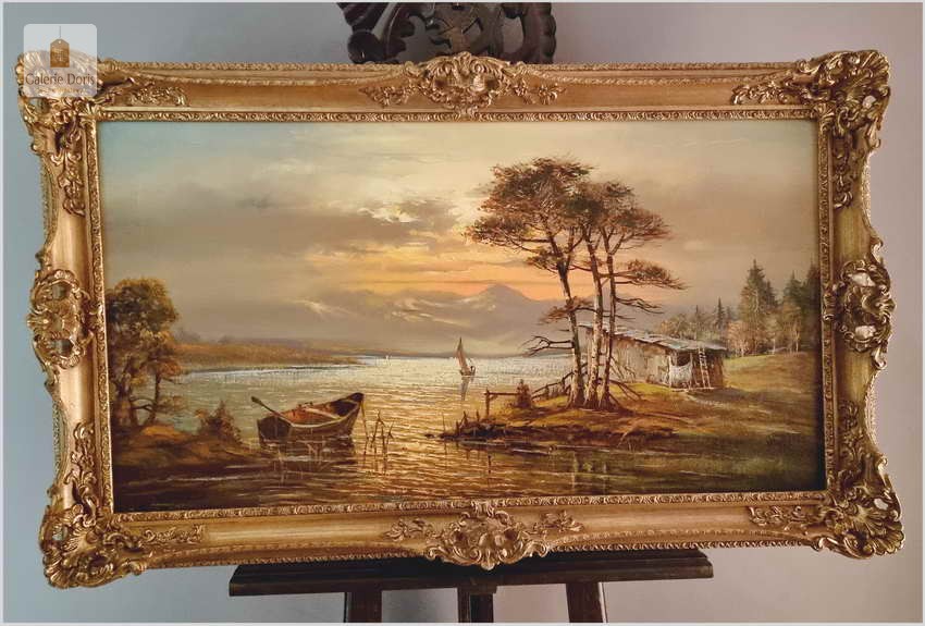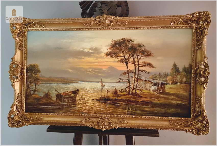 Przedstawiamy duży obraz olejny. Po zmroku i zapaleniu światła w pomieszczeniu, wydobywa się z płótna głębia tworząc piękne światłocieniowe impasty. Obraz urzeka szczególną dekoracyjnością, bardzo dobrą kompozycją, łagodnym nastrojem . Obraz malowany farbami olejnymi na płótnie, struktura nałożonej farby mocno wyczuwalna jest pod palcami.  Dzieło polecamy koneserom cennego i dobrego malarstwa pejzażowego.