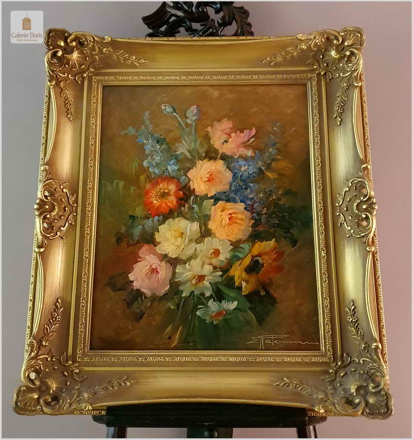 Proponujemy Państwu dobrą pracę olejną, niemieckiej malarki martwych natur. Hedwig Petermann to malarka, która głównym tematem malarskim jaki uprawiała były subtelne a zarazem piękne kompozycje kwiatowe. Uczennica Wilhelma Ecksteina w Düsseldorfie. Malowała martwe natury z owocami i kwiatami, które wyróżniają się dobrą kompozycją, szlachetnym kolorytem, miękkością modelunku i łagodnym nastrojem.