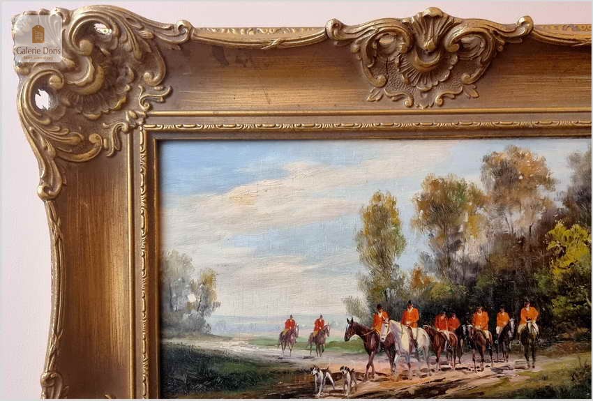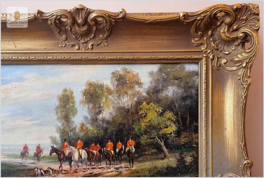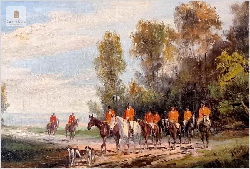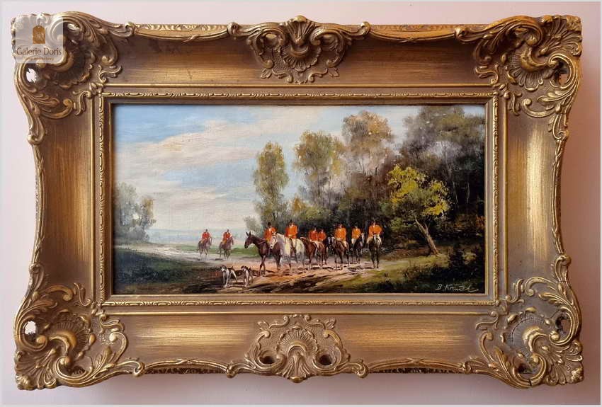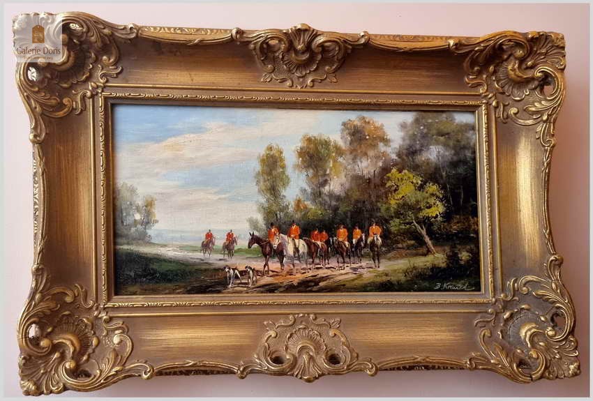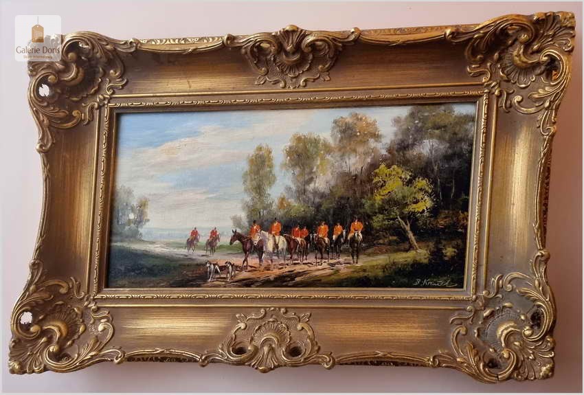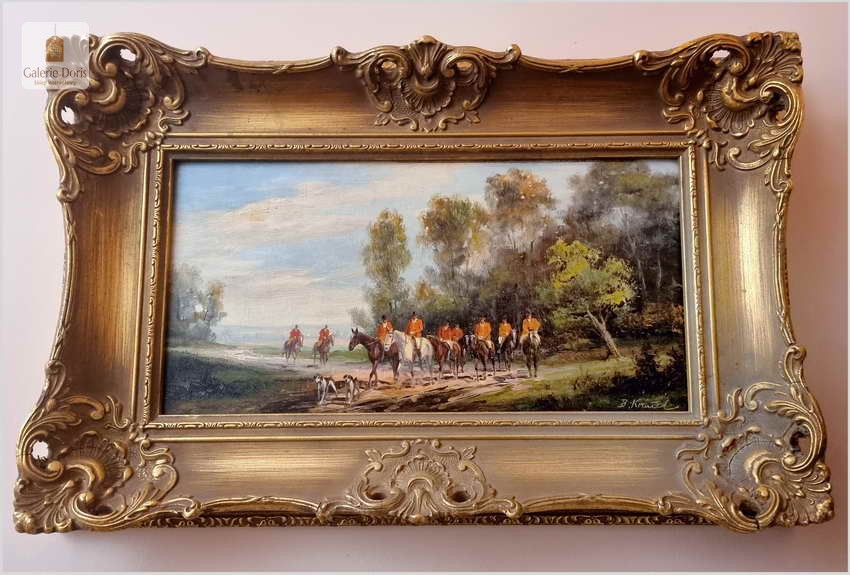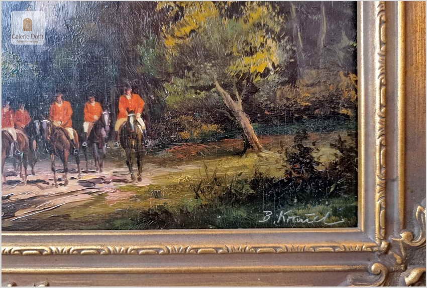 Niezwykle ciekawy, duży obraz olejny malowany na płycie, przedstawiający scenę z polowania par force. Jest to bardzo wysokiej klasy, autentyczna praca. Prezentuje doskonałą gra między światłem a cieniem na tle krajobrazu. Niebywale barwna gama kolorów. Autorem tej pracy jest znany i ceniony niemiecki artysta Bruno Krauel. Obraz malowany w technice pędzla, miejscami struktura farby wyraźnie wyczuwalna. Sygnowany odręcznie przez autora w dolnym rogu: B. Krauel. Obraz oprawiony w oryginalną, dekoracyjną ramę, z okresu powstania . Obraz godny polecenia, będzie wyjątkową ozdobą każdego pomieszczenia.