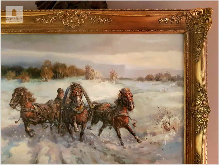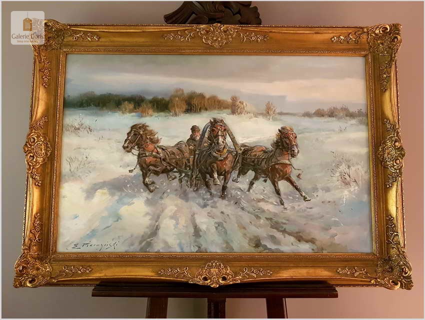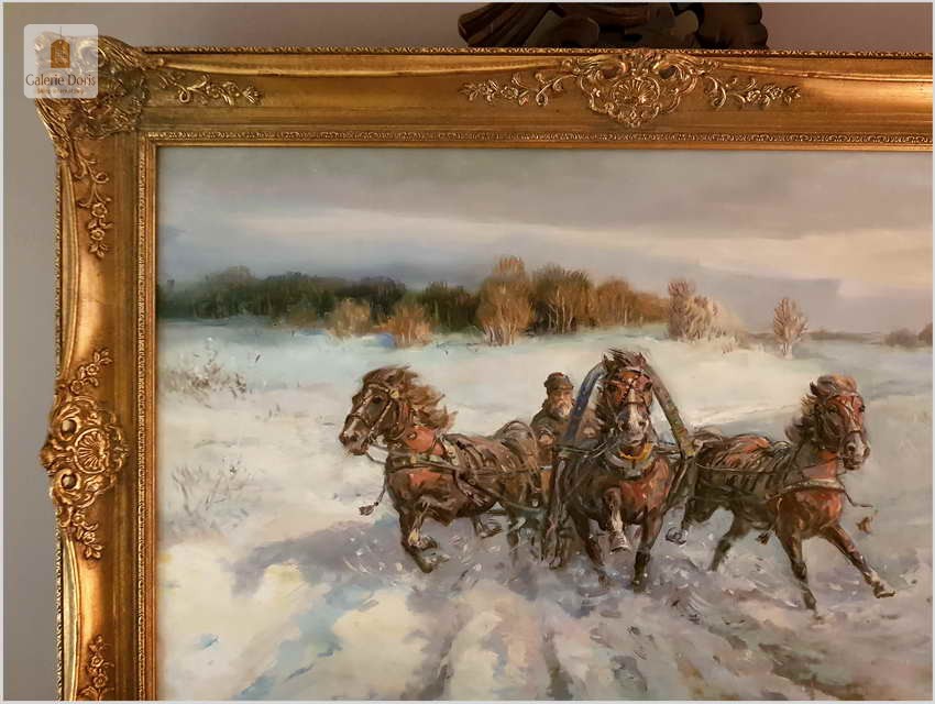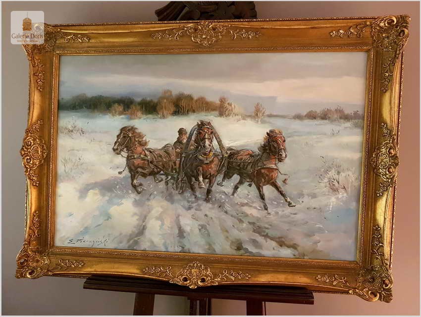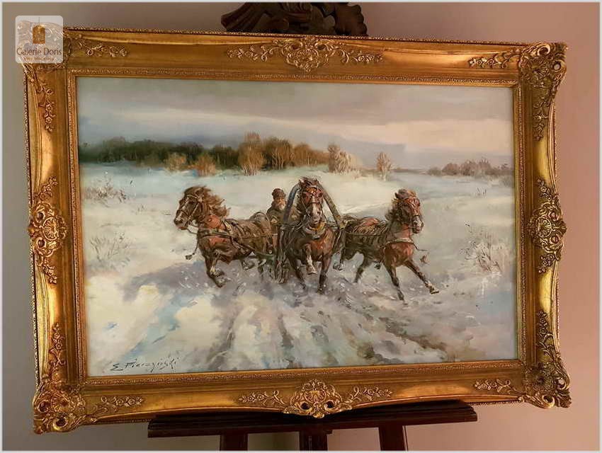Duży obraz olejny namalowany na płótnie. Przedstawia pełną ekspresji scenę pędzących saniami (trojka) zaprzęgniętymi w konie. W tle zarysowują się pagórkowate wzniesienia leśne. Doskonale uchwycona plastyczność postaci i zwierząt, dynamizm kompozycji a także subtelne niuanse kolorystyczne są charakterystyczne dla tego znakomitego malowidła. Za pomocą wysmakowanej gamy barw oraz wspaniałej gry światłocieni, wydobywającej efekt głębi, zachwycająco oddano zimową aurę kresowego pejzażu.
