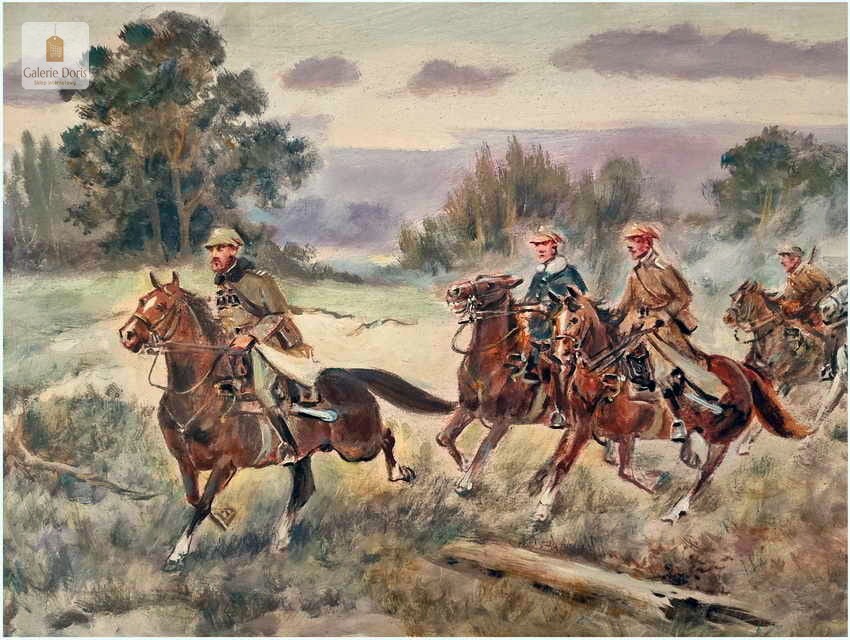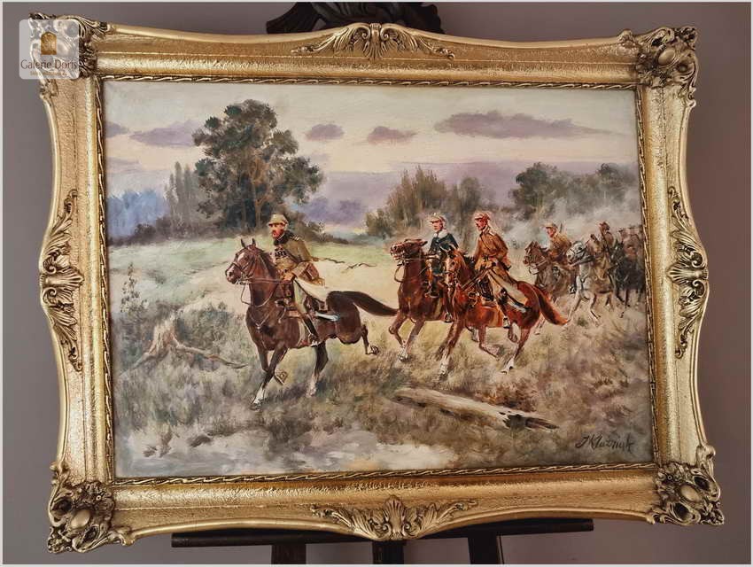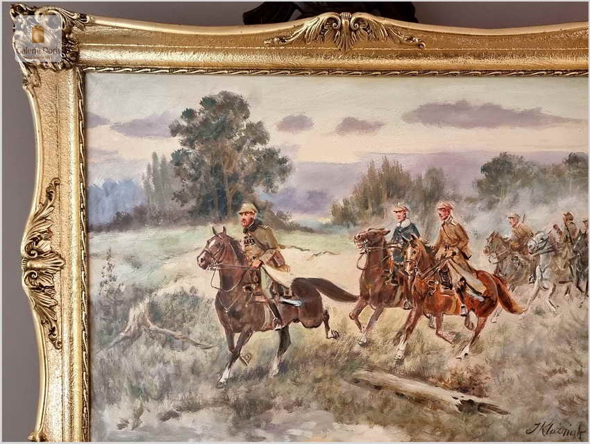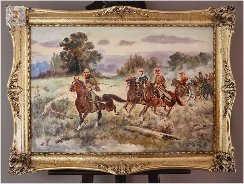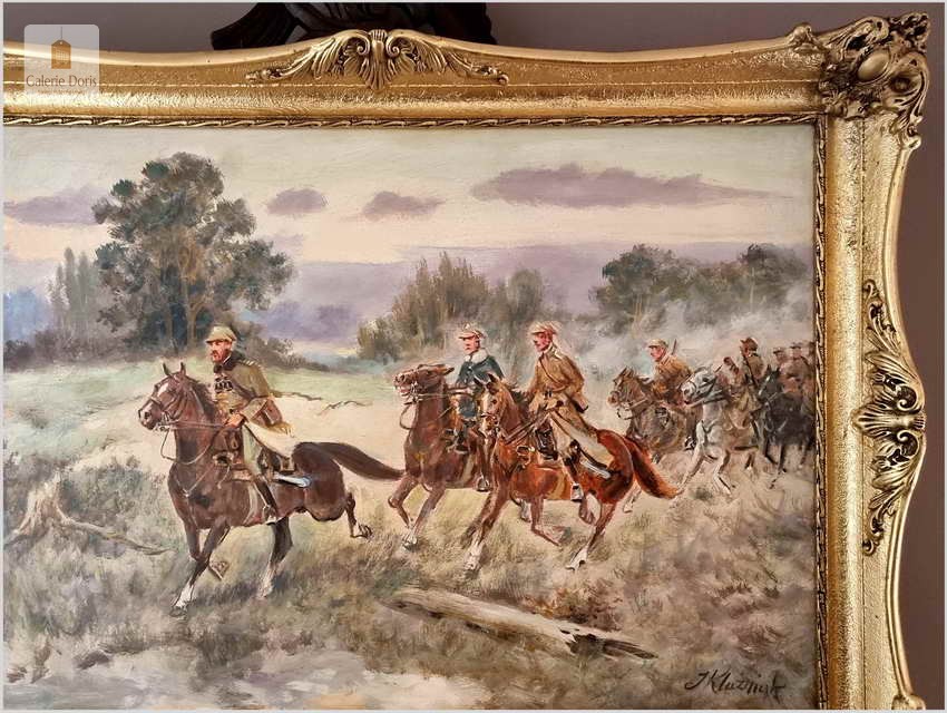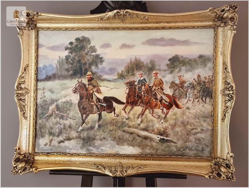 Autentyczny obraz częstochowskiego malarza Jerzego Kluźniaka, przedstawiający scenę z polskimi żołnierzami. W poziomej panoramie artysta ukazał ułanów jadących na koniach wiejską drogą przez pola nieopodal Kielecczyzny. Mężczyźni ubrani są w polskie mundury, na pierwszy planie wyłania się mjr Henryk Dobrzański pseudonim „Hubal” Po klęsce wrześniowej został bohaterem narodowym, bo nie złożył broni. Sformował Oddział Wydzielony Wojska Polskiego i kontynuował walkę z Niemcami. Żołnierze „Hubala” stoczyli kilka zwycięskich bitew. Oddział rozwiązano dwa miesiące po śmierci majora. Oddział Dobrzańskiego przeprowadził ponad trzydzieści akcji zbrojnych. Niemcy w odwecie pacyfikowali ludność cywilną. „Hubal” poległ 30 kwietnia 1940 r. pod Anielinem. Miejsce złożenia jego ciała pozostaje nieznane. Obraz bez uszkodzeń, ciekawa tematycznie i historycznie postać którą przybliżył nam malarz, który opanował sztukę malowania koni perfekcyjnie. Tematyka pracy olejnej z pewnością sprawi, że cieszyć się powinna dużym zainteresowaniem publiczności i zbieraczy, zawsze tłumnie odwiedzającej wystawy malarstwa Kossaków. Malarz często wracał do tej tematyki, malując potyczki polskich żołnierzy - Cztery lata temu w naszej ofercie mieliśmy identyczną pracę Klużniaka o dużo większych rozmiarach. Z dostępnych nam informacji malarz namalował trzy obrazy o tej tematyce. Polecamy!