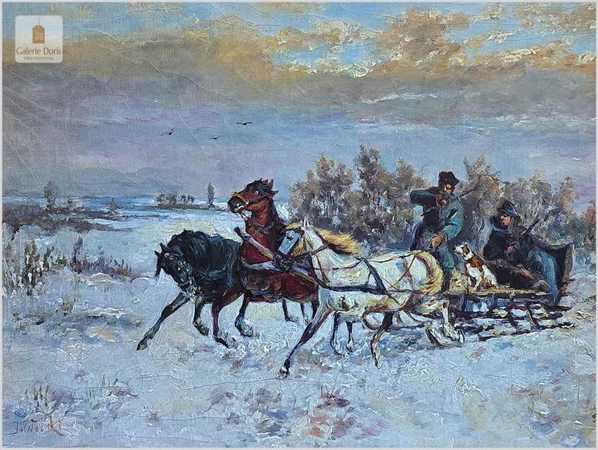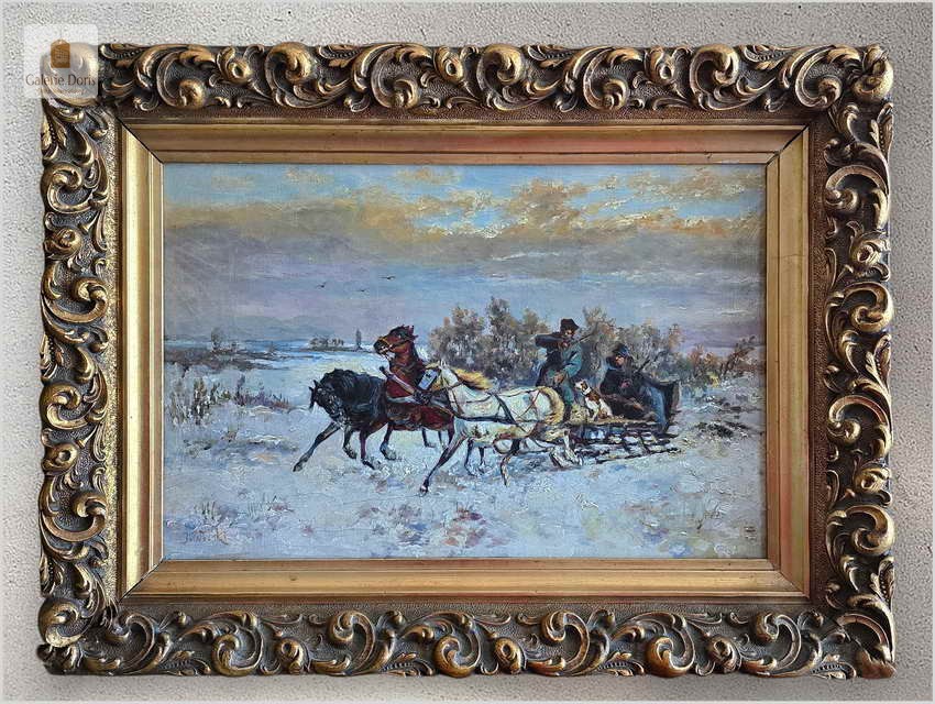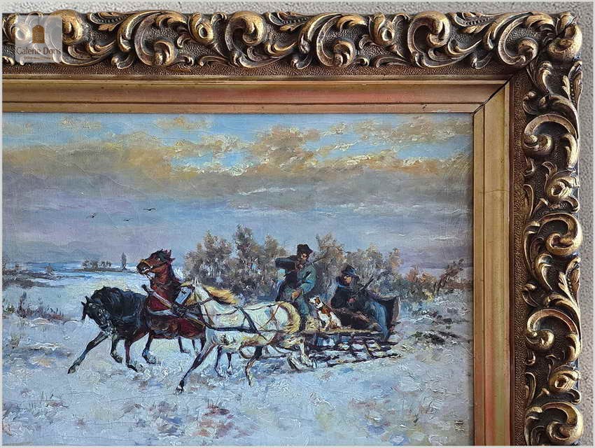 Obraz przenosi nas na zaśnieżone bezdroża, gdzie pędzi tradycyjna sanna prowadzona przez parę koni. Centralnym punktem jest dynamika ruchu – niemal słychać parskanie zwierząt i skrzypienie płozy na śniegu. W saniach dostrzegamy podróżnych oraz towarzyszącego im psa, co nadaje scenie narracyjnego, niemal literackiego charakteru. Kluczową rolę odgrywa tu światło przedzierające się przez chmury, które oświetla sylwetki koni i wydobywa z tła detale zimowego krajobrazu. Bogata, luksusowa rama w kolorze antycznego złota stanowi doskonałe dopełnienie tej dynamicznej kompozycji. To dzieło nie tylko zachwyca estetyką, ale również buduje w pomieszczeniu atmosferę szlacheckiej tradycji i spokoju dawnych lat.