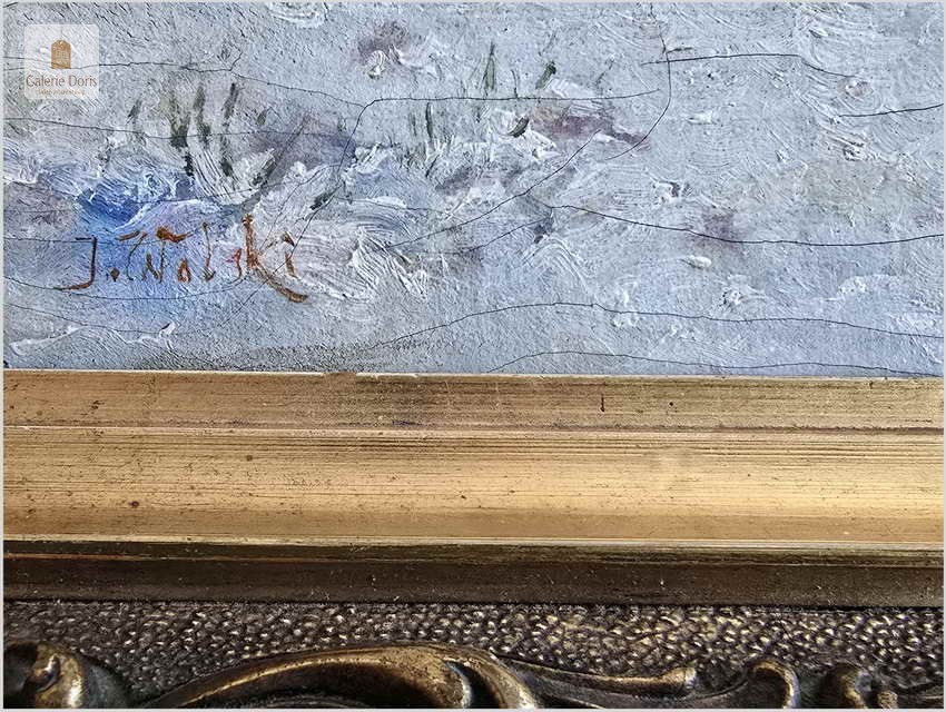 • Atmosfera: Artysta po mistrzowsku uchwycił chłodną aurę zimowego popołudnia, gdzie niskie słońce odbija się w zmarzniętym śniegu, tworząc bogatą paletę błękitów, fioletów i ugierów.
