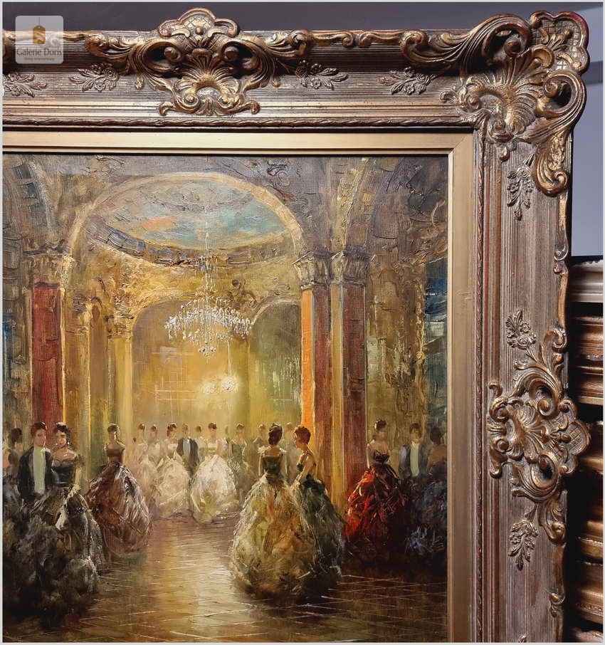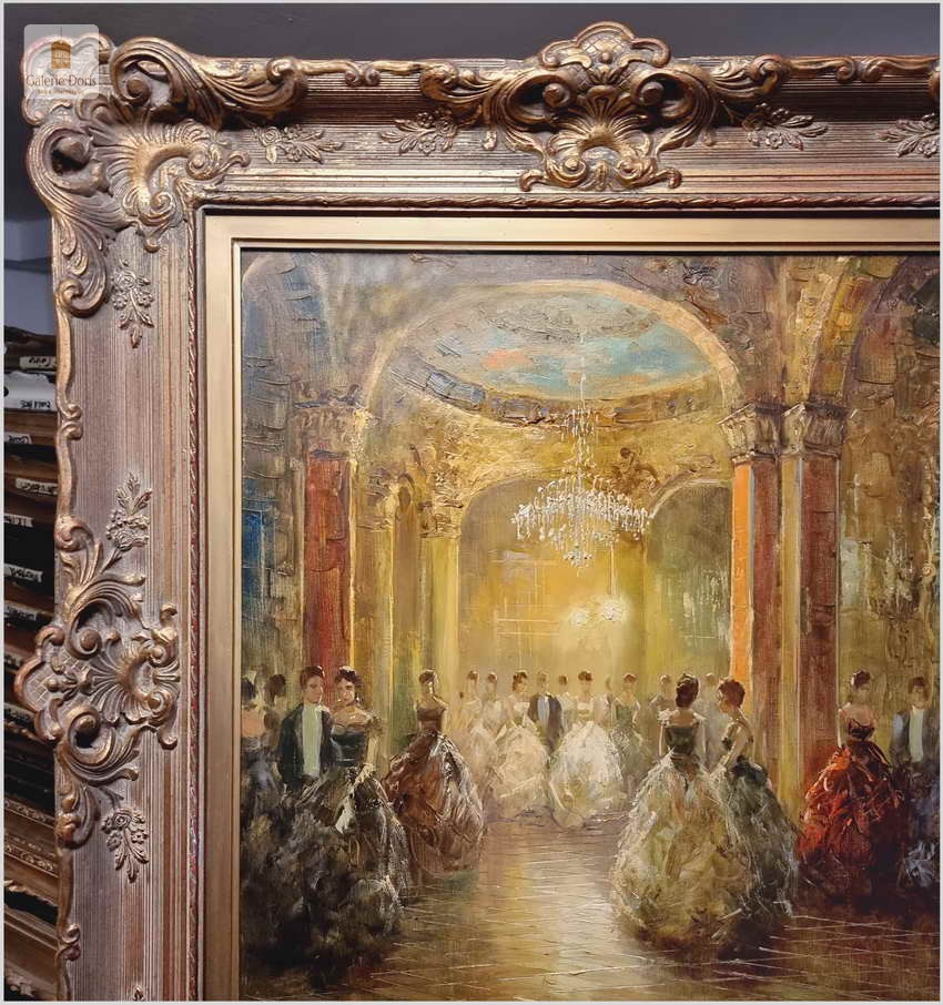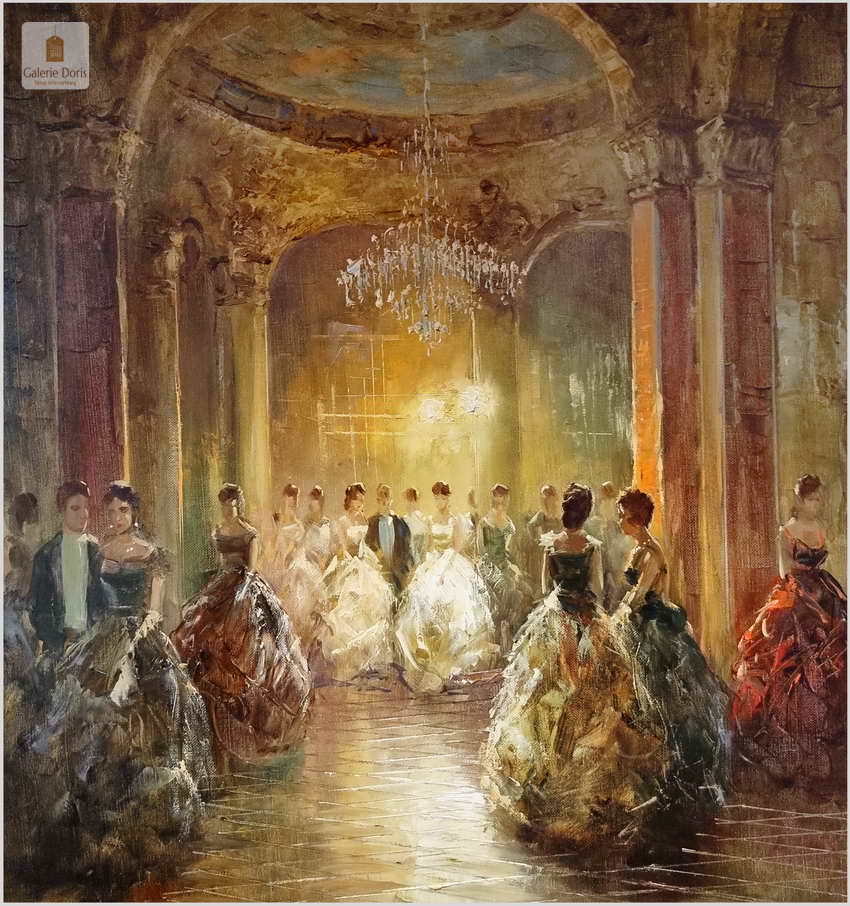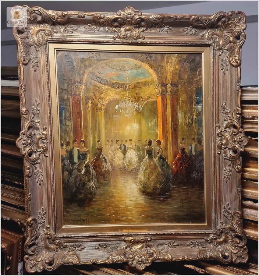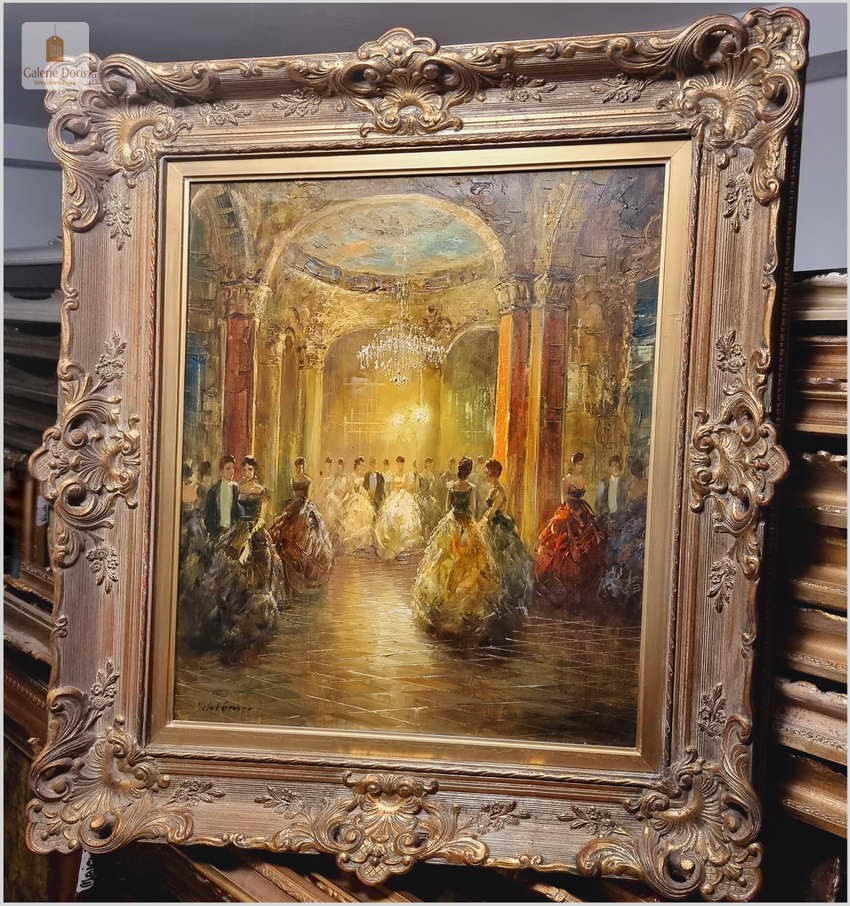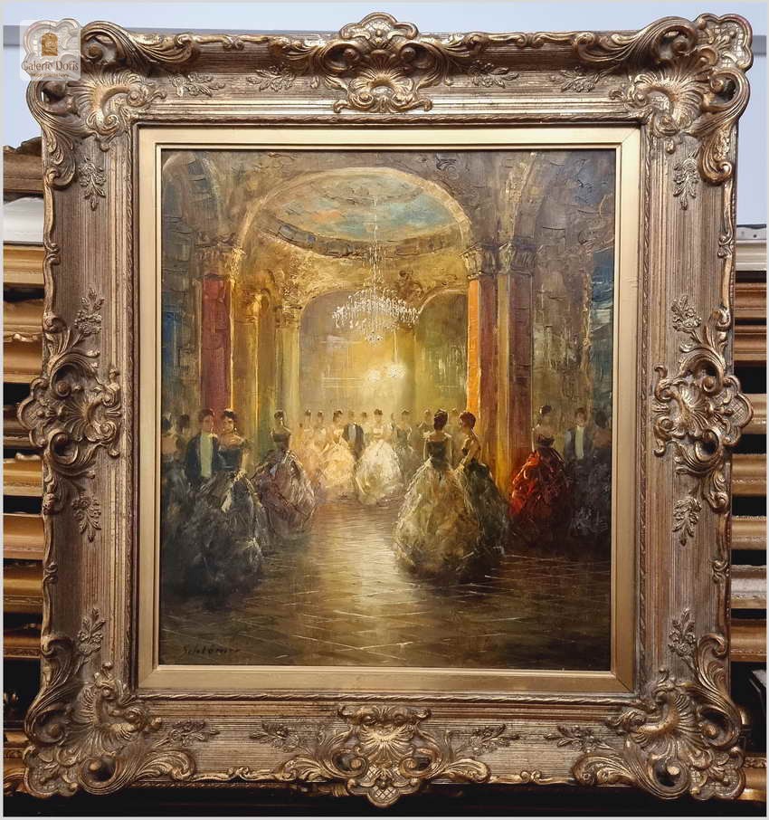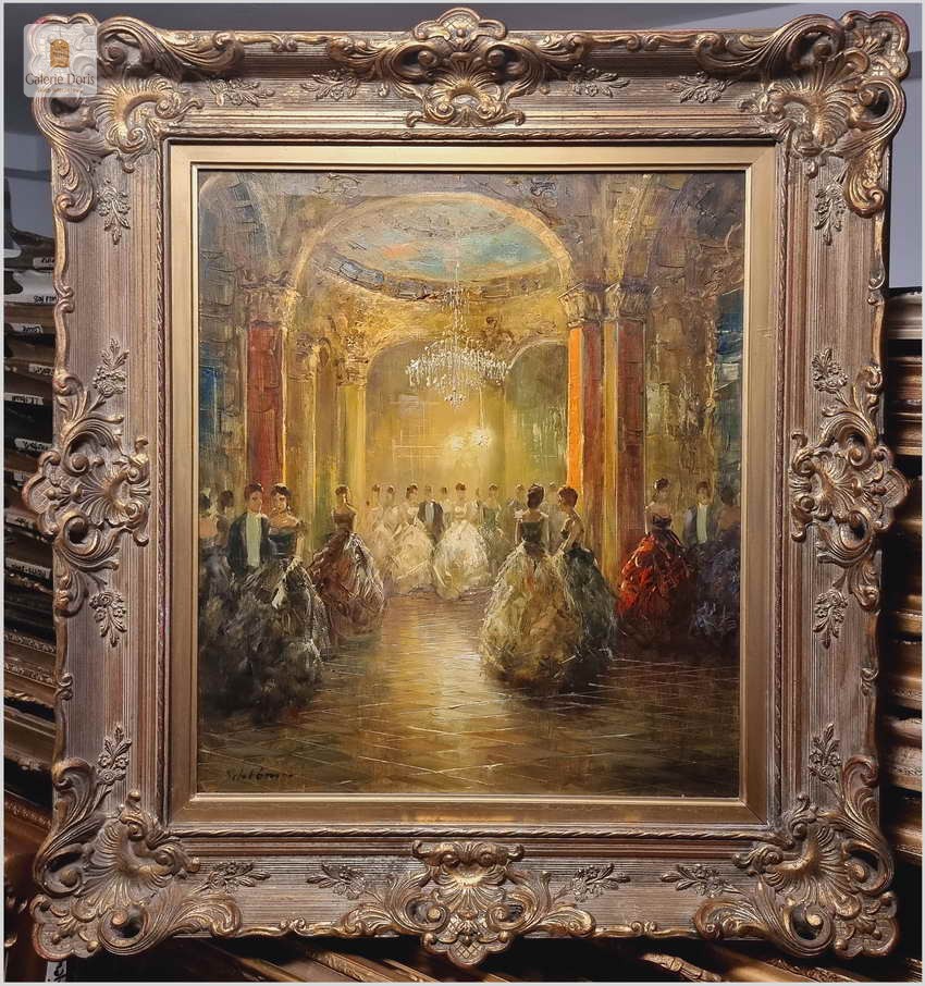 Polecamy wyjątkowy obraz olejny, artysta notowany na rynku sztuki: Richard Schlomer ur. 1921 roku w Monachium, studiował w Wyższej Szkole Sztuki w Monachium. Schlomer miał wystawy w Monachium, Dusseldorfie oraz Francji. Piękny olej na płótnie - Idea balów, nie jest przecież nam obca, nasi dziadkowie czy pradziadkowie organizowali z pewnością gustowne przyjęcia.
