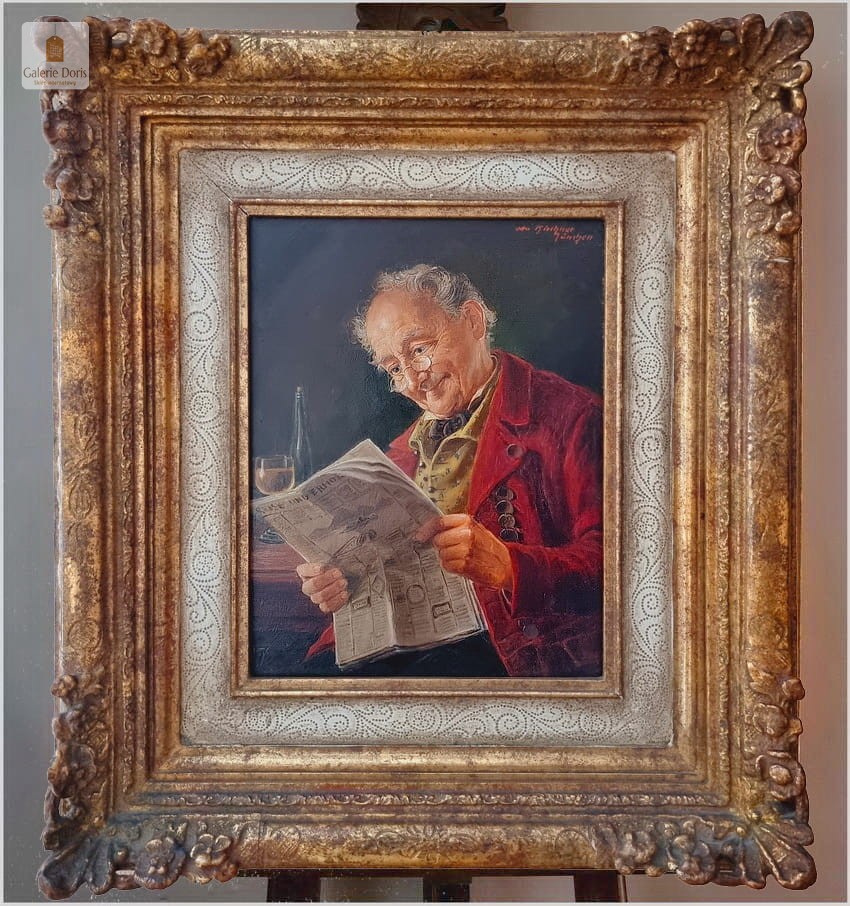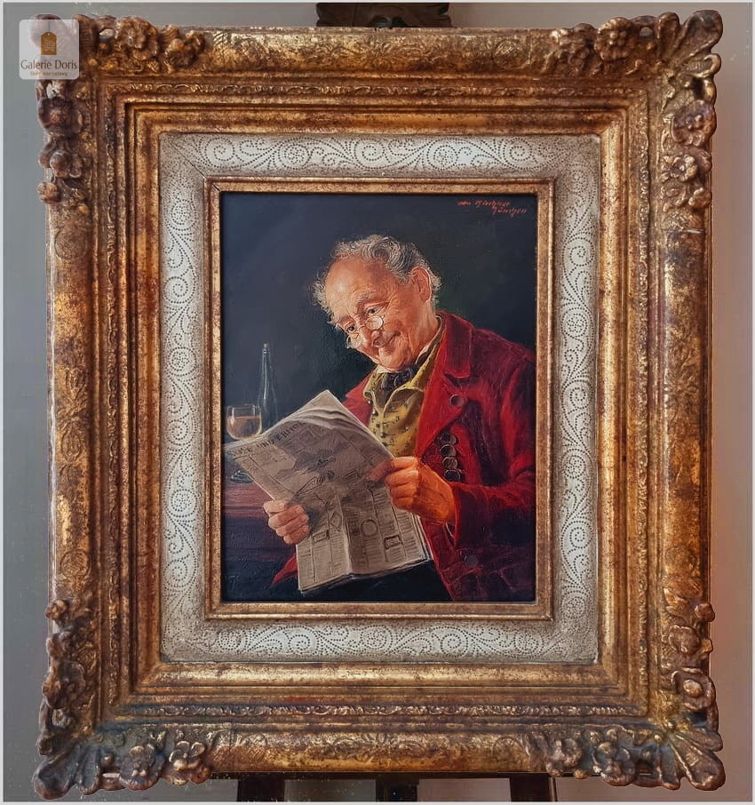 Piękny, autentyczny obraz w ofercie galerii. Obraz autorstwa wybitnego niemieckiego malarza scen rodzajowych. Jeden z lepszych obrazów które wyszły spod jego pędzla. Obraz wykonany w technice pędzla farbami olejnymi na sklejce. Praca o bardzo dużych walorach artystycznych, jak i niezwykle dekoracyjnych. Obraz sygnowany odręcznie przez artystę w prawym górnym narożniku: Otto Kirchner München. Dzieło osadzone w starą przedwojenną przestrzenną ramę w kolorze złotym. Malarz niezwykle popularny i ceniony na zagranicznych aukcjach a jego obrazy ze względu na tematykę osiągają wysokie ceny. Obraz będzie niebanalnym uzupełnieniem jako dekoracja salonu lub kolekcji.