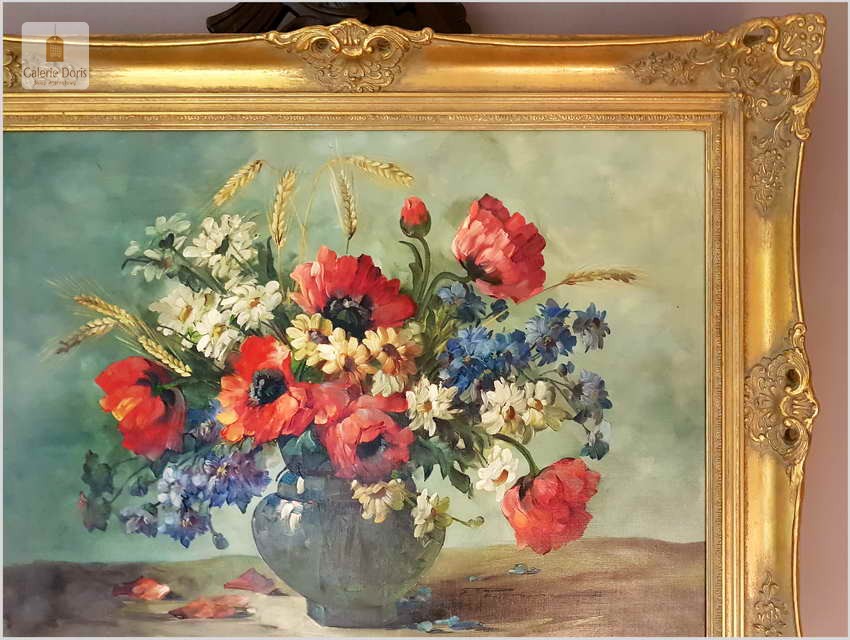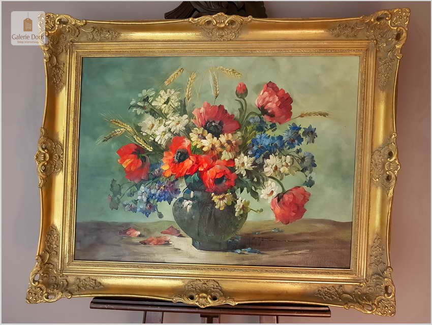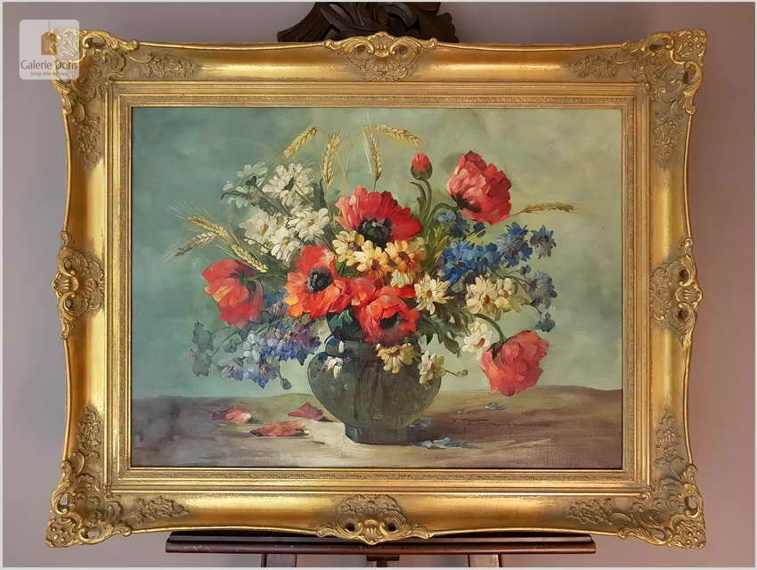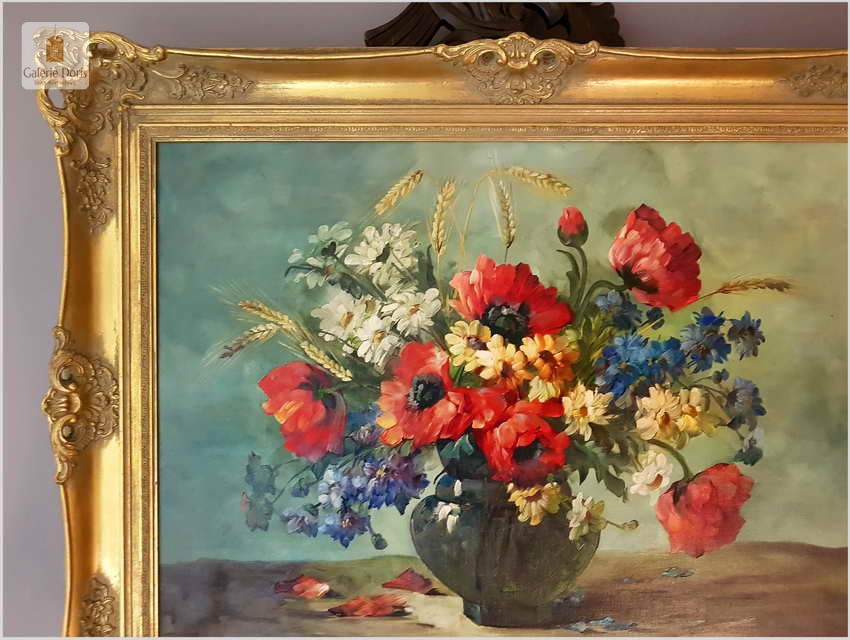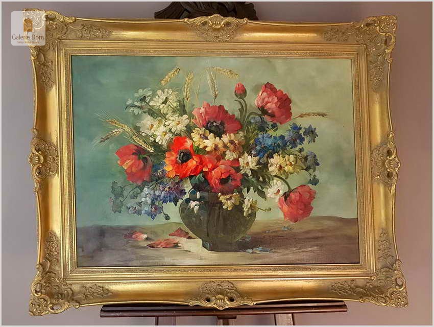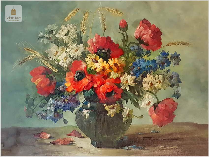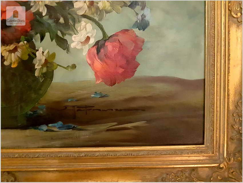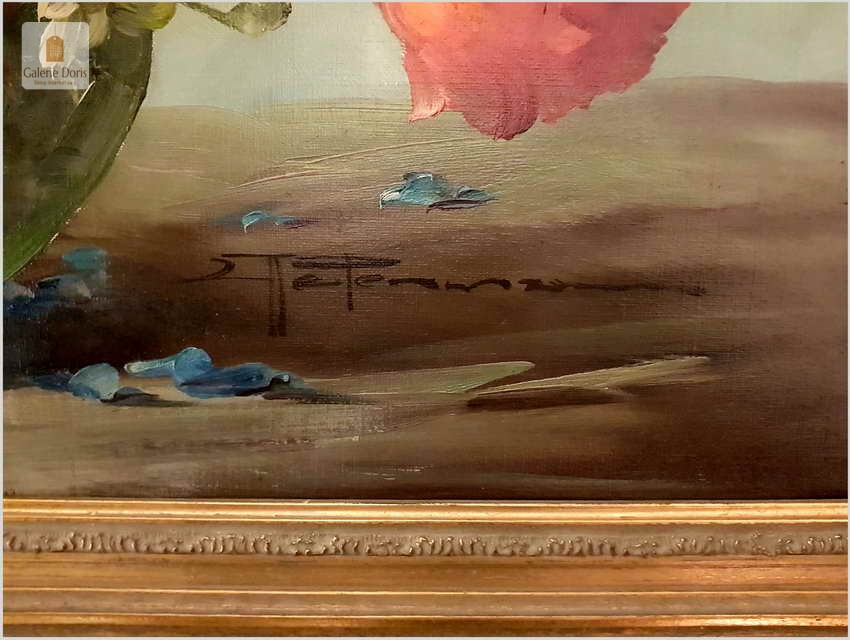 Proponujemy Państwu dobrą pracę olejną, niemieckiej malarki martwych natur. Hedwig Petermann to malarka, która głównym tematem malarskim jaki uprawiała były subtelne a zarazem piękne kompozycje kwiatowe. Uczennica Wilhelma Ecksteina w Düsseldorfie. Malowała martwe natury z owocami i kwiatami, które wyróżniają się dobrą kompozycją, szlachetnym kolorytem, miękkością modelunku i łagodnym nastrojem.