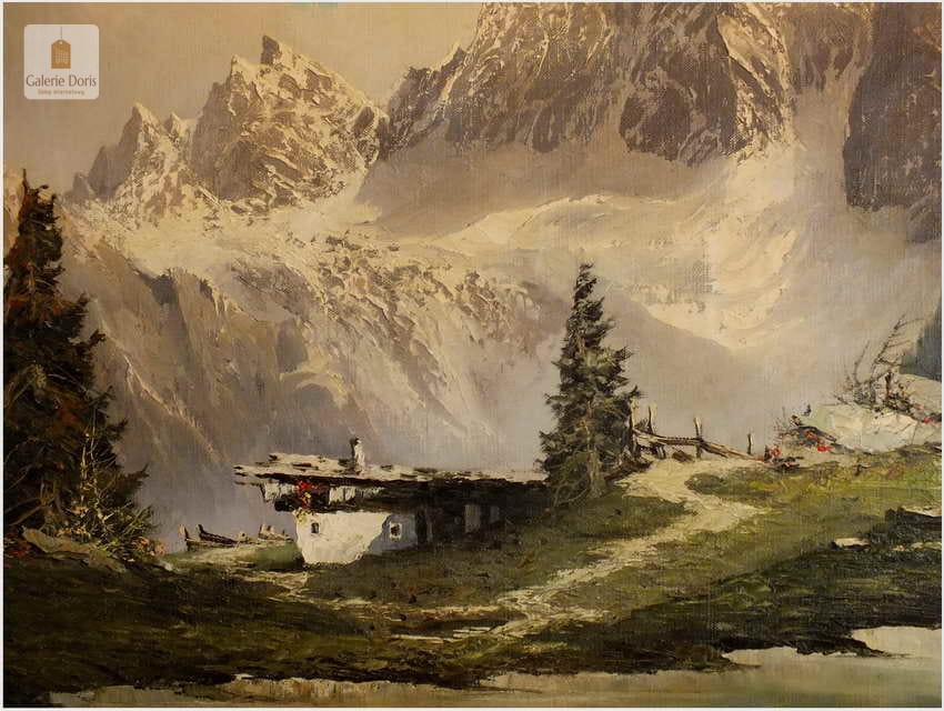 Bardzo dekoracyjny obraz olejny na płótnie, przedstawiający malownicze realistycznie malowane alpy. Wspaniale oddano partię nieba oraz rozległy widok na otaczające go góry. Ten relaksujący pejzaż odznacza się delikatnie prowadzonymi liniami pędzla i wysmakowaną grą barw.