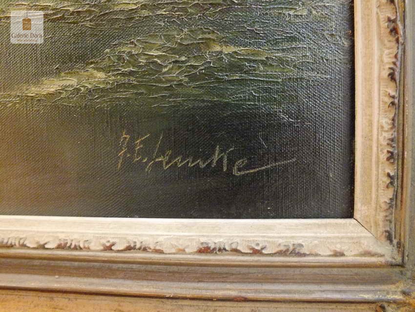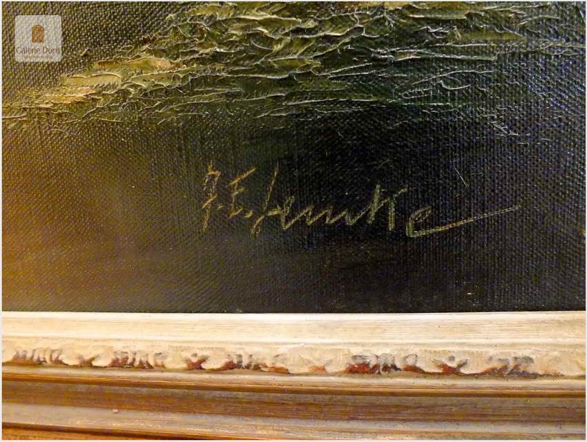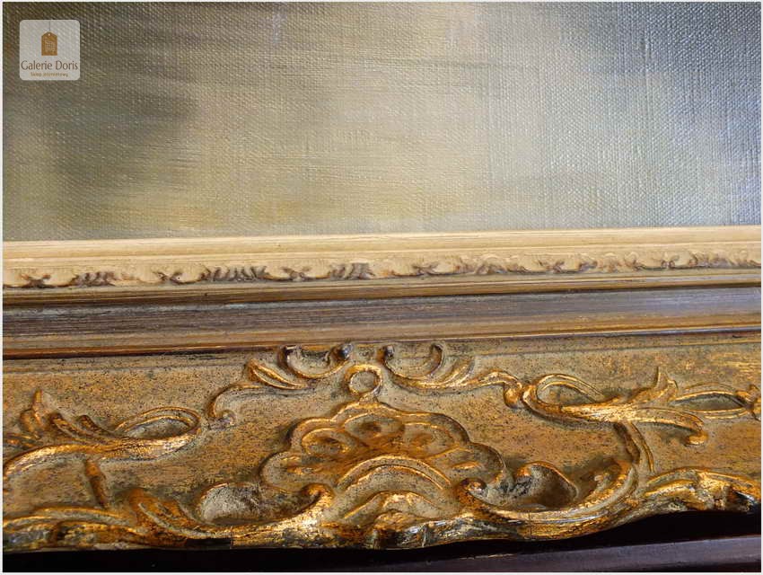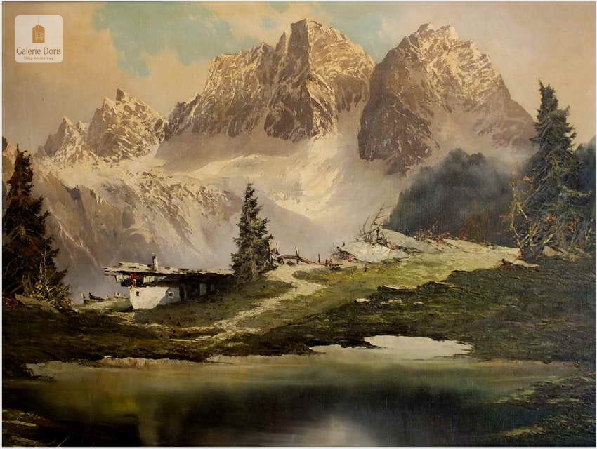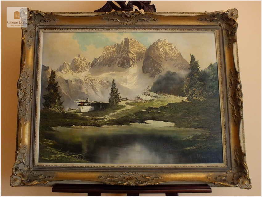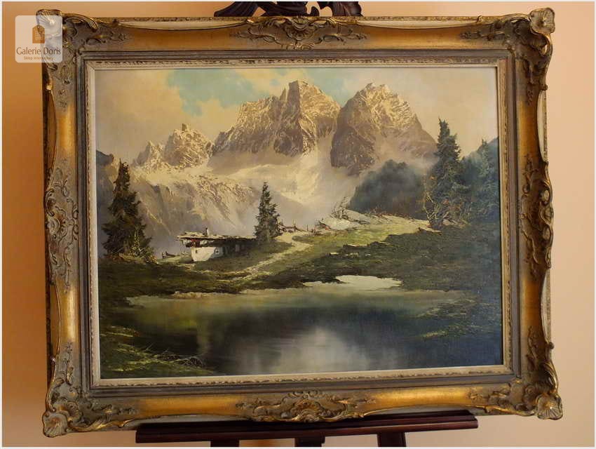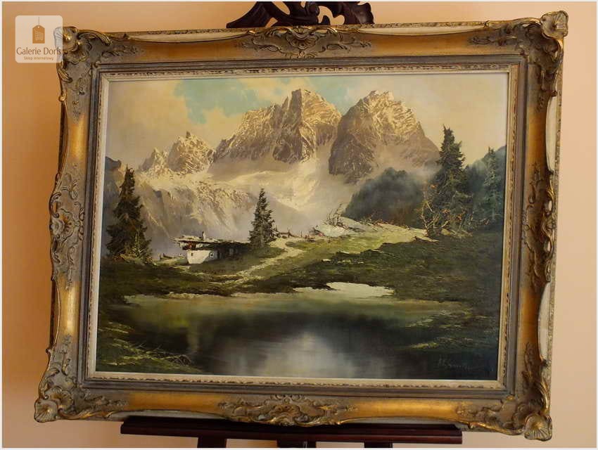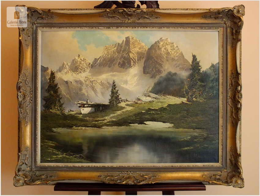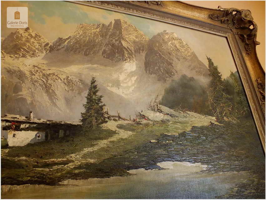 Przedmiotem aukcji, którą szczególnie pragnę polecić miłośnikom dobrego malarstwa jest prześliczny duży obraz olejny malowany na płótnie, cenionego niemieckiego malarza J.E. Lemke. Niezwykle piękny obraz olejny na płótnie, przedstawiający najwyższe szczyty gór w Niemczech Zugspitze. Obraz odznacza się dobrą perspektywą oraz wysmakowaną grą barw, podkreślającą subtelne niuanse i kontrasty palety kolorystycznej. Cechuje go świetna technika malarska. Struktura farby wyraźnie wyczuwalna pod palcami. Obraz oprawiony jest w przestrzenną, grubą ramę wykonaną z drewna. Złocona rama ozdobiona jest misternymi sztukateriami. Płótno sygnowane w prawym dolnym rogu. Pozostaje tylko gorąco zachęcić do oglądnięcia poniżej fotek dobrego wysmakowanego malarstwa.