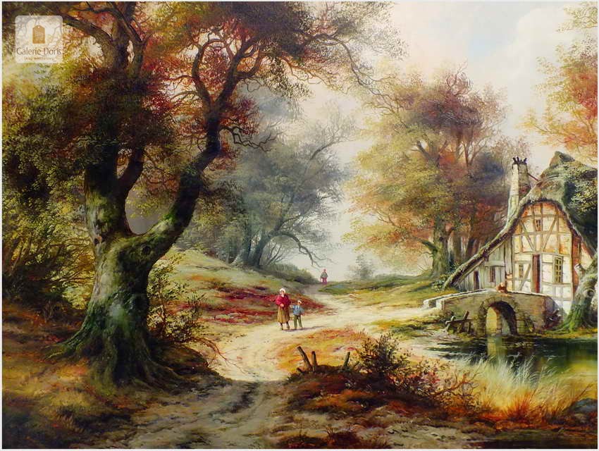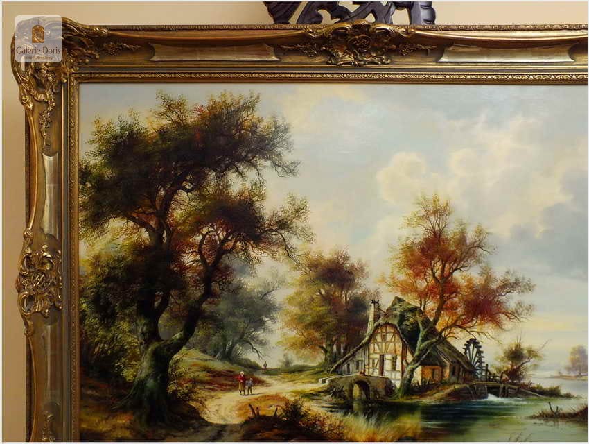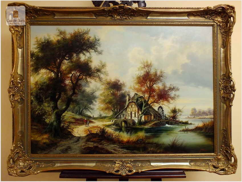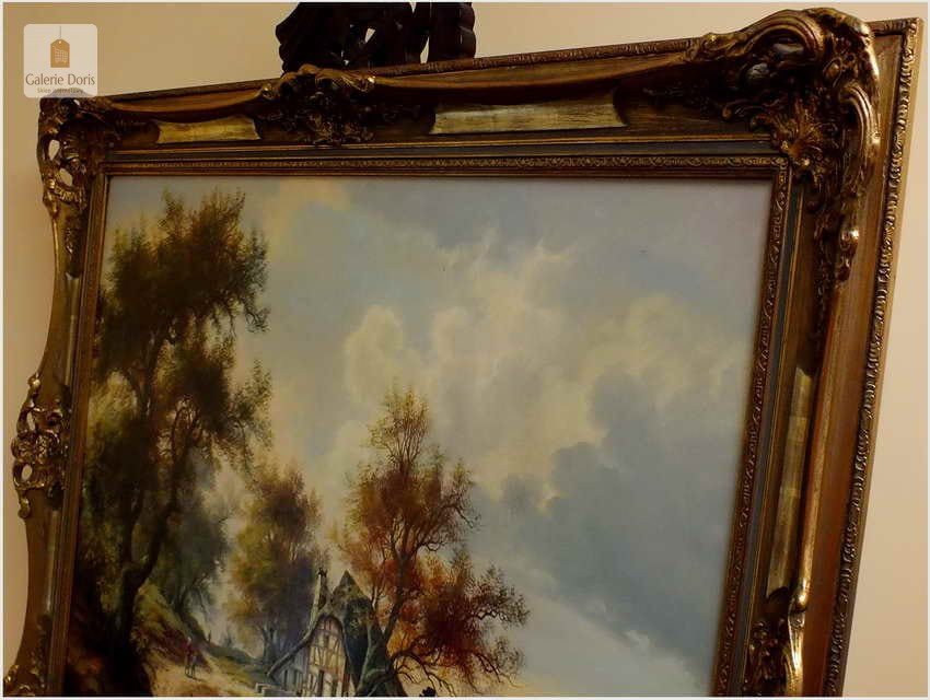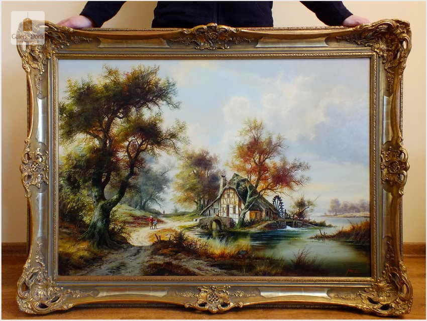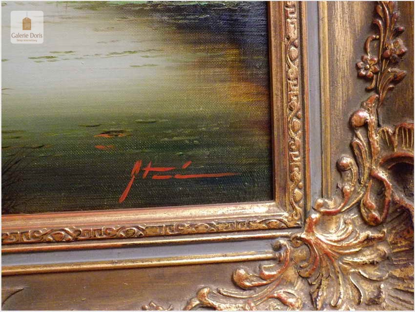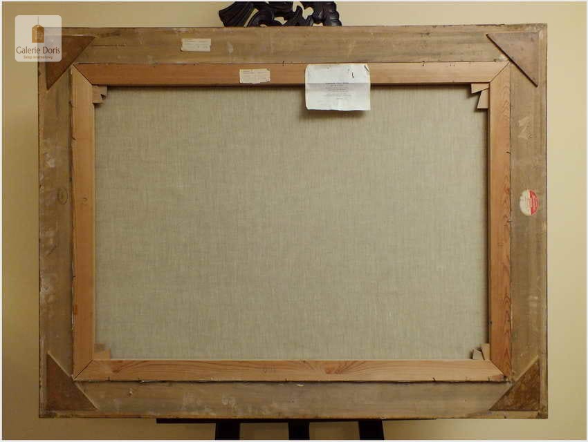 Jego styl malarski wyróżnia się przede wszystkim zastosowaniem tematyki romantycznej, ciepłych subtelnie oddanych kolorów. Jego prace często są spotykane na europejskich aukcjach. Ten obraz jest jego bardzo dobrą pracą z późniejszych lat jego twórczości. Piękną dodatkową ozdobą jest bardzo bogata rama o konstrukcji drewnianej zdobiona sztukaterią w stanie bardzo dobrym. Całość prezentuje się wspaniale. Będzie z pewnością pięknym eksponatem w Państwa kolekcji, domu.
