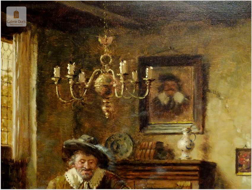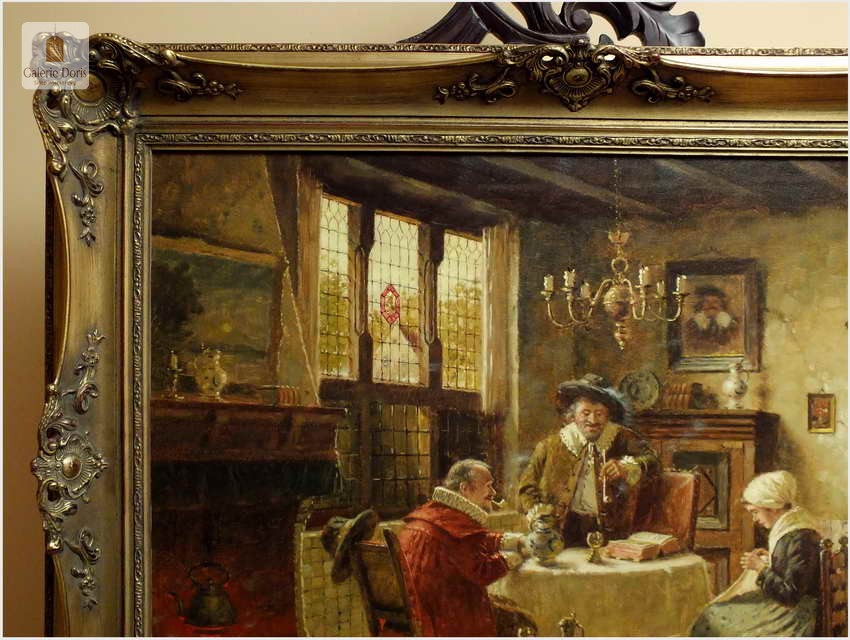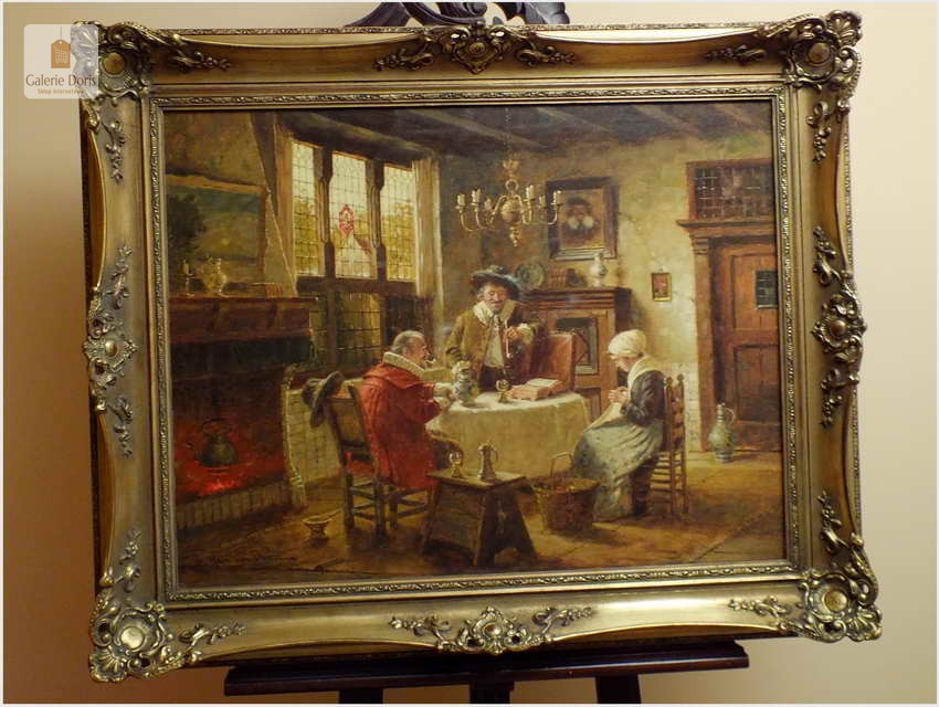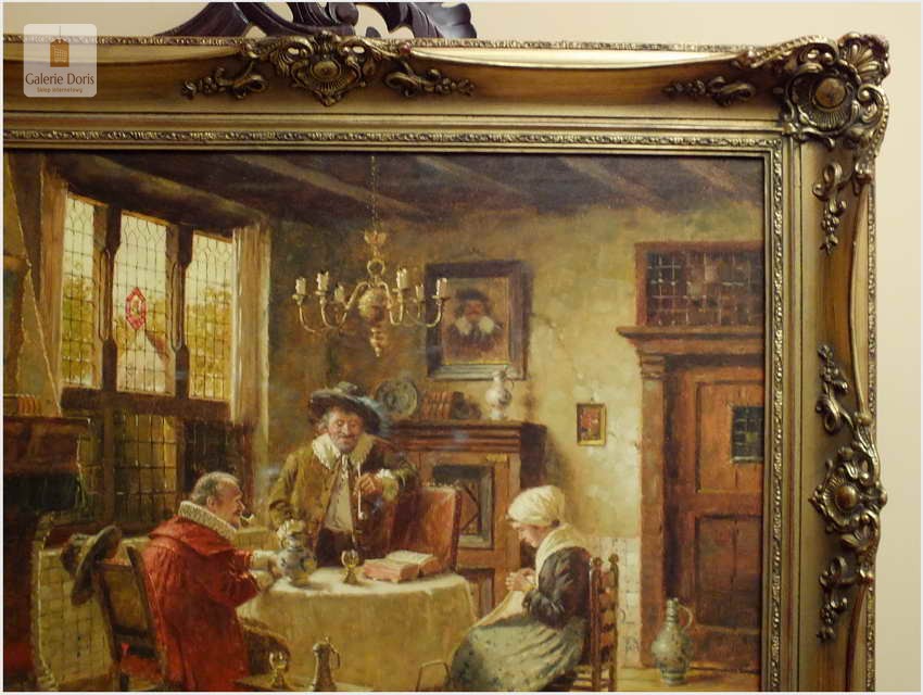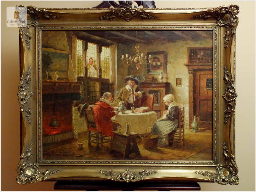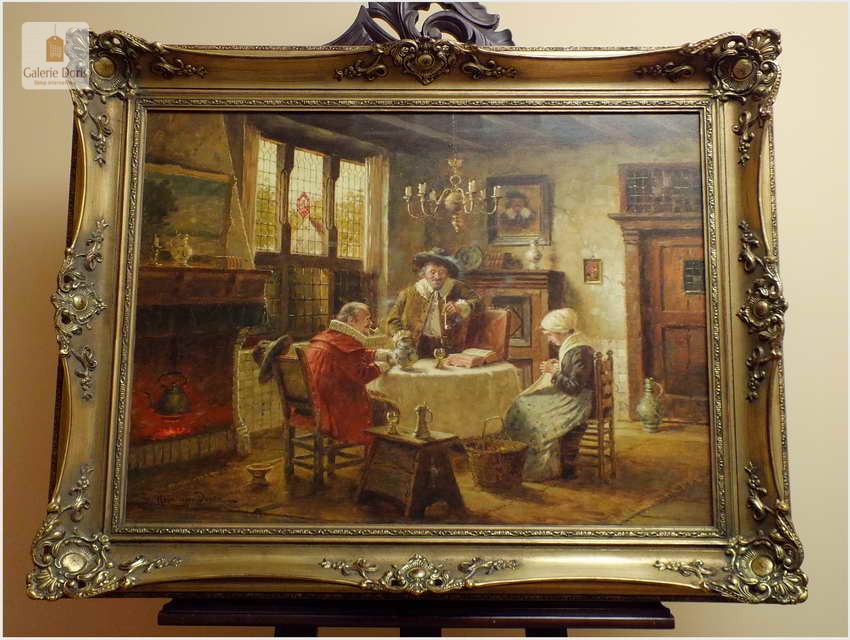 Polecam stary obraz olejny pędzla znanego malarza niemieckiego Hein Van Dorena. Zachwycająco oddał plastyczność malowanych postaci oraz ich otoczenia, podkreślił to finezyjnymi efektami światłocieniowymi a także wyśmienitą grą niuansów barwnych. Ten subtelnie malowany obraz cechuje znakomita technika malarska. Obraz bezpośrednio nawiązuje do dzieła XVII-wiecznego malarstwa. Oprawę malowidła stanowi przestrzenna, gruba rama wykonana z drewna. Złoconą ramę bogato dekorują kunsztowne sztukaterie. W rzeczywistości obraz jest jeszcze bardziej urzekający niż na załączonych poniżej zdjęciach. Stan płótna dobry, bez uszkodzeń - Obraz sygnowany jest w dolnym rogu. Do obrazu dołączamy numerowane hologramem zaświadczenie z Galerii.
