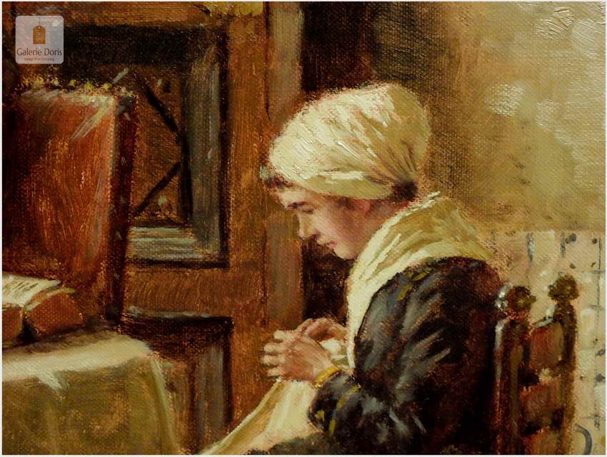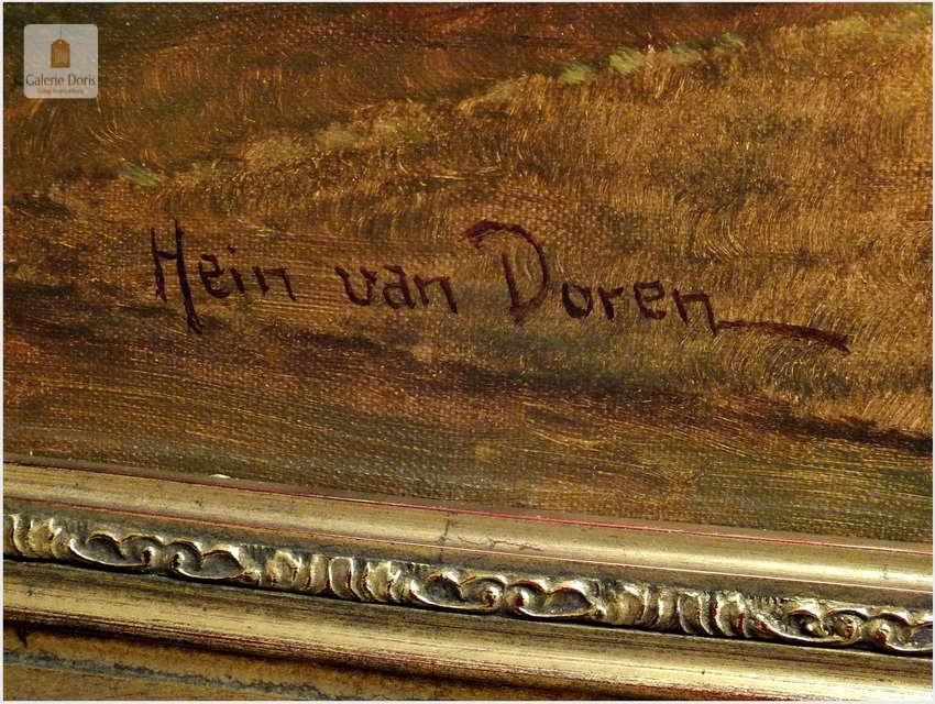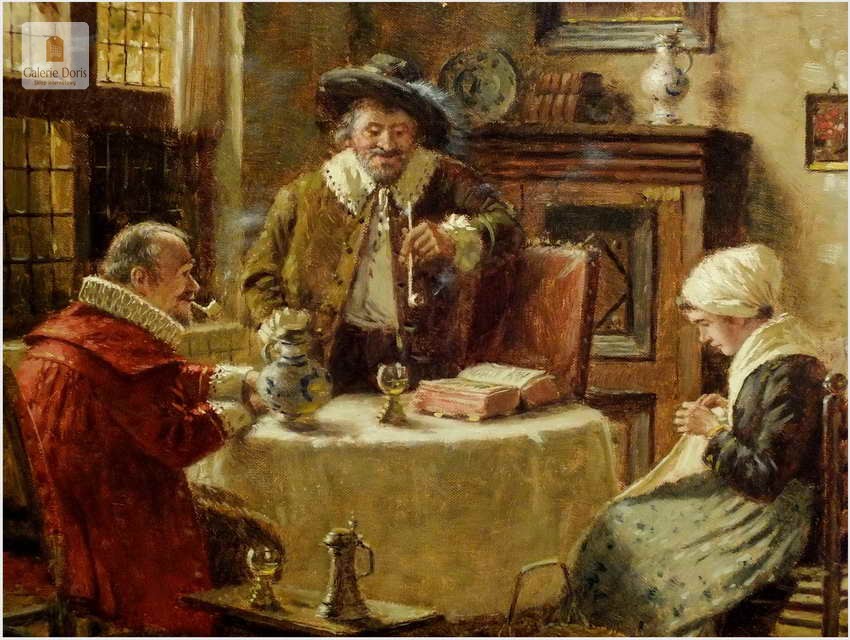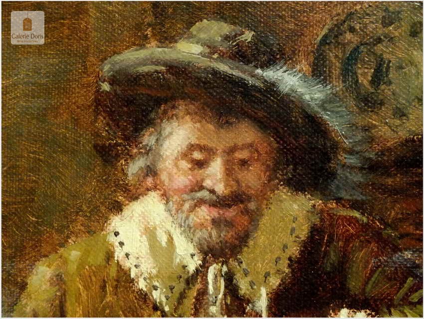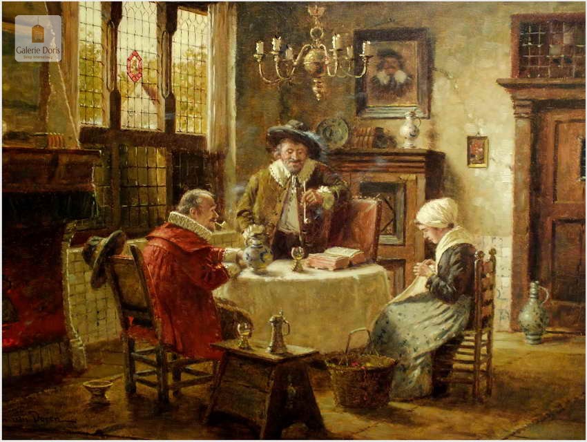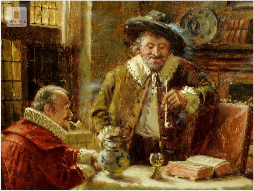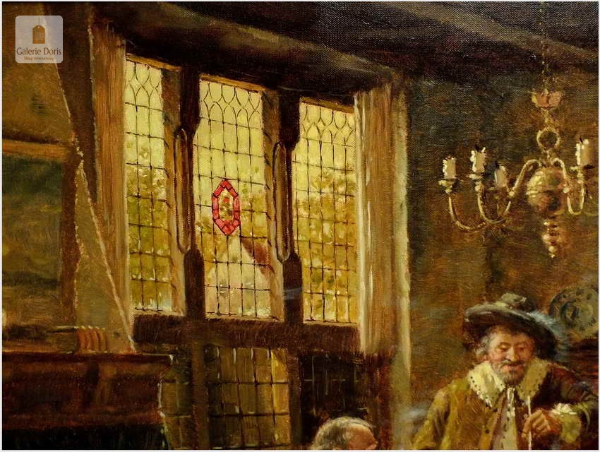 Polecam stary obraz olejny pędzla znanego malarza niemieckiego Hein Van Dorena. Zachwycająco oddał plastyczność malowanych postaci oraz ich otoczenia, podkreślił to finezyjnymi efektami światłocieniowymi a także wyśmienitą grą niuansów barwnych. Ten subtelnie malowany obraz cechuje znakomita technika malarska. Obraz bezpośrednio nawiązuje do dzieła XVII-wiecznego malarstwa. Oprawę malowidła stanowi przestrzenna, gruba rama wykonana z drewna. Złoconą ramę bogato dekorują kunsztowne sztukaterie. W rzeczywistości obraz jest jeszcze bardziej urzekający niż na załączonych poniżej zdjęciach. Stan płótna dobry, bez uszkodzeń - Obraz sygnowany jest w dolnym rogu. Do obrazu dołączamy numerowane hologramem zaświadczenie z Galerii.