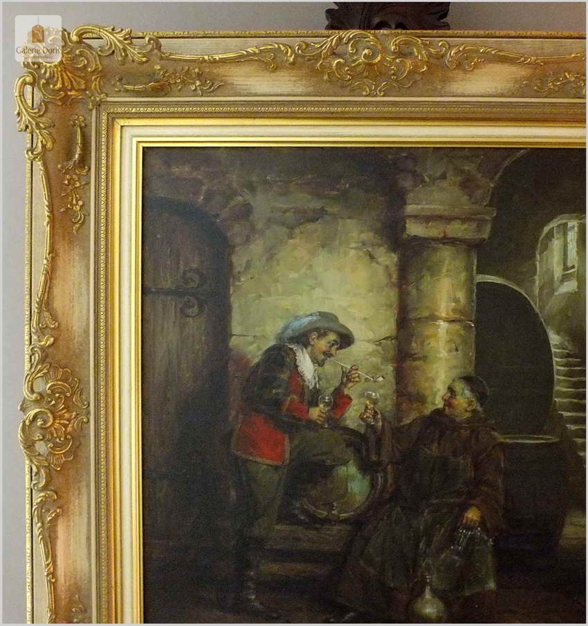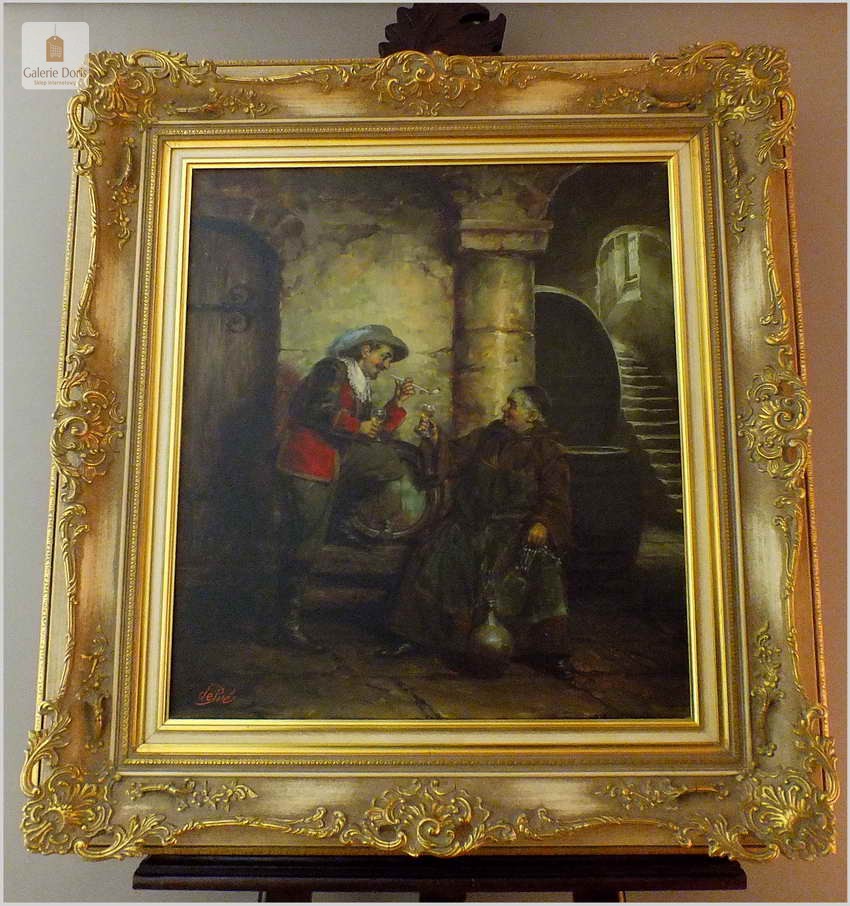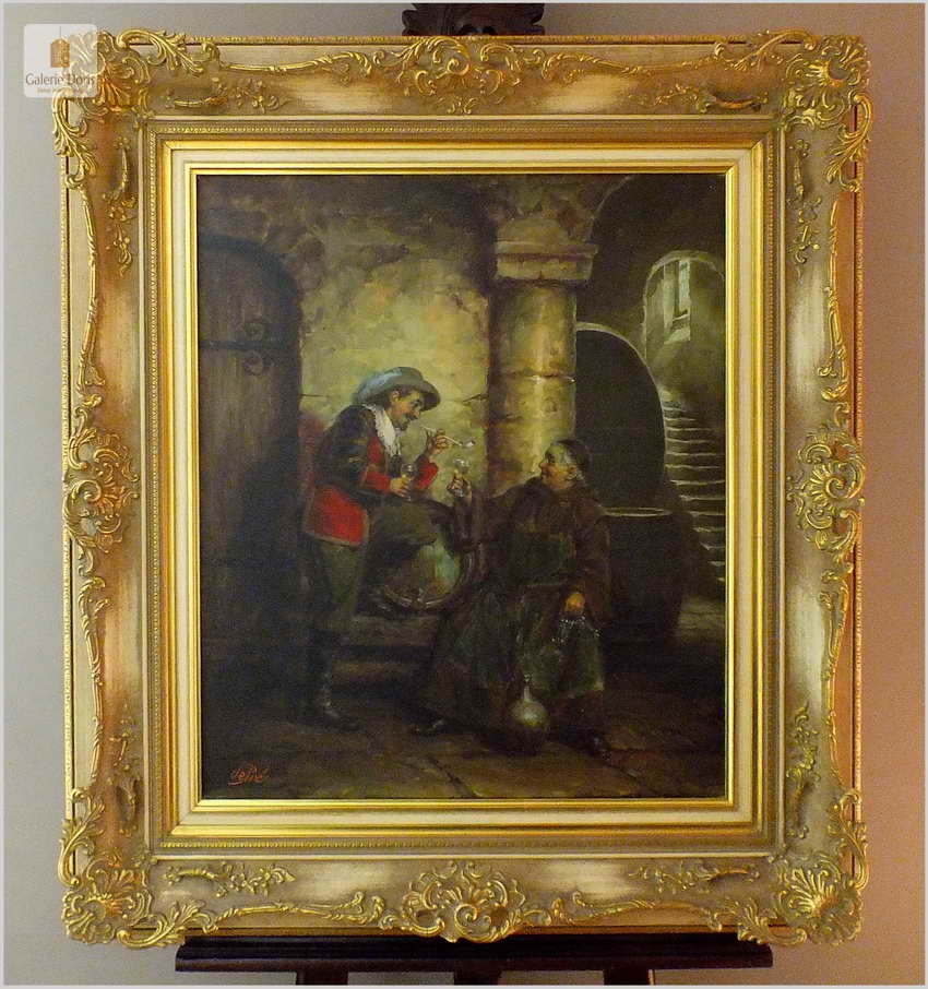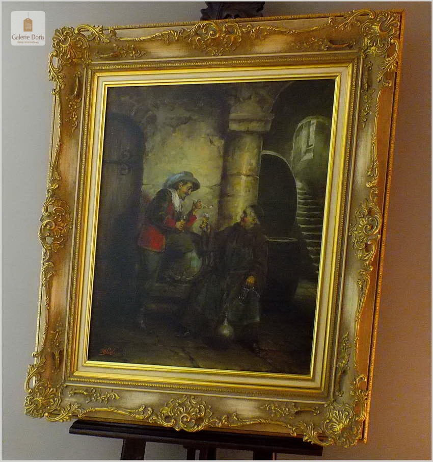 Polecamy stary obraz olejny pędzla znanego malarza niemieckiego Willi DePré. Zachwycająco oddał niesamowicie plastyczność malowanych postaci oraz ich otoczenia, całość podkreślona została finezyjnymi efektami światłocieniowymi a także wyśmienitą grą niuansów barwnych. Ten subtelnie malowany obraz cechuje znakomita technika malarska. Obraz bezpośrednio nawiązuje do dzieła XVII-wiecznego malarstwa. Oprawę malowidła stanowi przestrzenna, gruba rama wykonana z drewna. Złoconą ramę bogato dekorują kunsztowne sztukaterie. Obraz sygnowany jest w lewym dolnym rogu ramy. Gwarantujemy profesjonalnie zabezpieczoną przesyłkę kurierem.