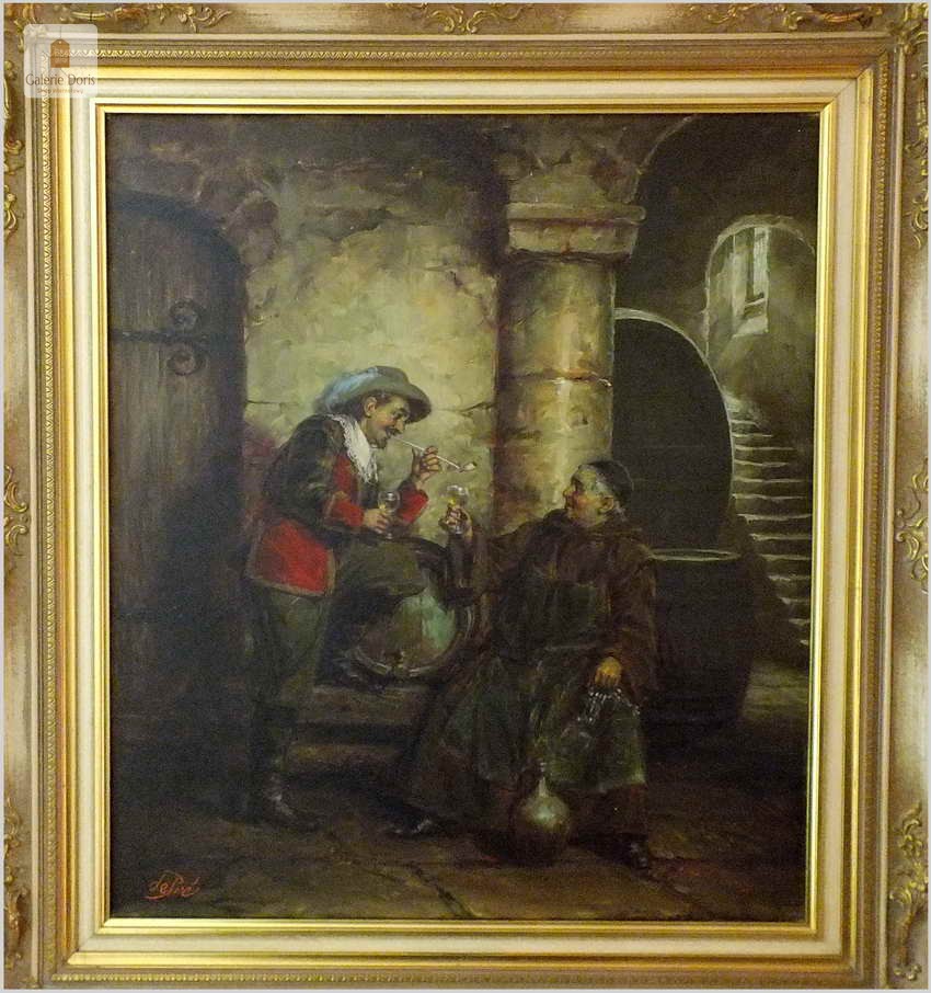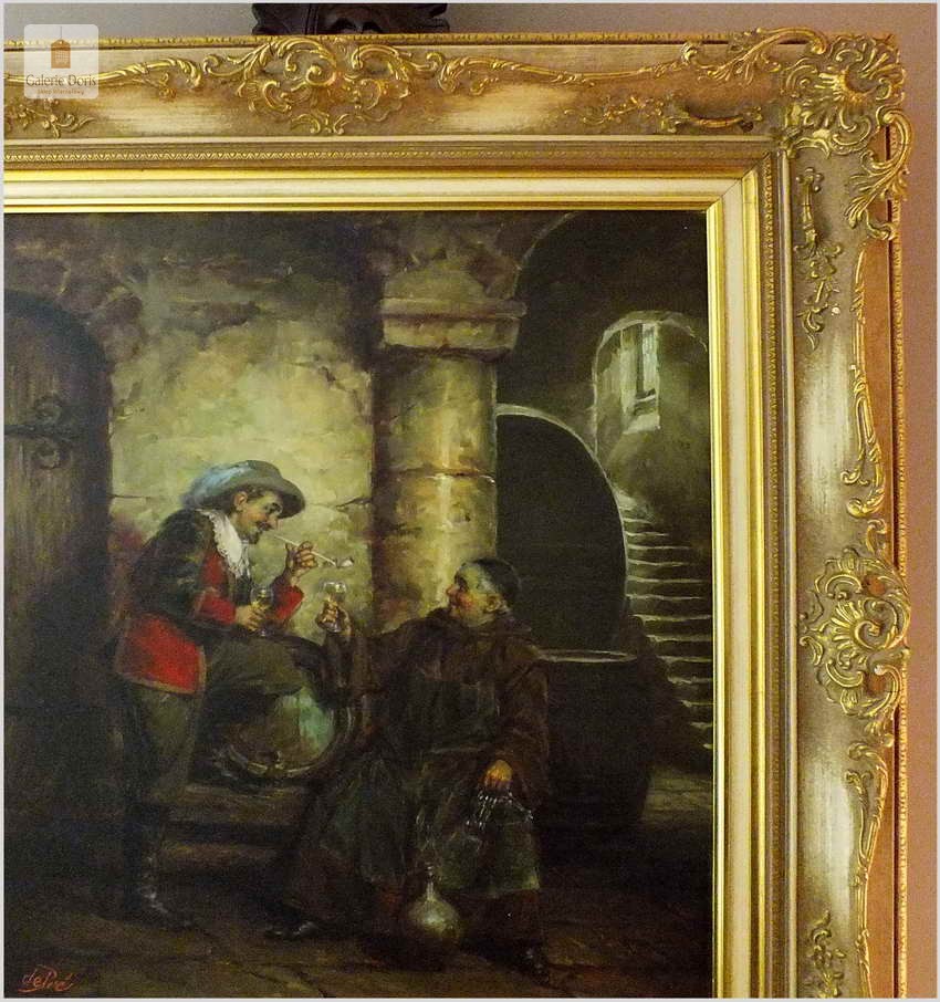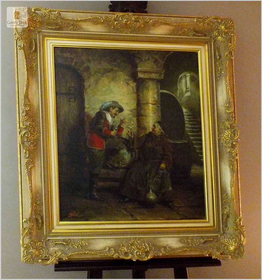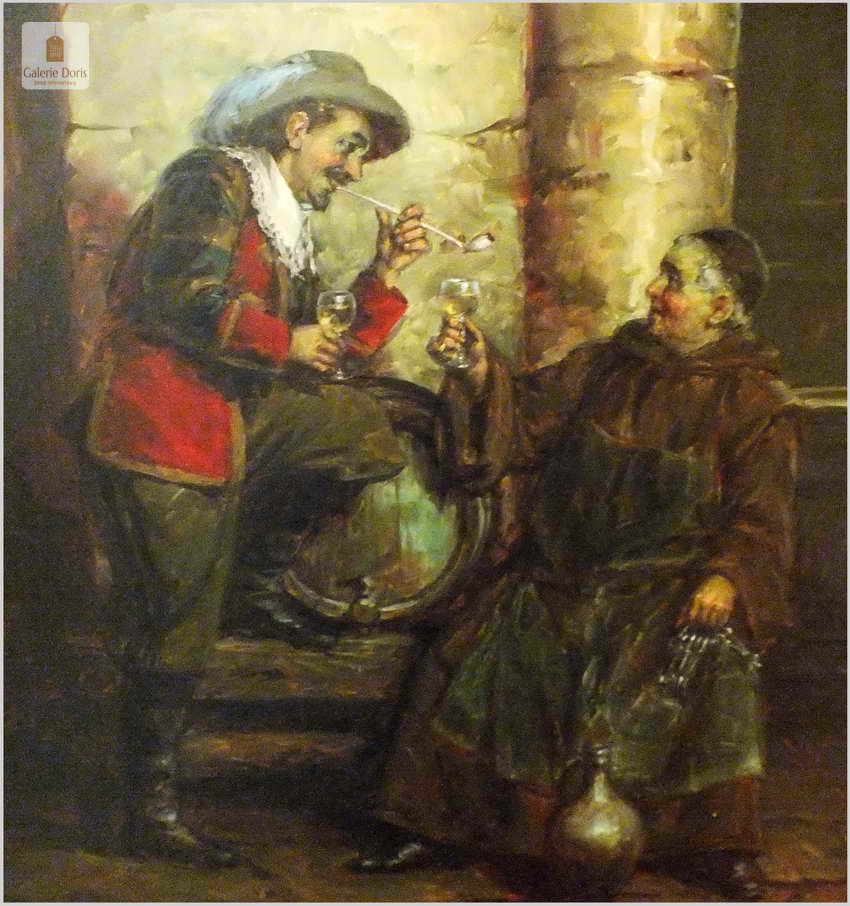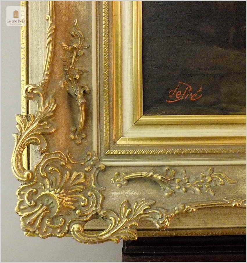 Polecamy stary obraz olejny pędzla znanego malarza niemieckiego Willi DePré. Zachwycająco oddał niesamowicie plastyczność malowanych postaci oraz ich otoczenia, całość podkreślona została finezyjnymi efektami światłocieniowymi a także wyśmienitą grą niuansów barwnych. Ten subtelnie malowany obraz cechuje znakomita technika malarska. Obraz bezpośrednio nawiązuje do dzieła XVII-wiecznego malarstwa. Oprawę malowidła stanowi przestrzenna, gruba rama wykonana z drewna. Złoconą ramę bogato dekorują kunsztowne sztukaterie. Obraz sygnowany jest w lewym dolnym rogu ramy. Gwarantujemy profesjonalnie zabezpieczoną przesyłkę kurierem.