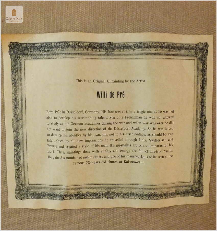 Willi dePré - Malarz niemiecki, urodził się 5 czerwca 1922 roku w rodzinie niemiecko-francuskiej. Ukończył Akademię Sztuki w Düsseldorfie, na kierunku malarstwo. Szybko zyskał sławę poza granicami Niemiec. Na początku swojej kariery miał wizję impresjonizmu, która była postrzegana przez wszystkich jako non plus ultra. Głęboko religijny, skłonny do malowania historycznych tematów. Malował dla Katedry w Düsseldorf. Prace życia klasztornego, które można zobaczyć na wielu jego obrazach oraz wystawach ukształtowała się na stałe w jego umyśle. Po II-wojnie światowej Willi de Pre, wrócił na ziemię w Dusseldorf-Kaiserwerth, był tu przecież jego dom rodzinny. Tam osiadł z żoną Elli. Willi dePré po II wojnie światowej był głównie portrecistą ale z portretów wykonanych tuż po wojnie, nie zachowało się wiele prac. Malował, portretował i w ten sposób zarabiał na chleb. Ponieważ był już na tyle znany w świecie sztuki, Galeria van Wagening na Königsallee w Düsseldorfie, wzięła go do swojej ekskluzywnej galerii w ramach umowy. To od tamtego czasu Willi de Pré malował na większą skalę. Jego Próby wina, mnisi i chryzantemy pojawiły się na wielu jego obrazach. Nie mógł malować na tyle szybko, aby sprostać z popytem jego dzieł, natomiast Galeria z którą miał podpisany kontrakt narzuciła temat portretów cyganek. Zasada jego była prosta, że nie kopiuje. Dlatego wszystkie Cyganki mają własny urok i każdy obraz jest inny. Ostatecznie po 8 latach zakończył kontrakt z Galerią. Teraz Willi dePré może skupić się na innych tematach. Jego miłością była historia, a zwłaszcza kąty starego miasta w Düsseldorfie. Willi de Pré był malarzem, który objawiał miłość paru koloru w swoich pracach. Przeważnie gruntował swoje płótna czerwonym podkładem, co uwidocznione było sygnaturą malarza. Jego prace kształtowała szczególna wyrazistość, był mistrzem światła i cieni. W grudniu 1995, Willi de Pré umiera w swoim rodzinnym domu w Dusseldorf-Kaiserwerth, ale z pewnością pozostanie poprzez swoje obrazy zawsze obecny.