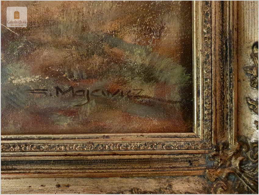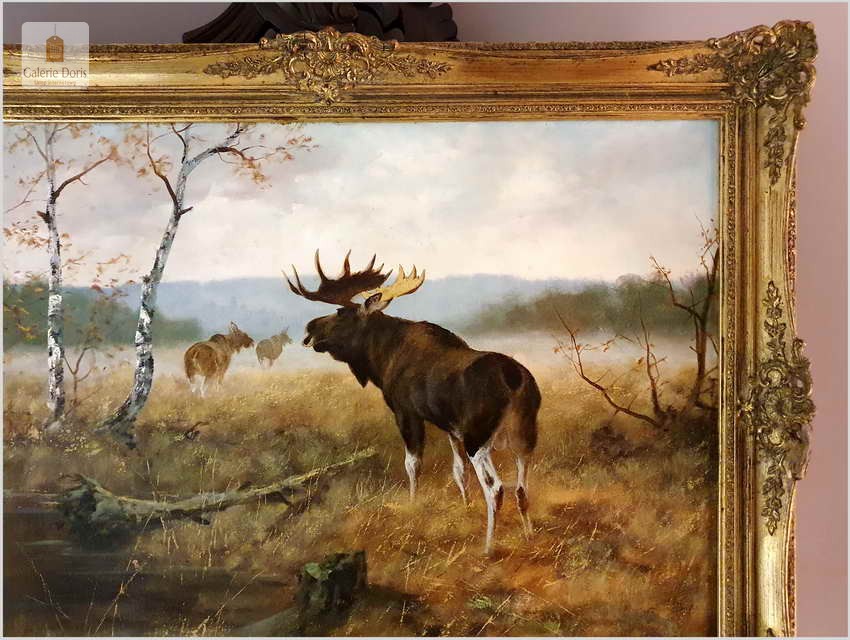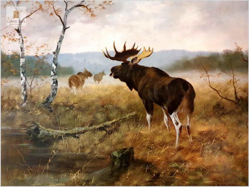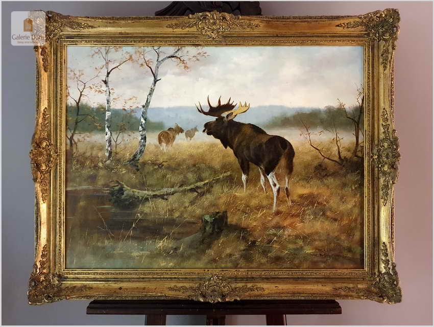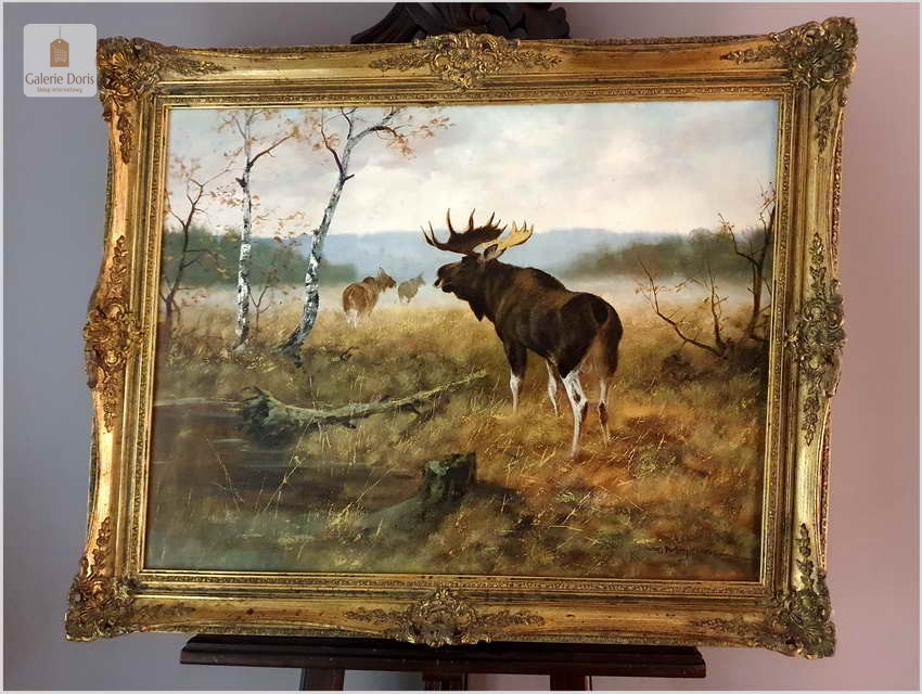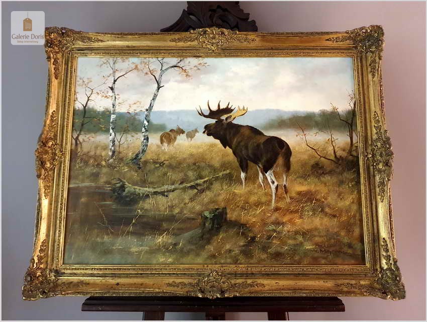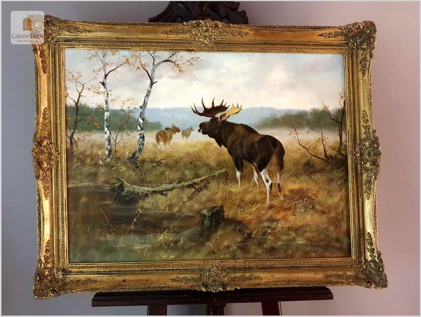 Bardzo dobra praca malarska. Obraz odznacza się dobrą perspektywą oraz wysmakowaną grą barw palety kolorystycznej. Oryginalny obraz olejny pędzla Georga Majewicza. W roli pierwszoplanowej dostojny łoś. Zwierzę to jest największy przedstawiciel rodziny jeleniowatych na świecie. Samiec łosia to byk, samica - klępa (czasami: łosza), a młode nazywamy cielakami lub łoszakami. Poroże łosia (występuje wyłącznie u byków) może mieć kształt łopat, z niewielkimi wyrostkami, lub znacznie bardziej rozgałęzione, palczaste. Przy maksimum swojej wielkości (w okolicach 10 roku życia łosia), jego poroże może ważyć nawet 20 kilogramów! Łosie są z reguły samotnikami. Jedynie samice z młodymi na zimę mogą się zbierać w niewielkie grupy, ale samce cały rok żyją samotnie i dołączają do klęp jedynie na czas rui. Te wielkie zwierzęta nie są płochliwe. W przeciwieństwie do na przykład saren, które, jeśli się do nich za bardzo zbliżymy, szybko uciekają w bezpieczne miejsce, łosie co najwyżej nieśpiesznie usuną nam się z drogi. Obraz bez uszkodzeń, osadzony w oryginalną starą ramę z okresu w raz z certyfikatem oryginalności, gotowy do powieszenia - Polecamy!